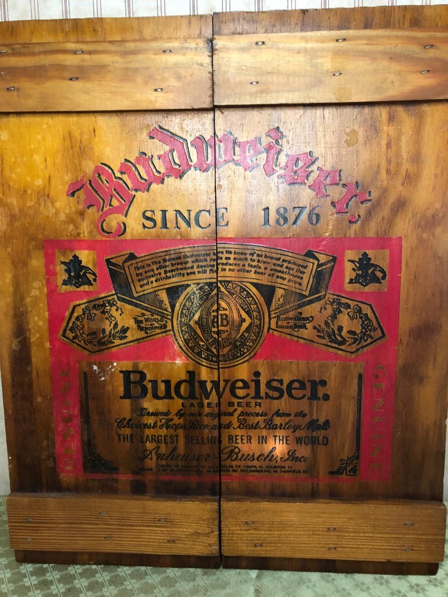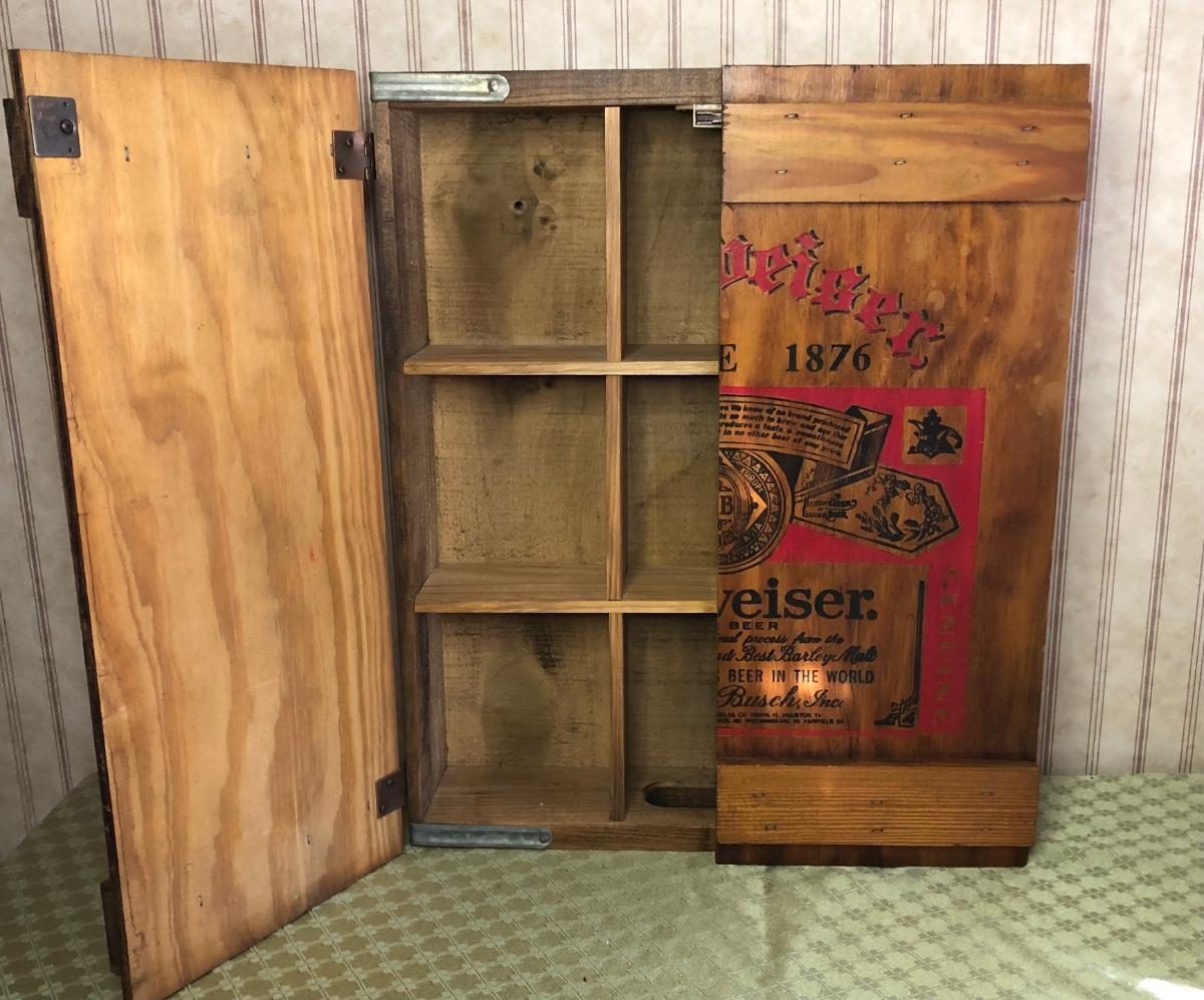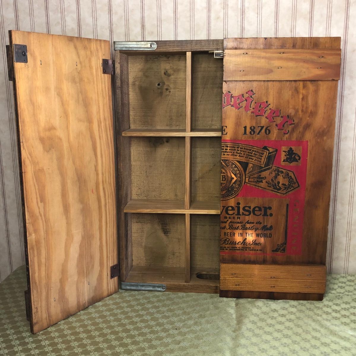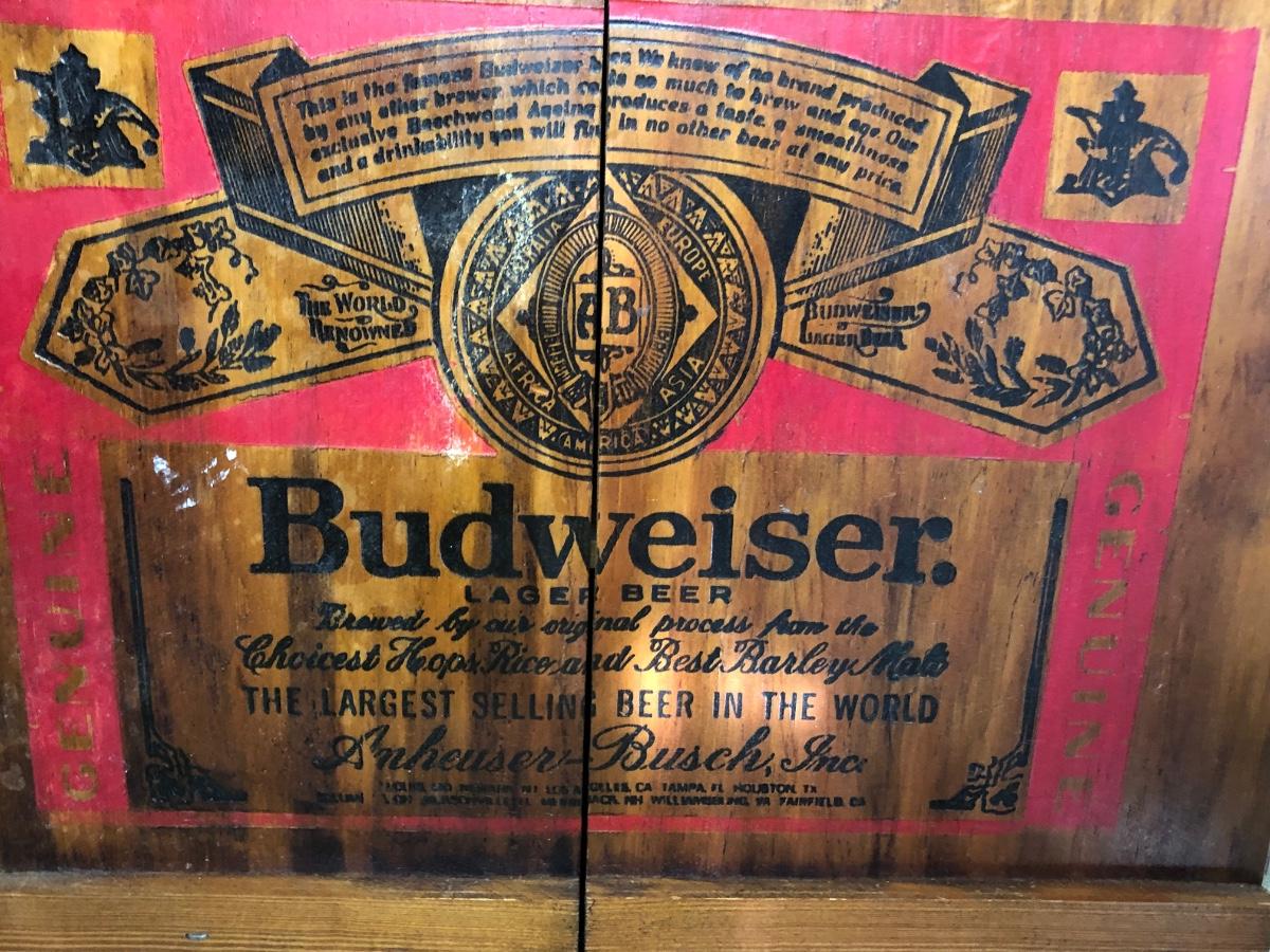 One wooden Budweiser branded cabinet with nine boxes inside. Measures 15.5W x 4D x 19H.