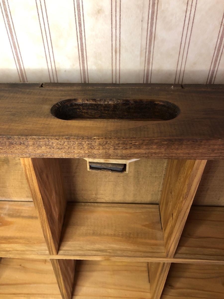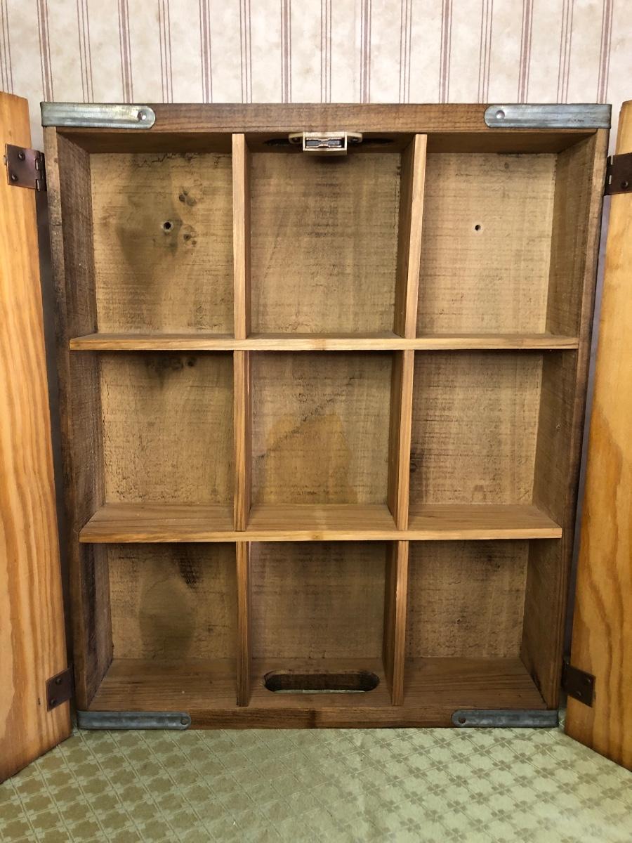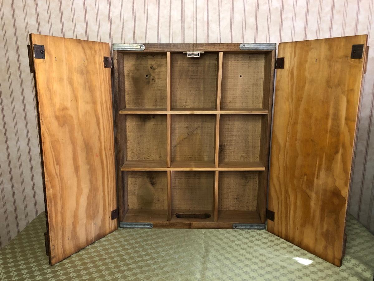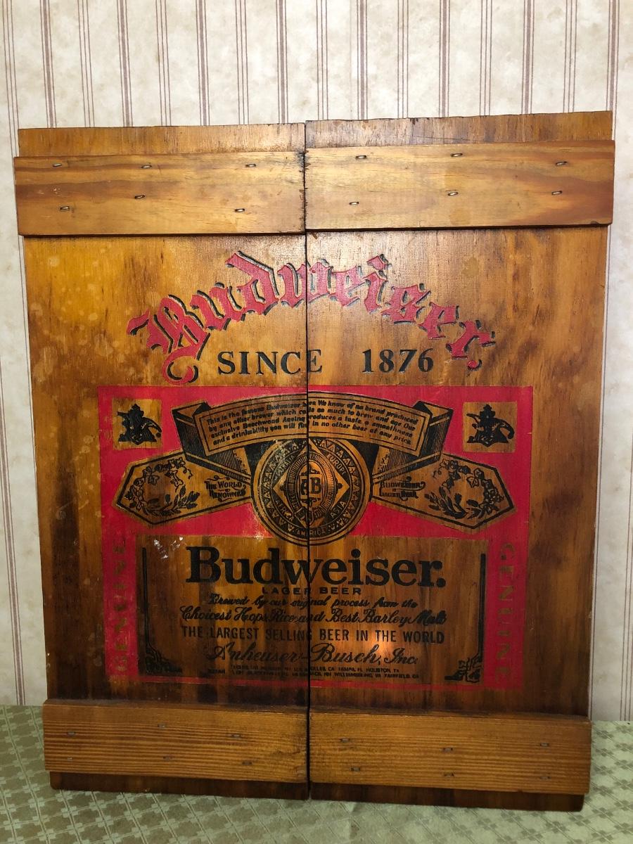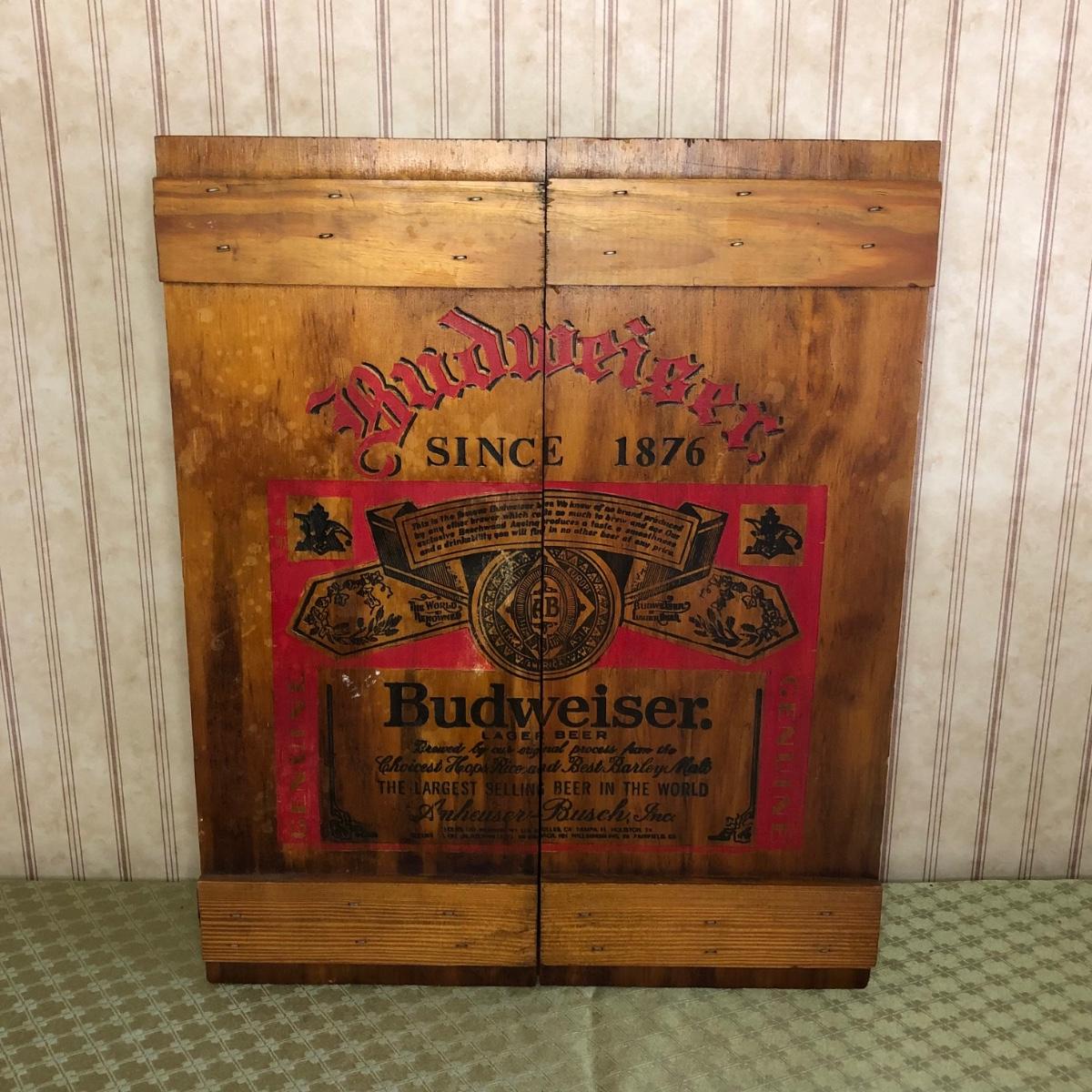 One wooden Budweiser branded cabinet with nine boxes inside. Measures 15.5W x 4D x 19H.