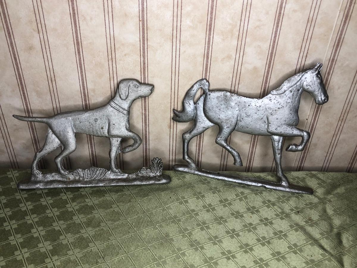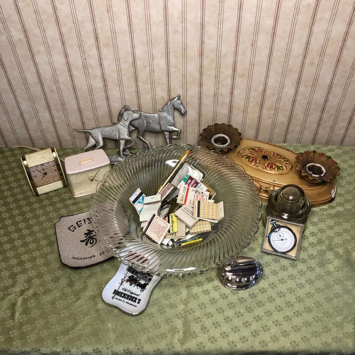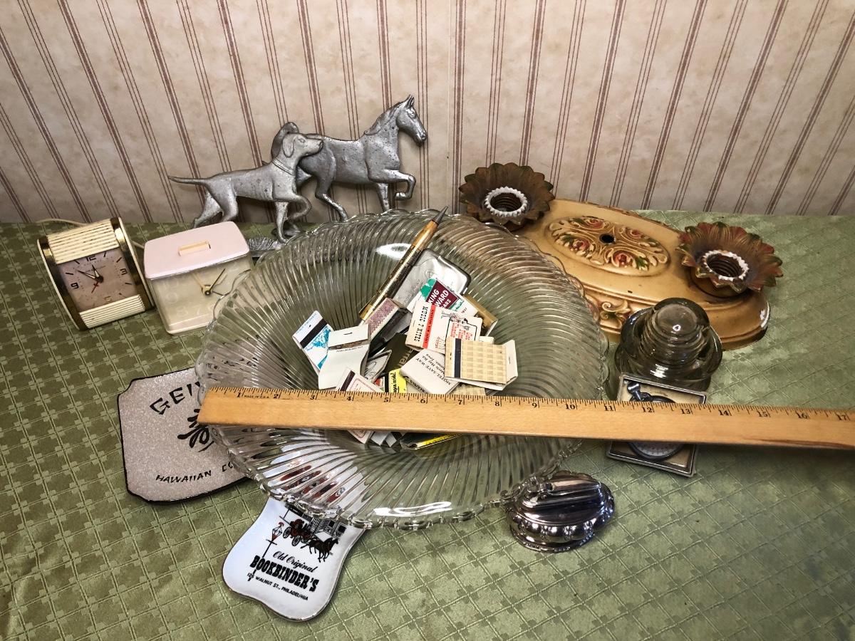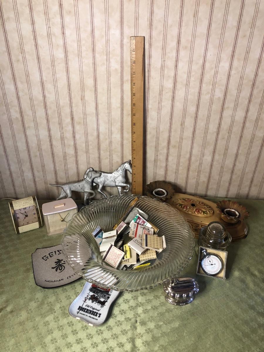 Includes 2 small clocks (untested), a sconce, a pocket watch, a Ronson ligher, a cut glass bowl, horse and dog decor, two ash trays and a collection of vintage match books.