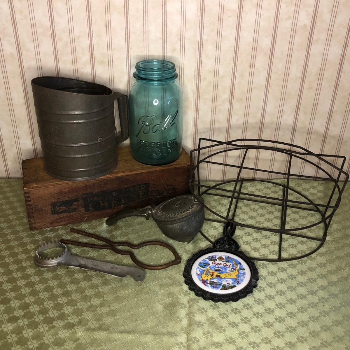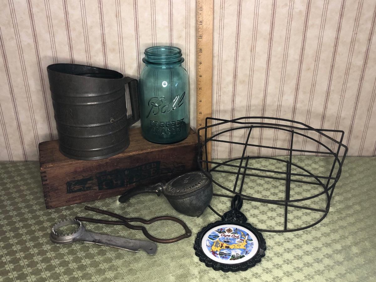 Includes a wooden cheese box, sifter, trivet, snow cone maker, mason jar and canning rack.