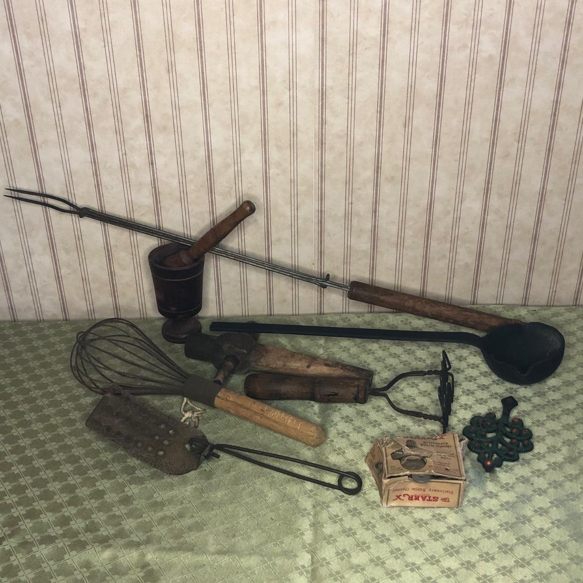 Includes a wooden mortar and pestle, an auto flipping spatula, whisk, masher, spout, cast iron ladle, Pepsi branded bottle opener, and small trivet.