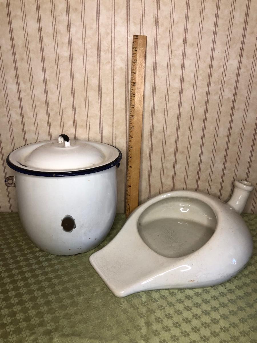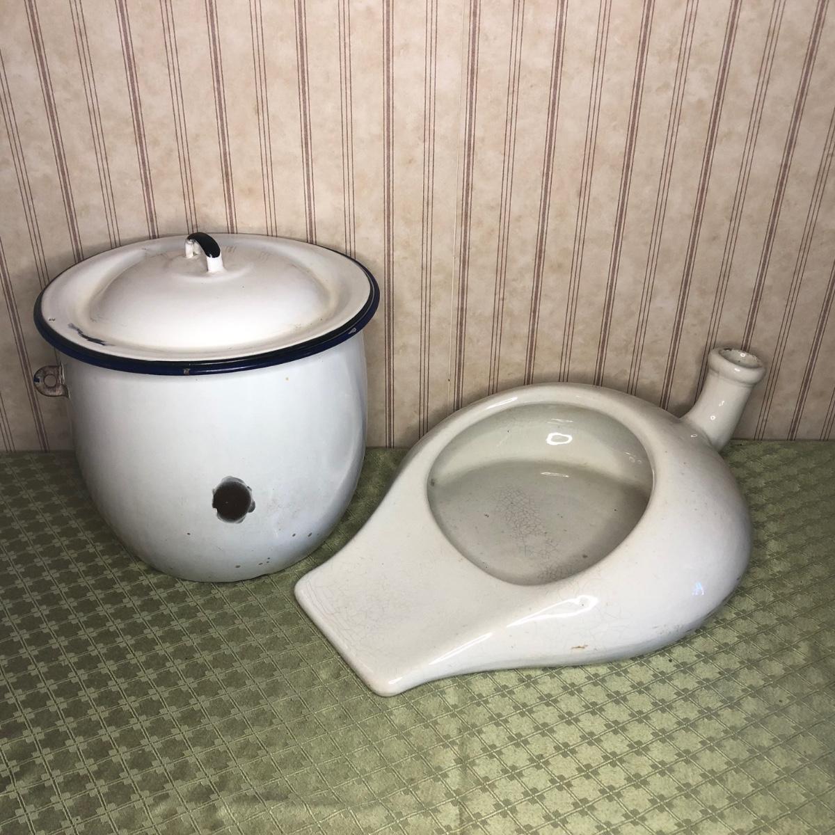 Includes chamber pot with lid and vintage porcelain bedpan/urinal.