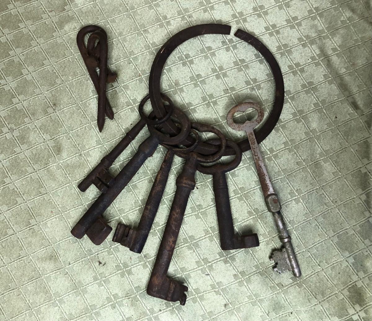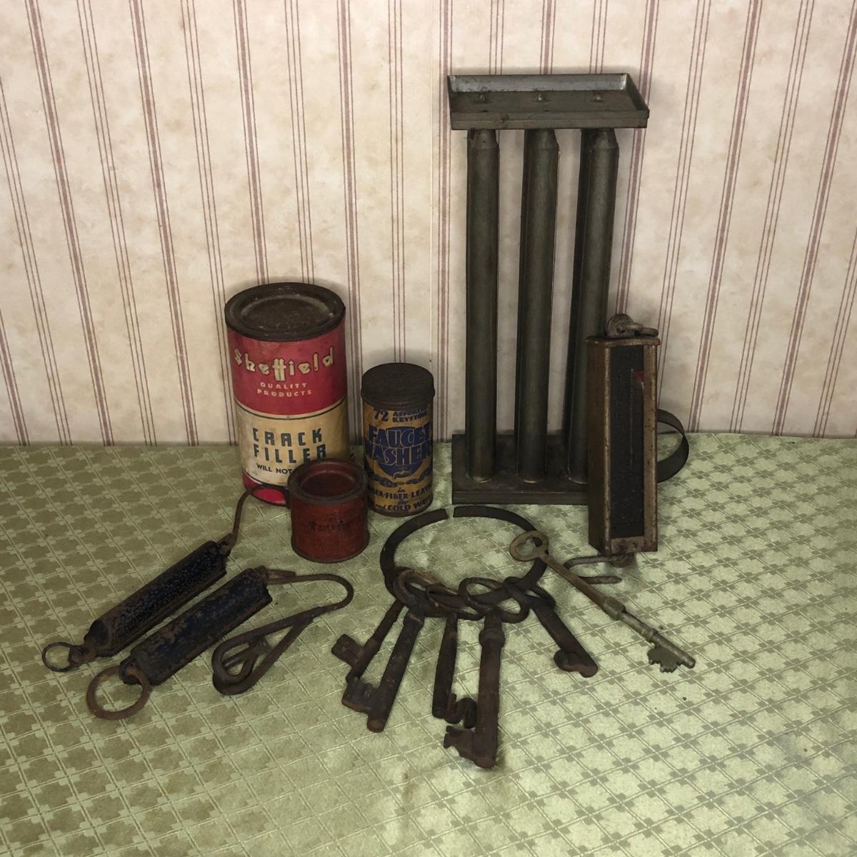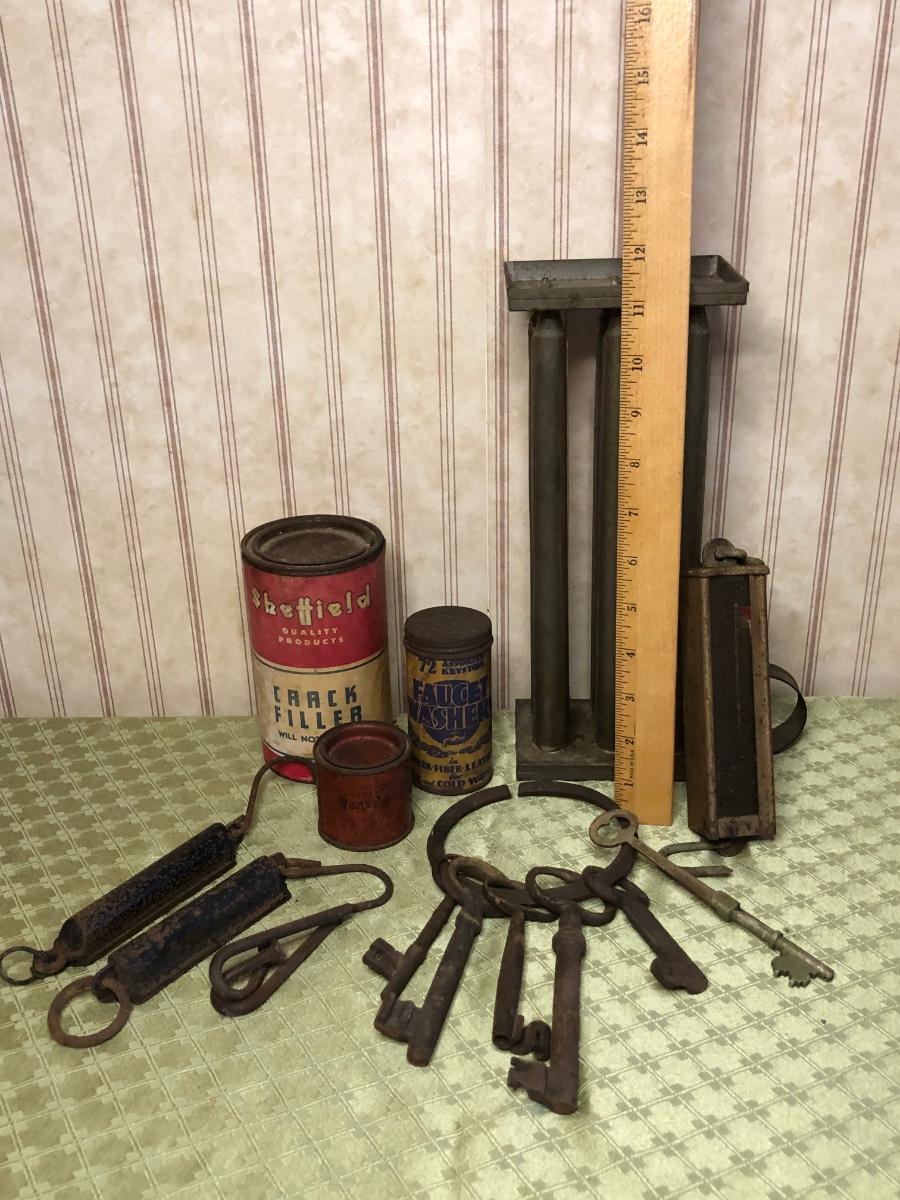 Includes canisters of Sheffield Crack Filler, Faucet Washers, and Bib Screws. Also includes a key ring, three hanging scales and a candle mold.