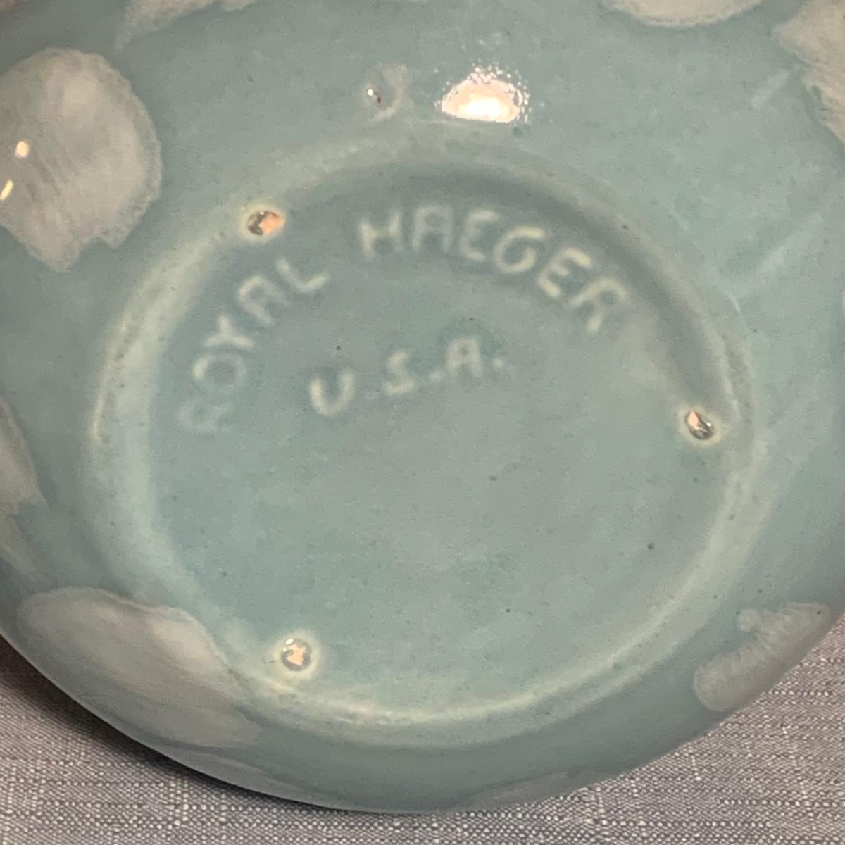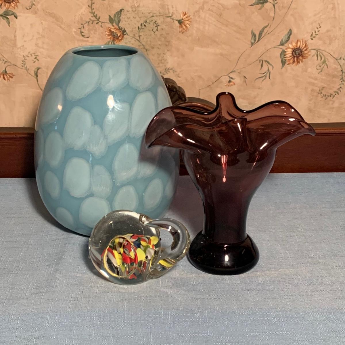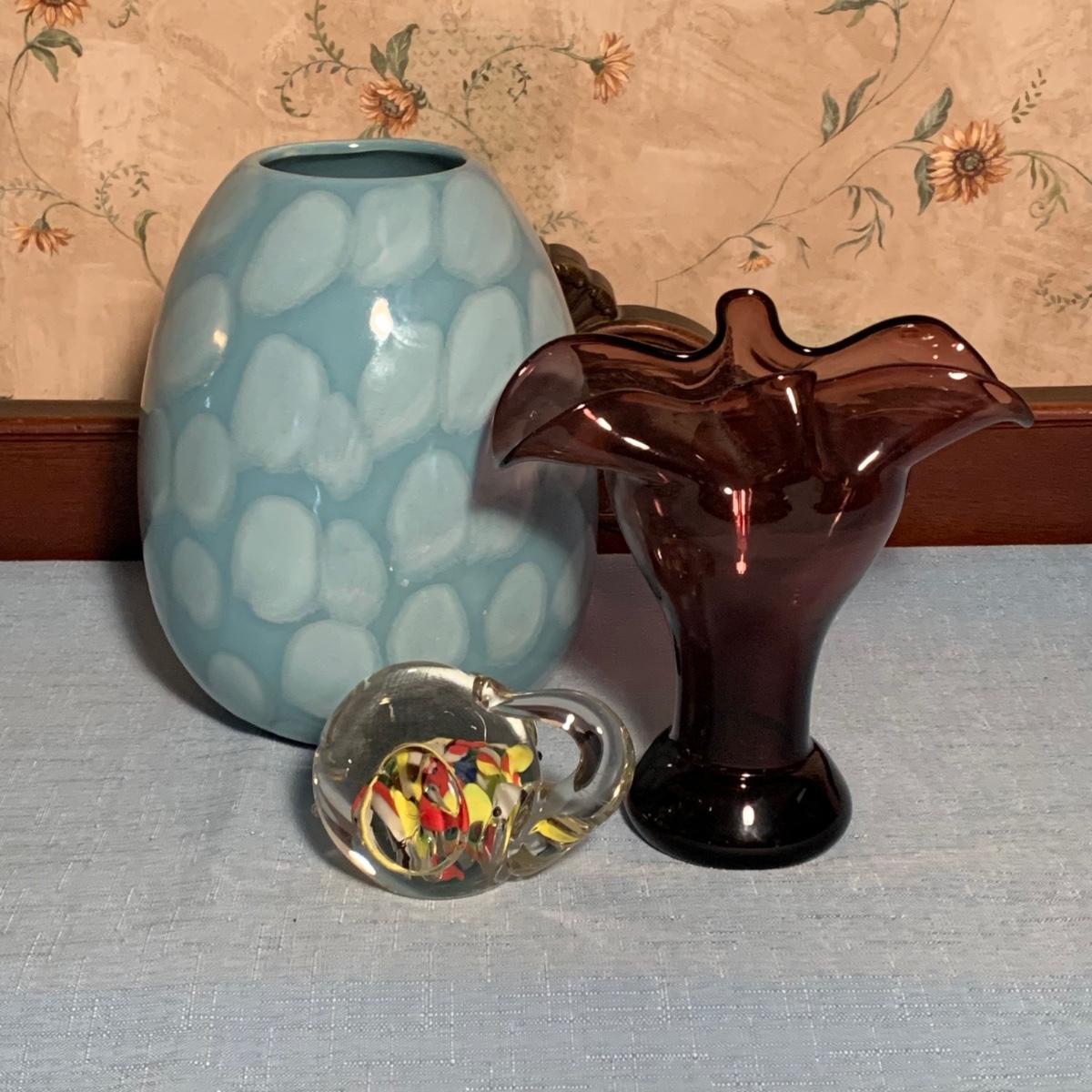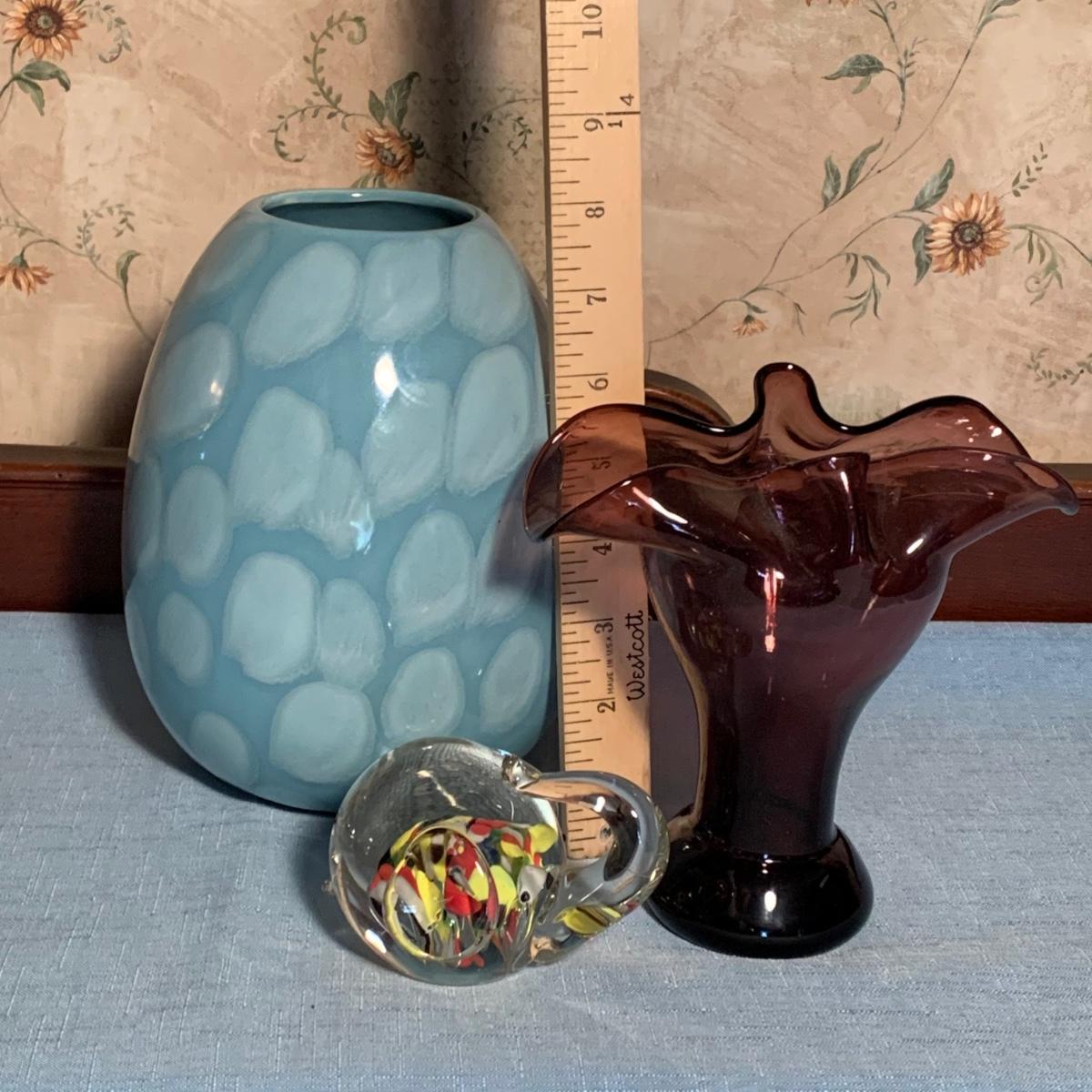 LOT 217R: Royal Haeger Vase in "Cloudy Blue", Amethyst Hand Blown Vase & Whale Paper Weight