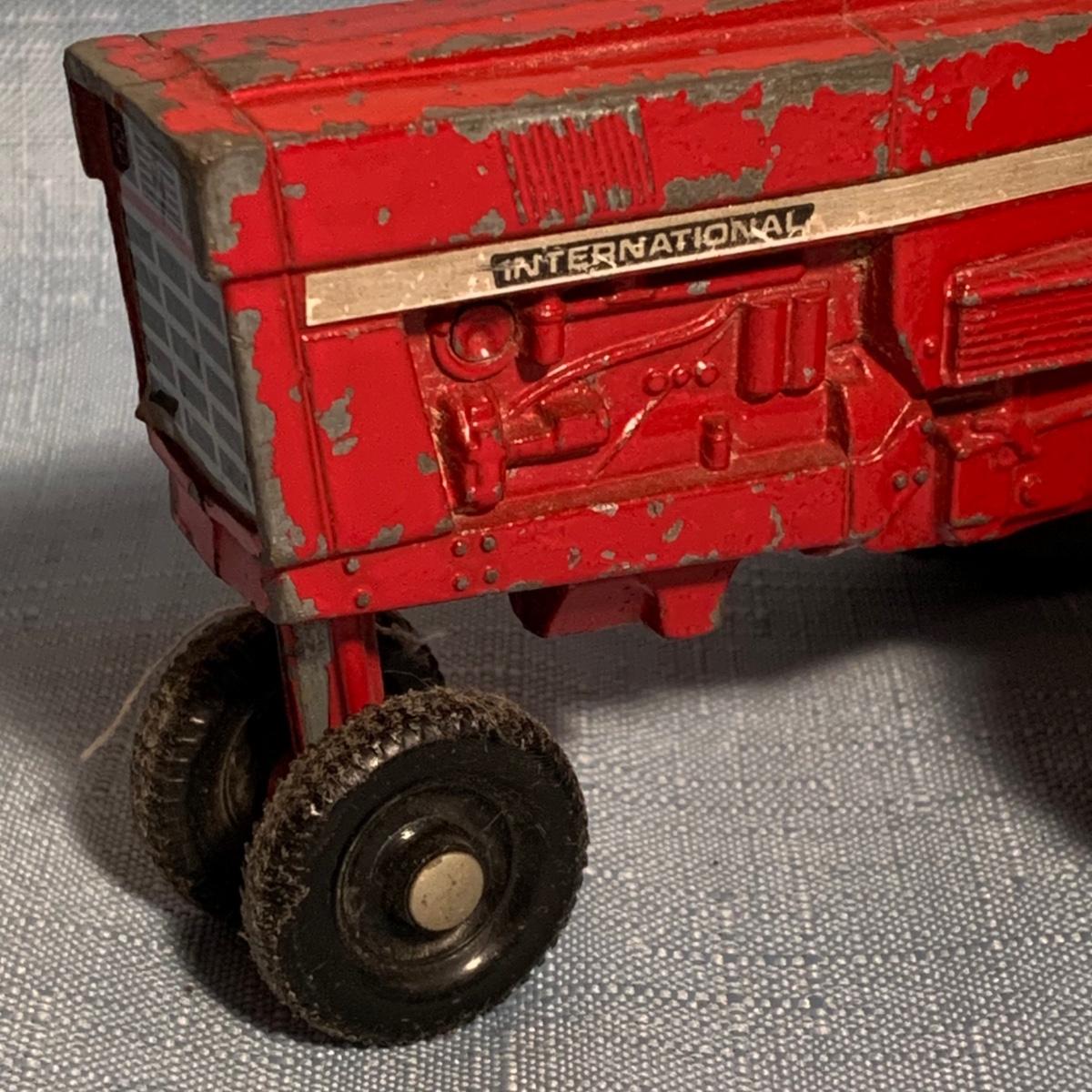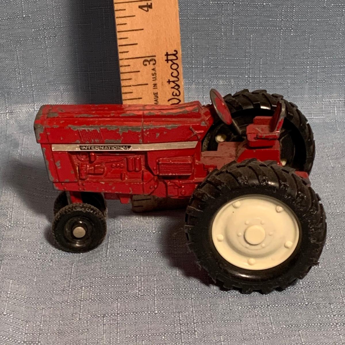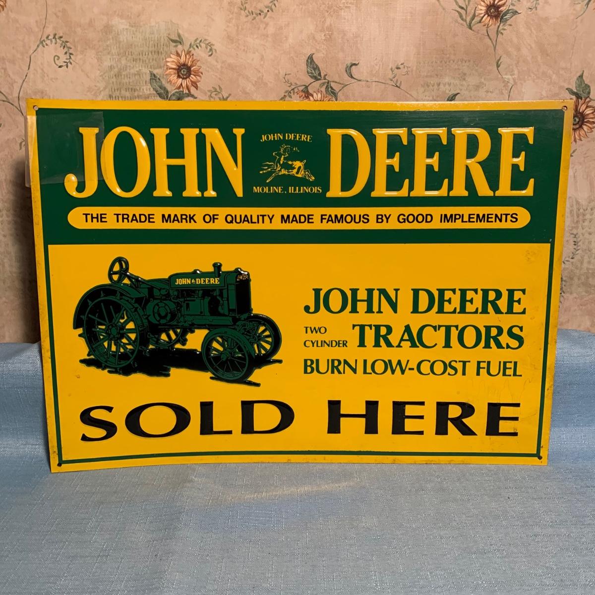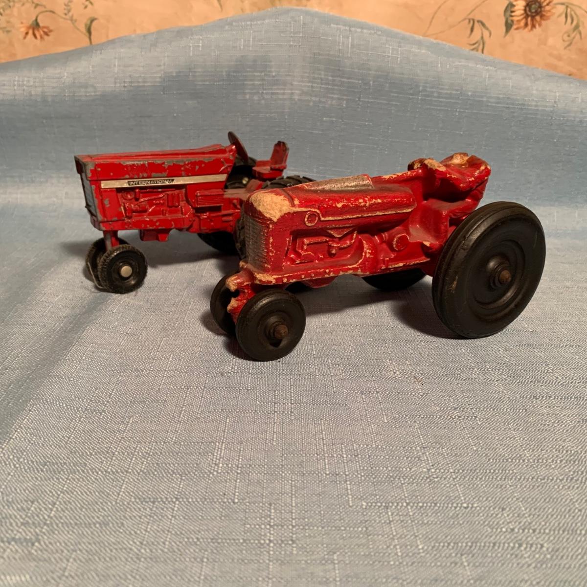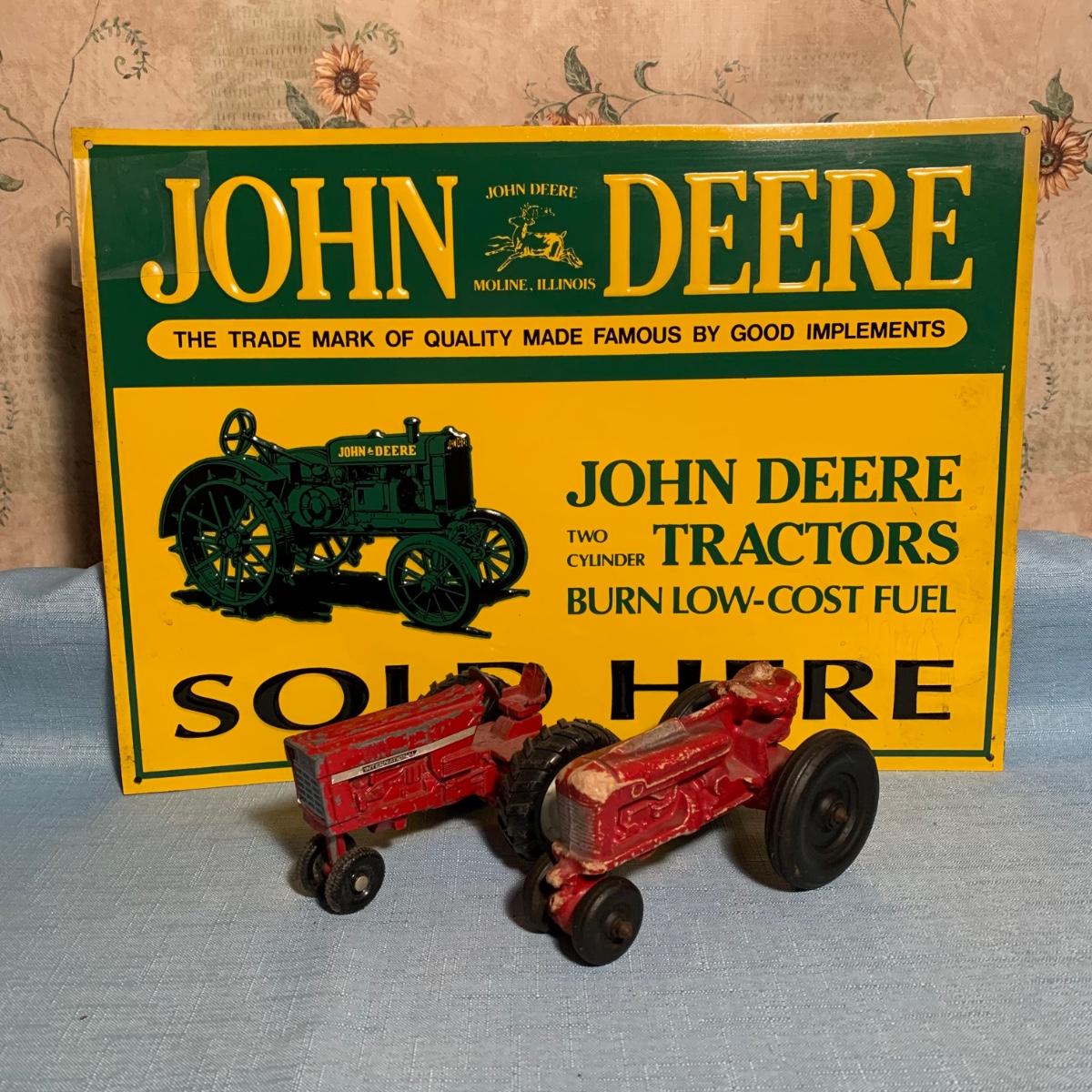 LOT 221R: Vintage Toy Tractors: International Ertl & Farmall w/Rubber Wheels & Reproduction John Deer Sign