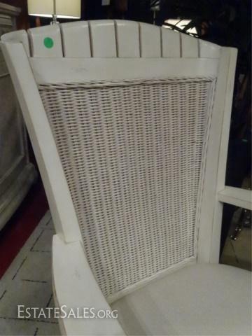 LOT 83A: 7 PC ROBB AND STUCKY DINING SET, TROPICAL WHITE FINISH, LIGHTLY DISTRESSED, SCALLOP EDGE DINING TABLE WITH LEAF AND 6 CHAIRS (2 ARM CHAIRS, 4 SIDECHAIRS, TABLE HAS LEAF AND 2 DRAWERS IN BASE, CHAIRS HAVE RATTAN BACKS, LABELED ROBB & STUCKY, VERY GOOD CONDITION, 56" ROUND EXTENDS TO 75"W, 30.5"H, SKU007.02