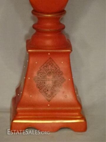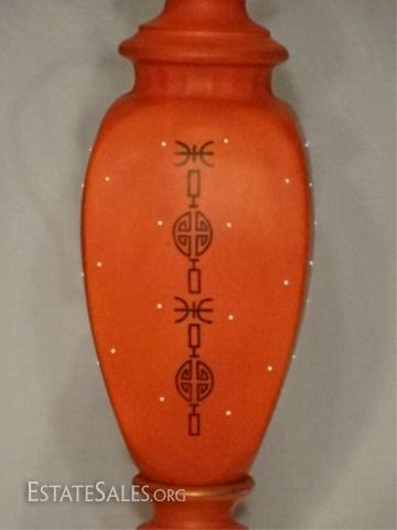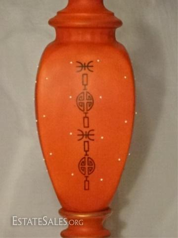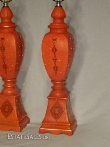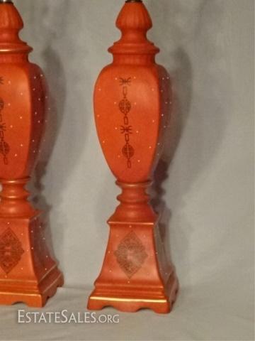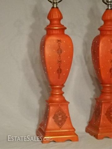 LOT 83A: PAIR MID CENTURY CERAMIC LAMPS, TANGERINE ORANGE GLAZE WITH PAINTED ACCENTS, VERY GOOD CONDITION, 35"H, SKU387.53