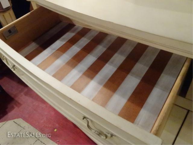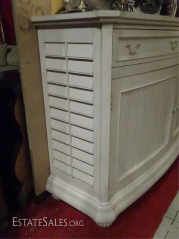 LOT 83B: ROBB AND STUCKY SIDEBOARD, TROPICAL WHITE FINISH, LIGHTLY DISTRESSED, LOUVERED SIDES, 2 DRAWERS OVER 2 DOOR CABINET, DRAWERS AND DOORS HAVE PAINTED STRIPED FINISH, VERY GOOD CONDITION, 68"W X 44"H X 21"D, SKU007.02