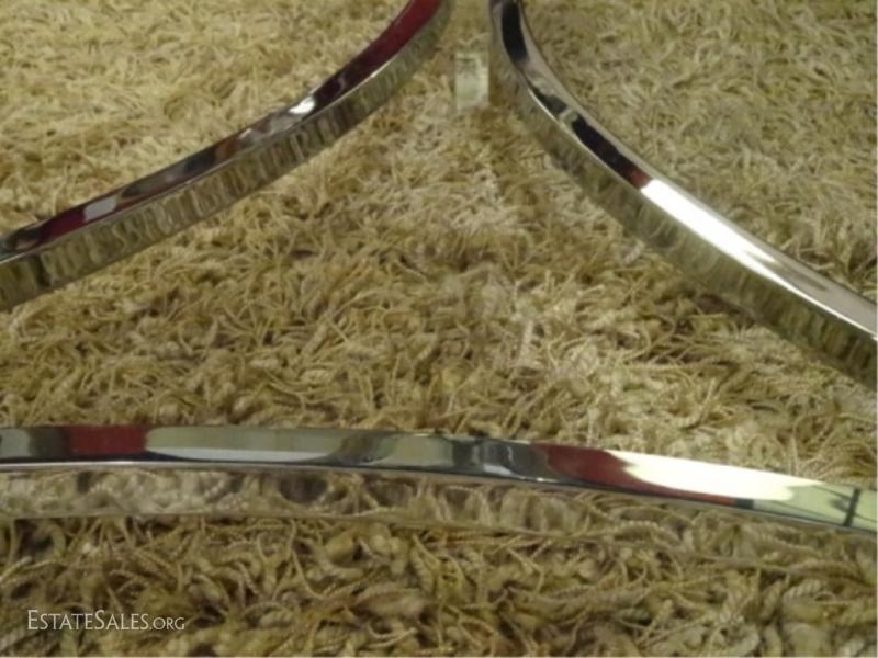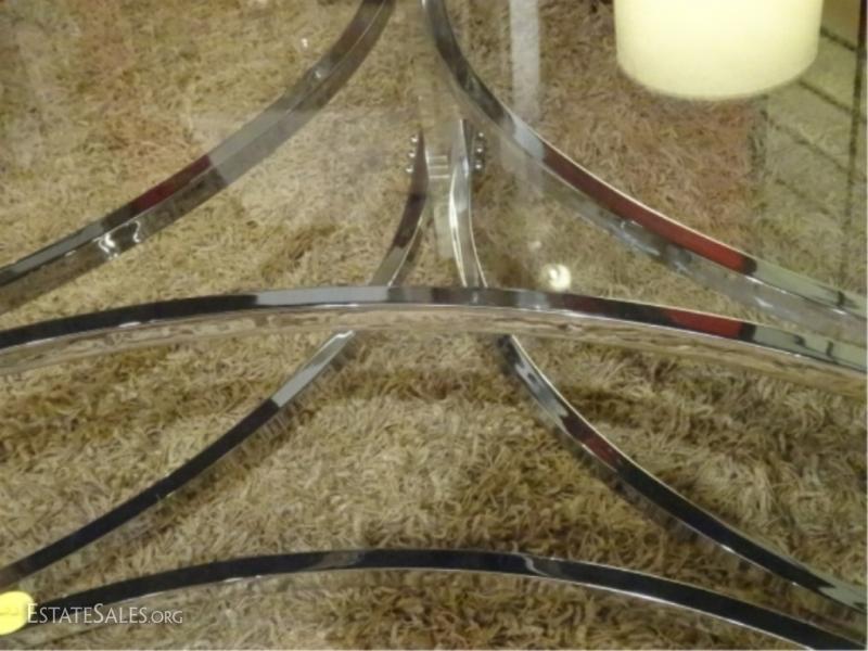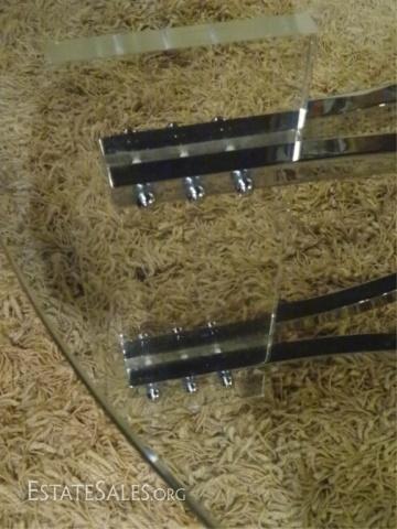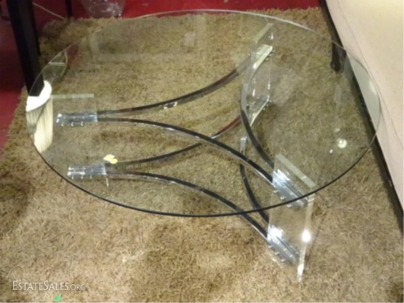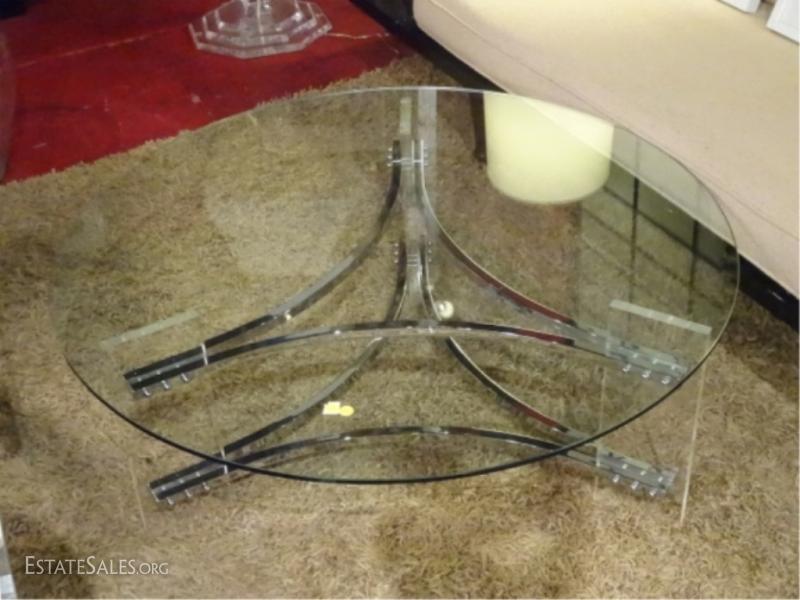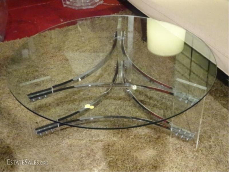 LOT 83D: MODERN LUCITE AND CHROME COFFEE TABLE, CHROME TRIANGULAR BASE WITH LUCITE LEGS, ROUND GLASS TOP, VERY GOOD CONDITION WITH NO PITTING, LUCITE IS CLEAR WITH NO YELLOWING OR CRAZING, SKU6011.01 H225