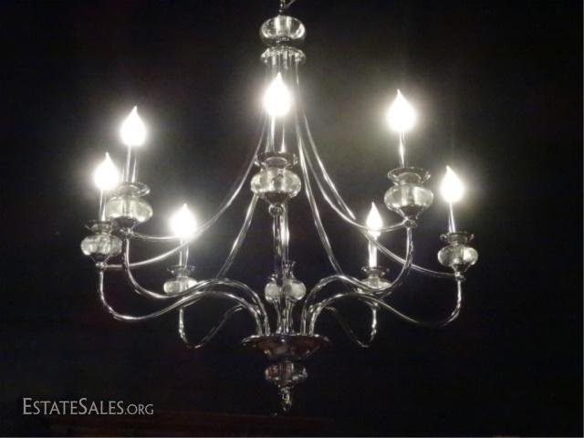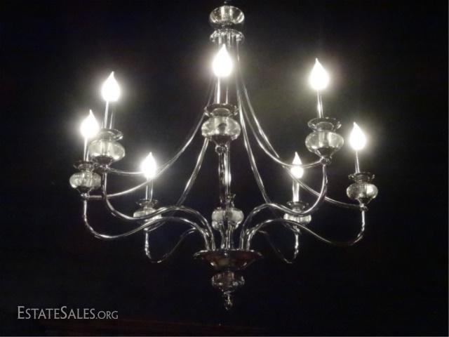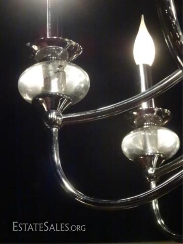 LOT 83E: MODERN CHROME AND ACRYLIC CHANDELIER, 8 LIGHTS, CHROME FRAME WITH CLEAR ACRYLIC ACCENTS, VERY GOOD CONDITION NO PITTING OR WEAR TO CHROME, APPROX 33"H X 30"W, SKU990.02