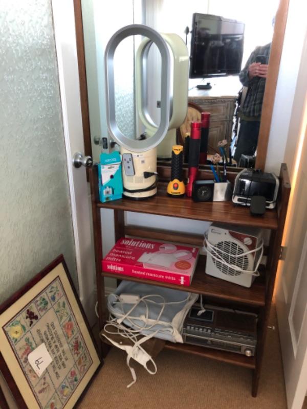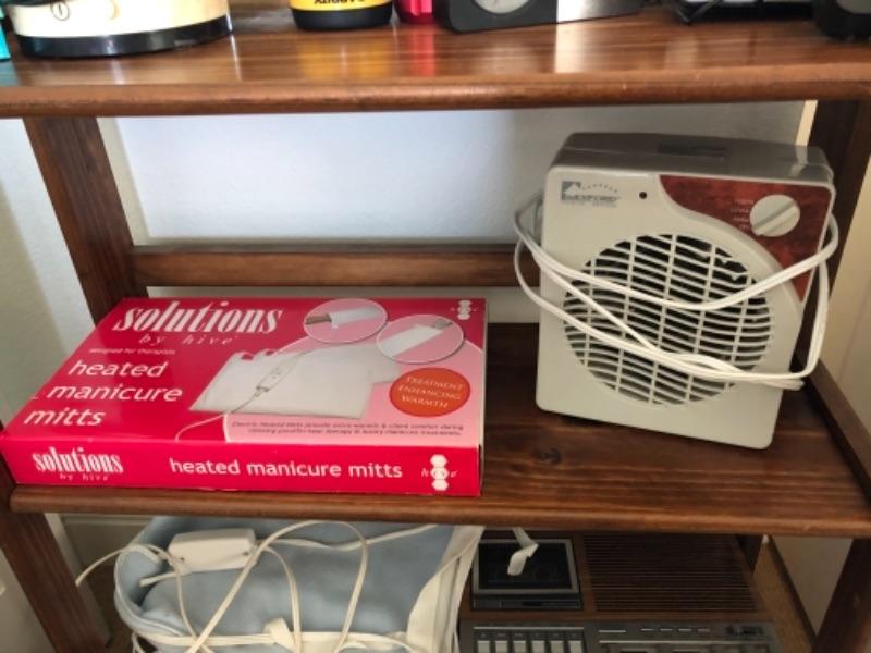 Lot 83U. Heated manicure mitts, electronics, flashlights, tape cassette clock radio, digital alarm clock, fans, travel pillow, heater, heating pad, etc.--$35