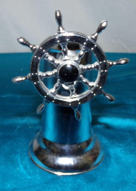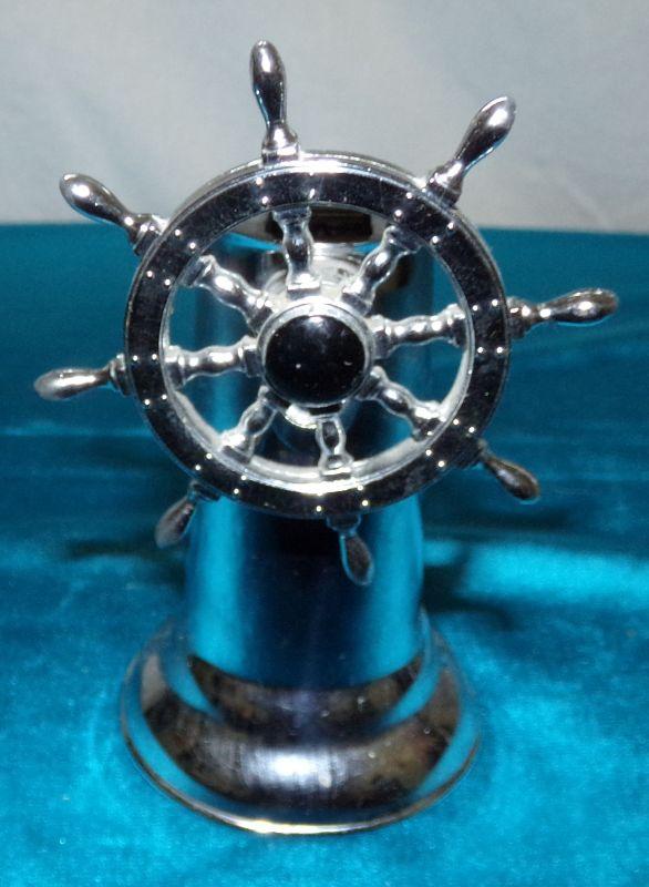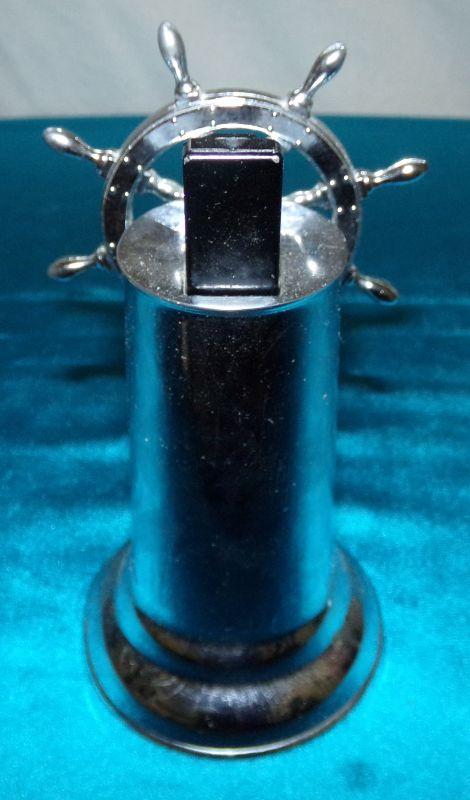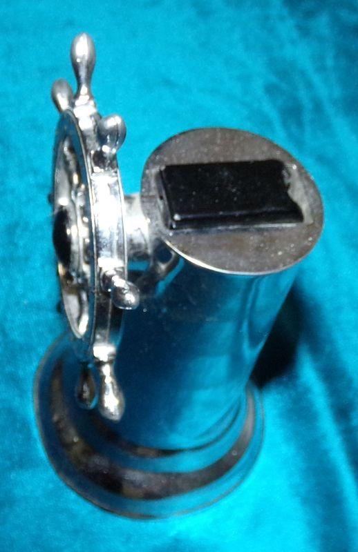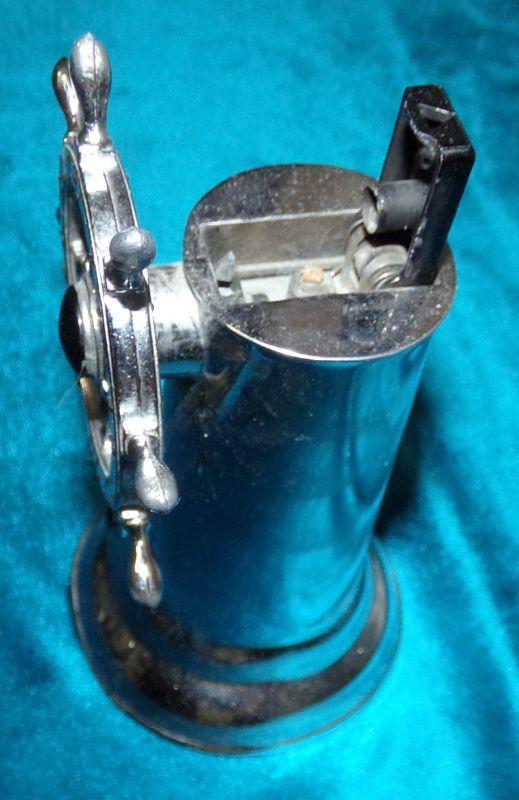 WITH A TURN OF THE SHIP WHEEL THE DOOR FLIES OPEN AND IT THERE WERE FUEL AND A FLINT THIS FINE TABLE LIGHTER WOULD LIGHT