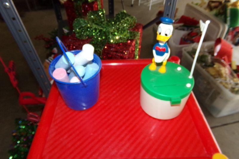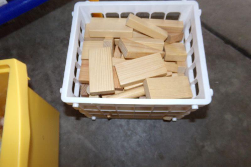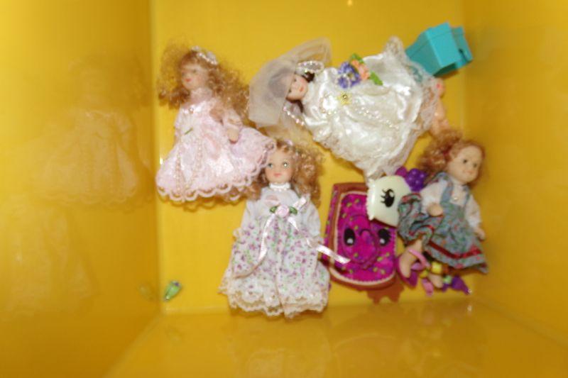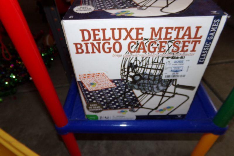 BUILDING BLOCKS, 4 SMALL PORCELAIN DOLLS, CHALK, BINGO CAGE AND MORE
