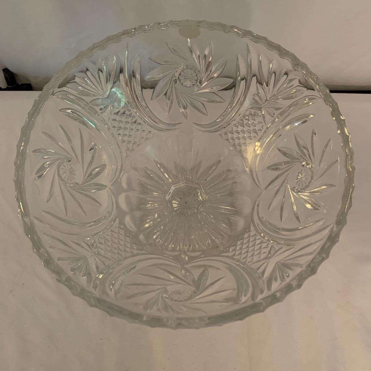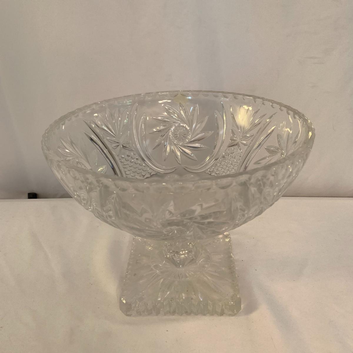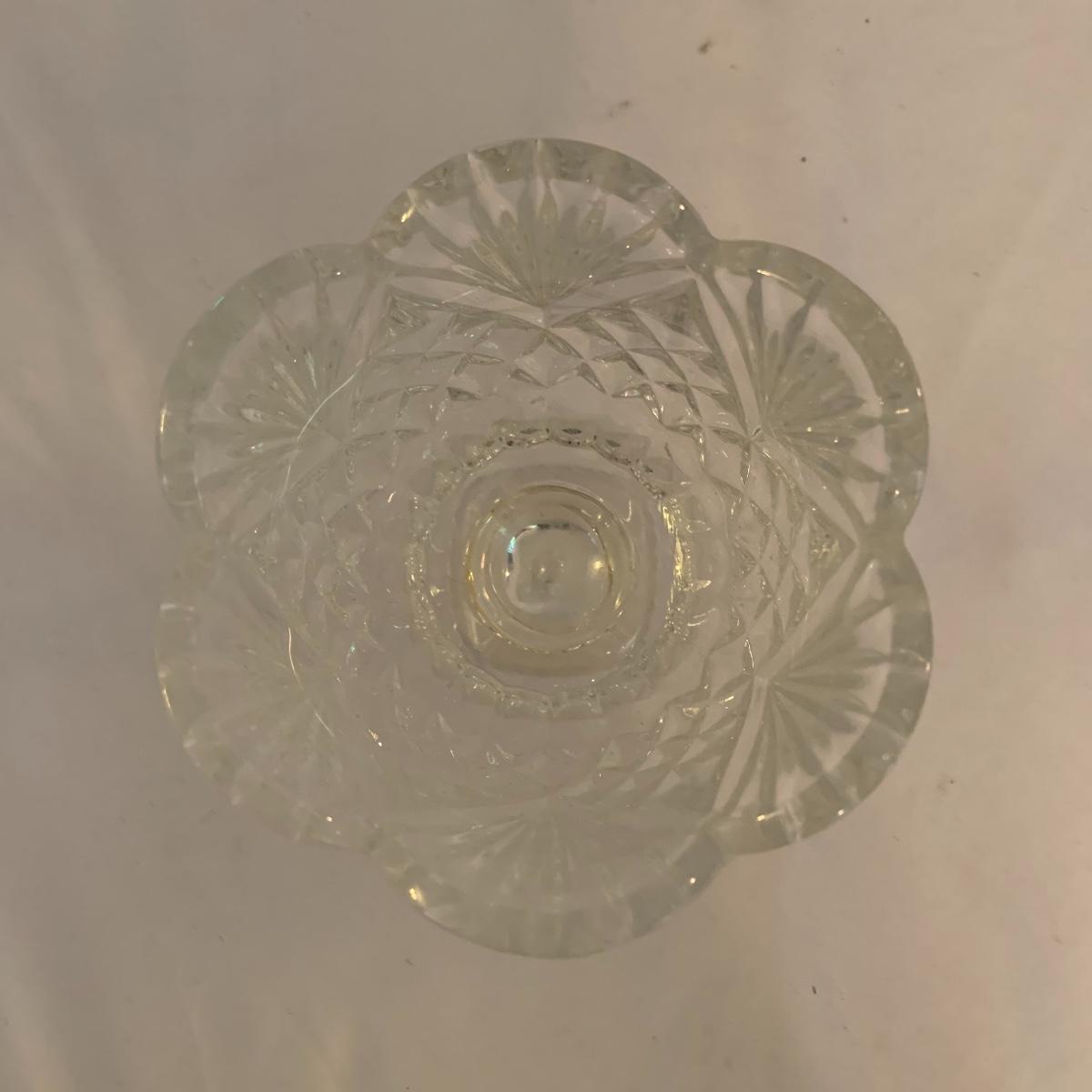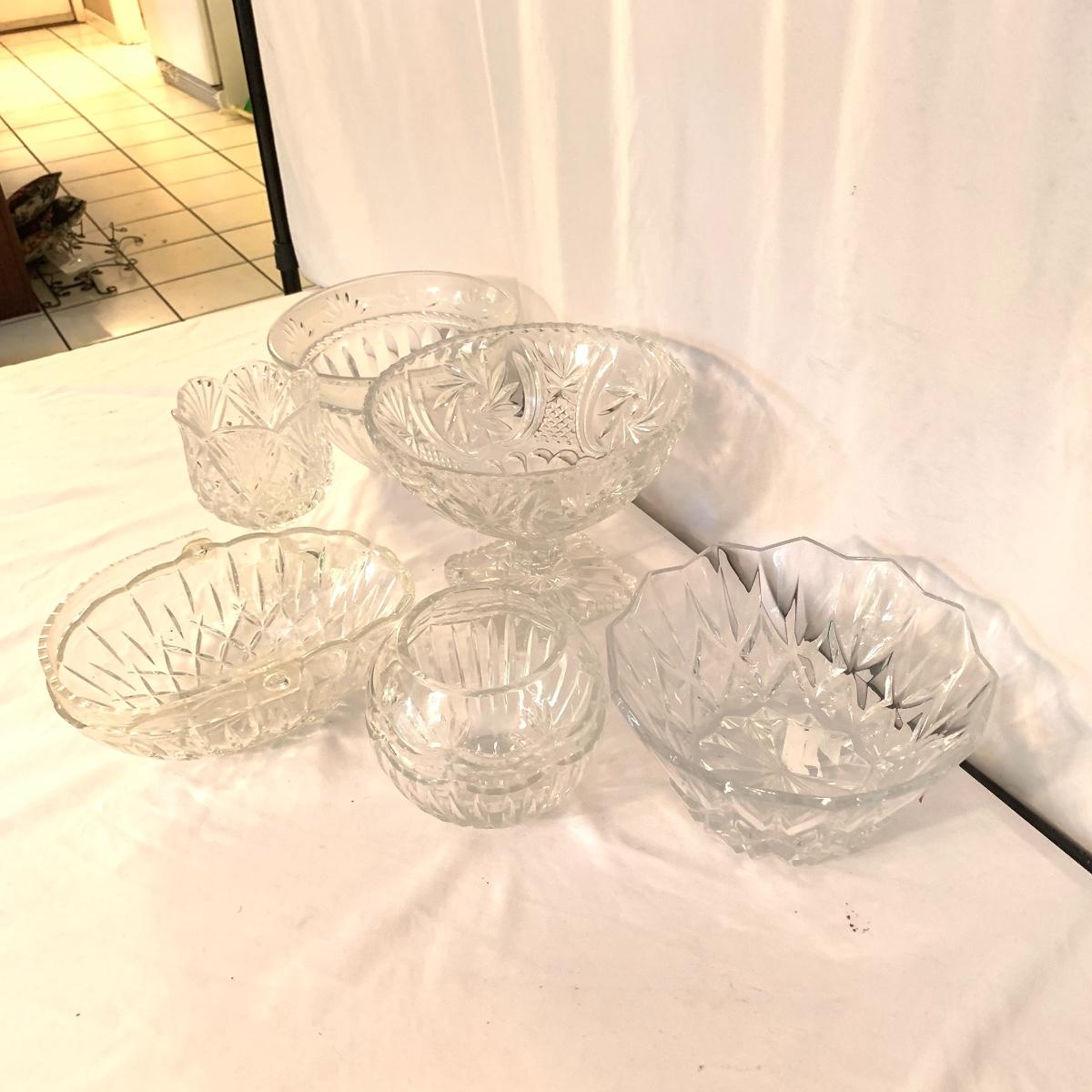 This group of crystal is simply exquisite and nice and heavy! The lot includes a gorgeous pedestal bowl that measures 10” in diameter X 7” tall. Also featured are two bowls, a small round vase, a chalice made by Shannon of Ireland, and a crystal basket with a cute little handle. This crystal is all in good condition, free of chips and cracks.