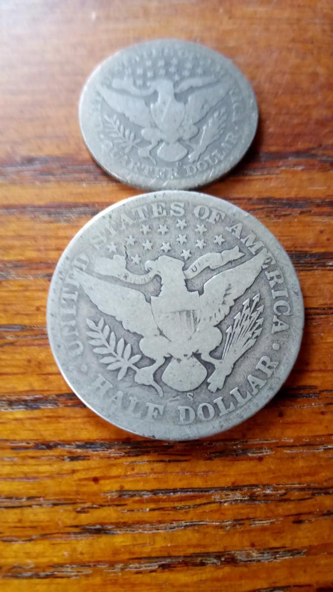 LOT 84   TWO OLD SILVER BARBER COINS (QUARTER AND HALF DOLLAR)