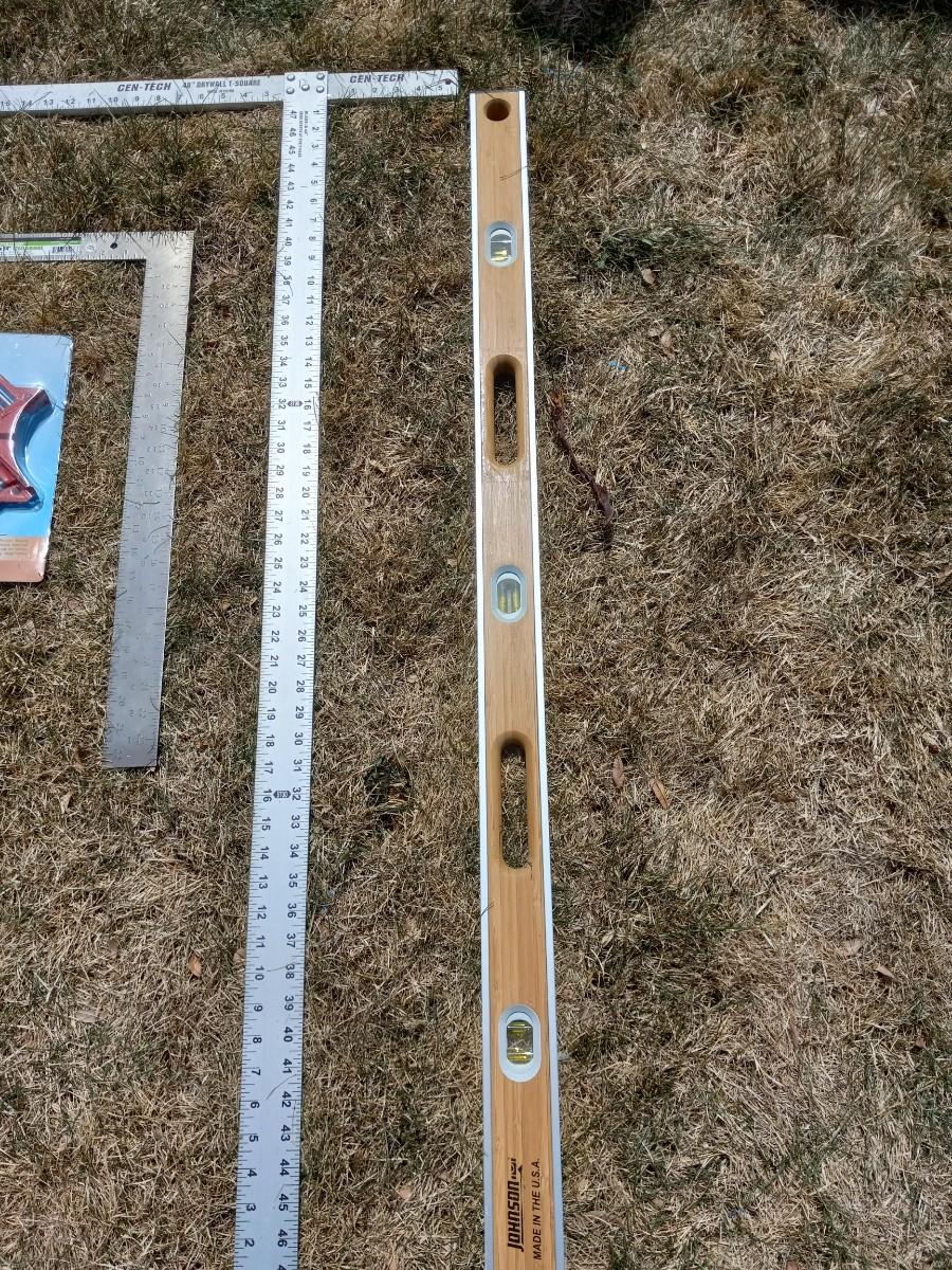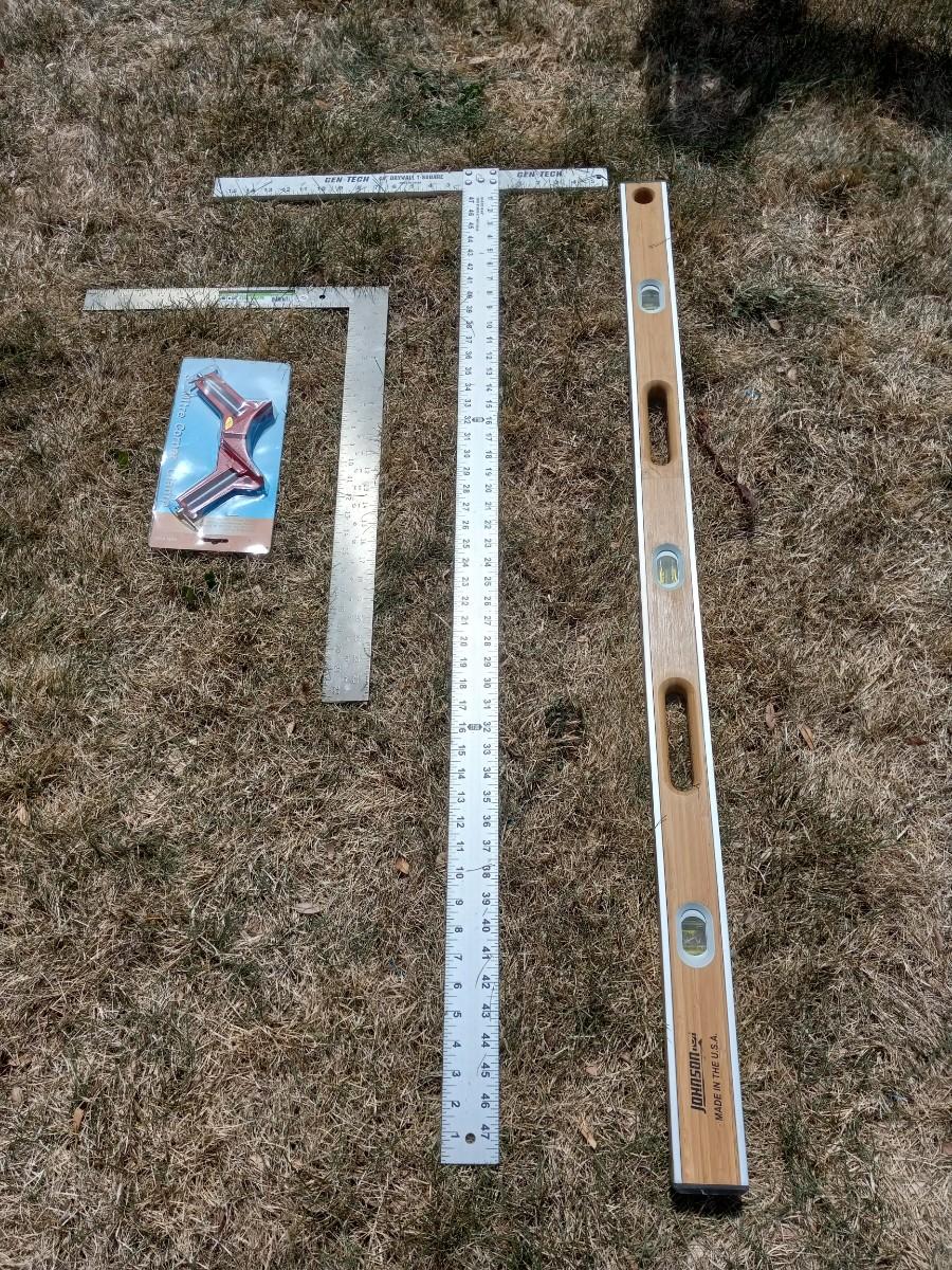WOODEN 48" LEVEL, 48" DRYWALL T SQUARE, STEEL SQUARE AND MITER CORNER CLAMP