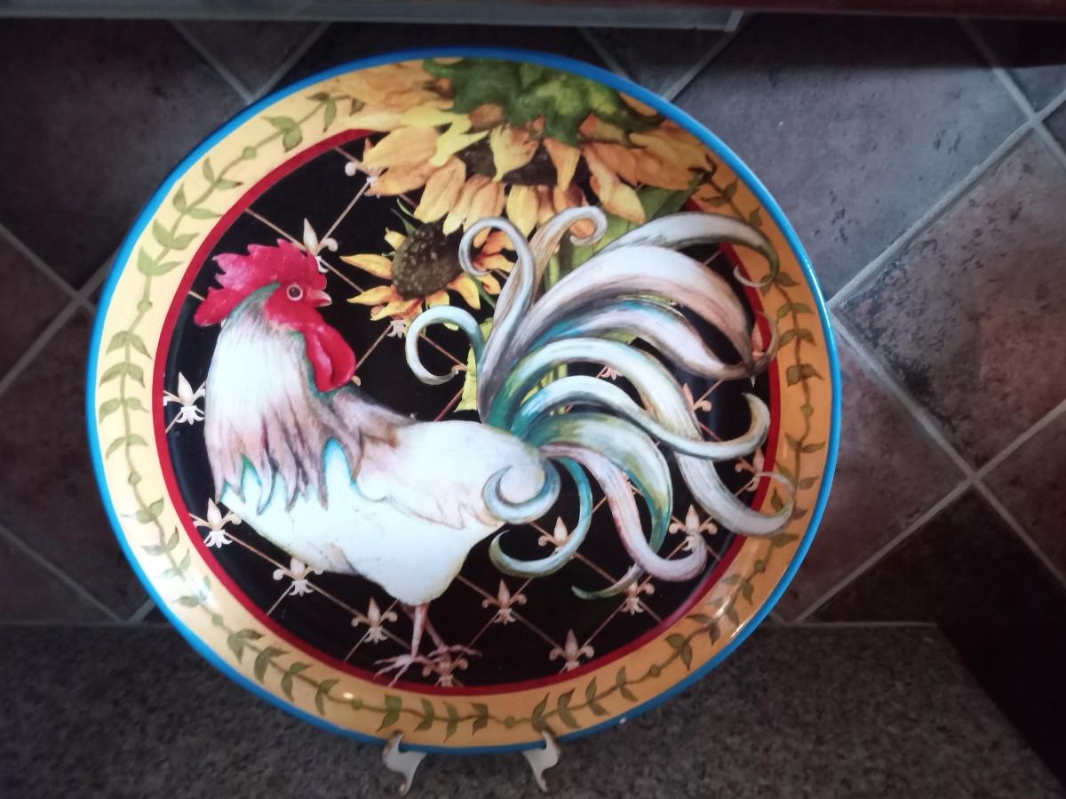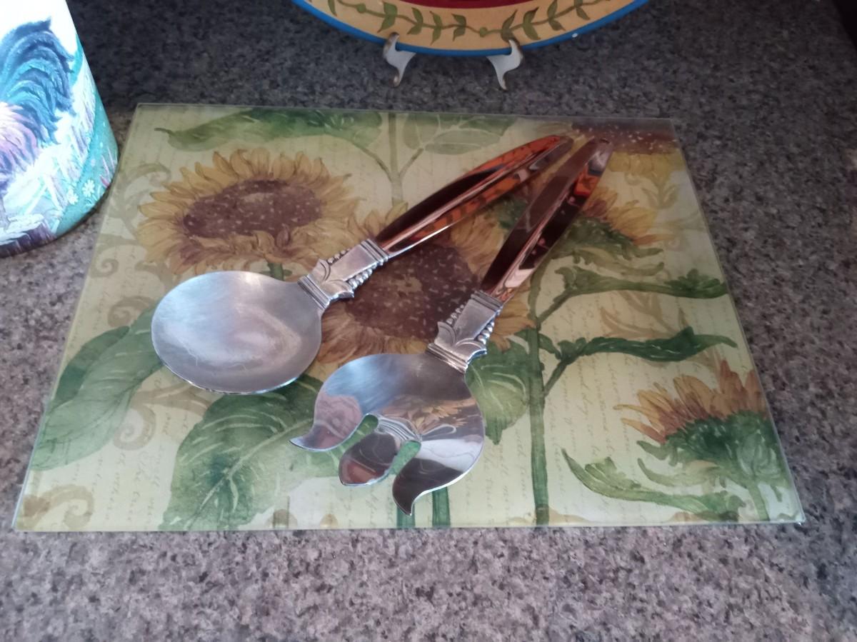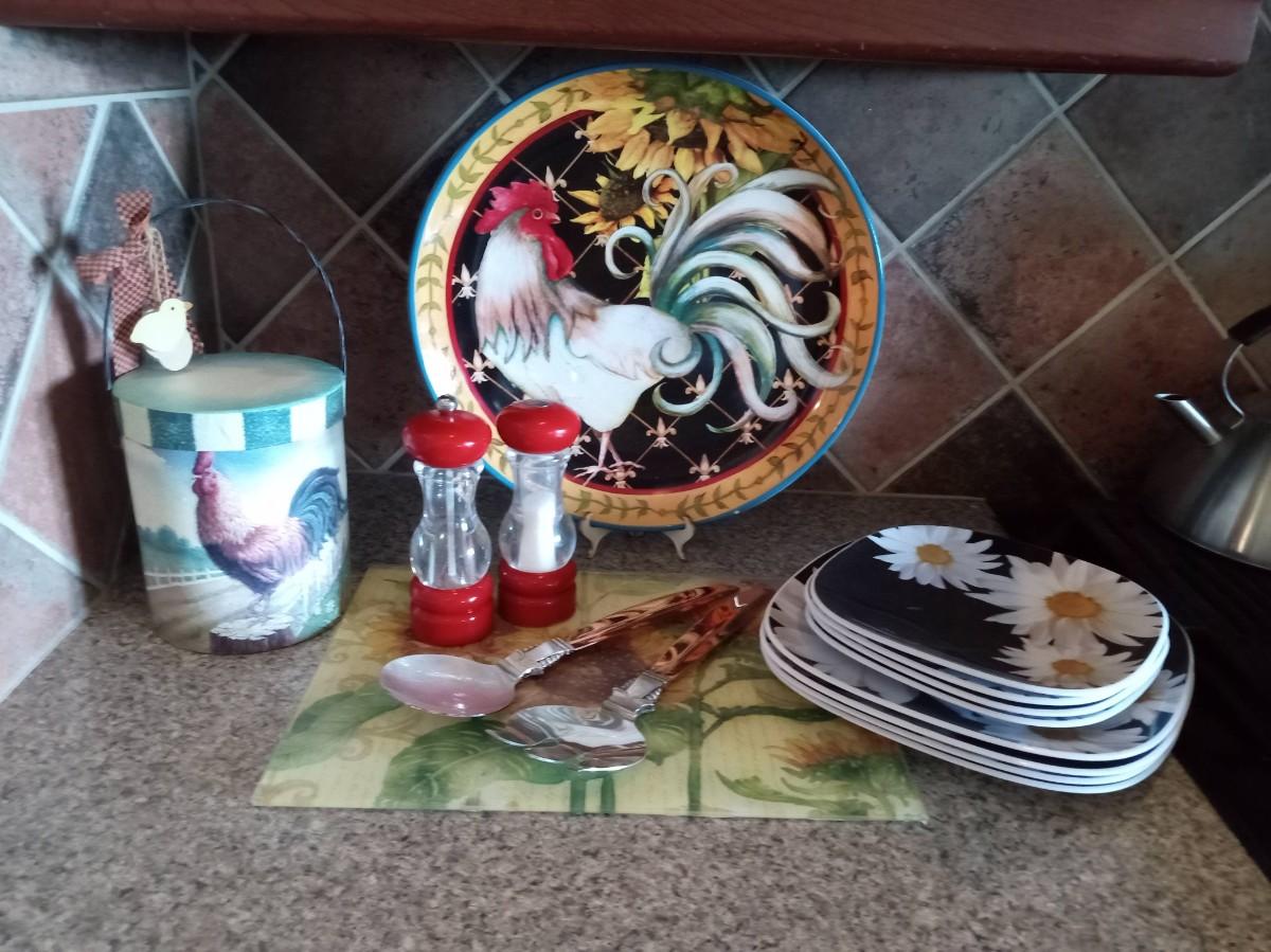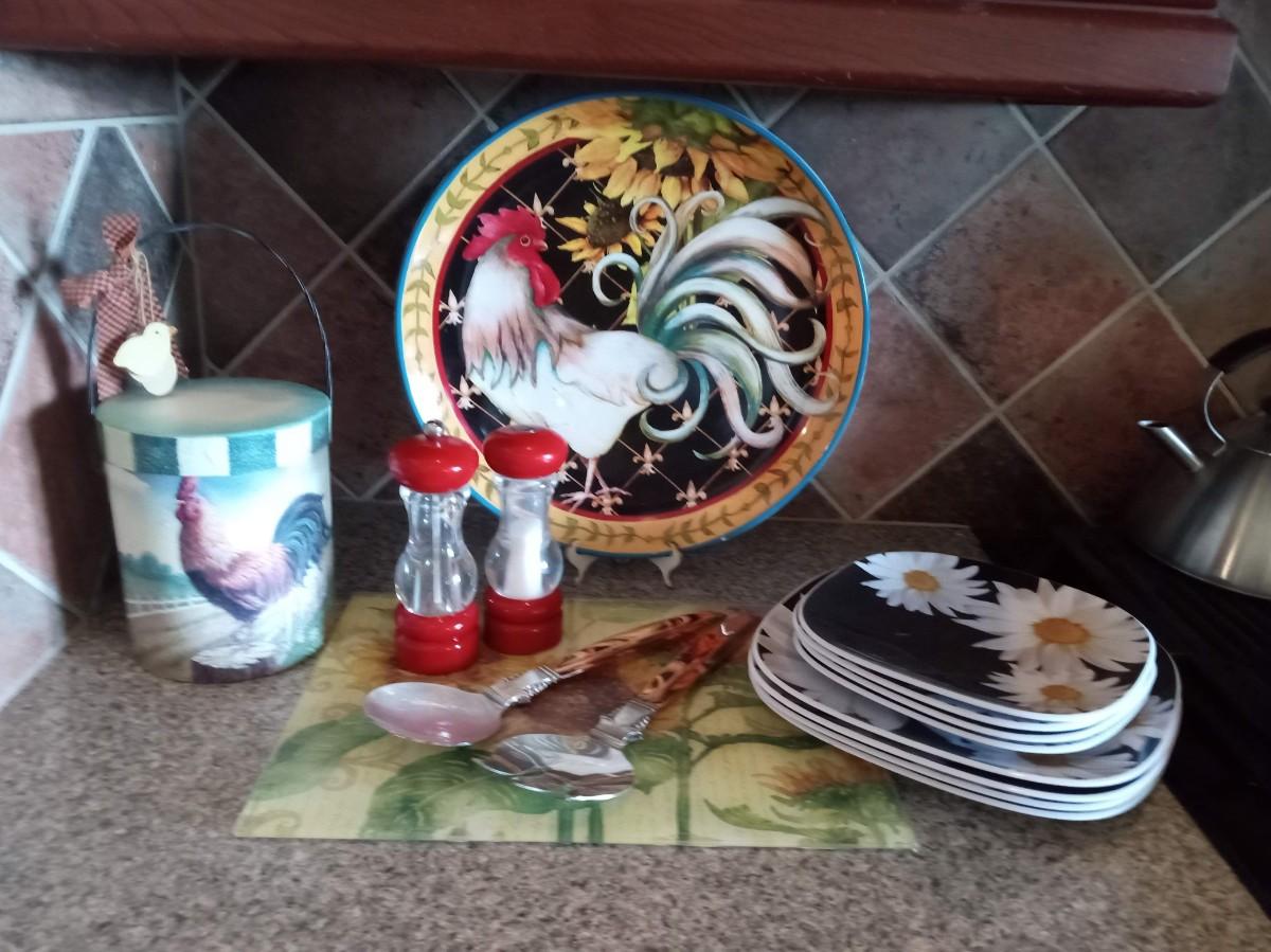 ROOSTER PLATTER, CARDBOARD CONTAINER WITH HANDLE, PLASTIC DINNER AND SALAD PLATES (4 EACH), GLASS CUTTING BOARD, SALT AND PEPPER SHAKERS, SERVING UTENSILS