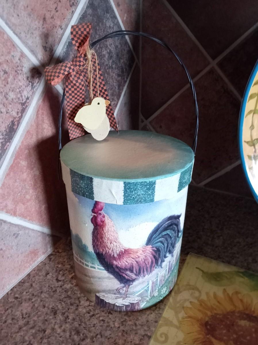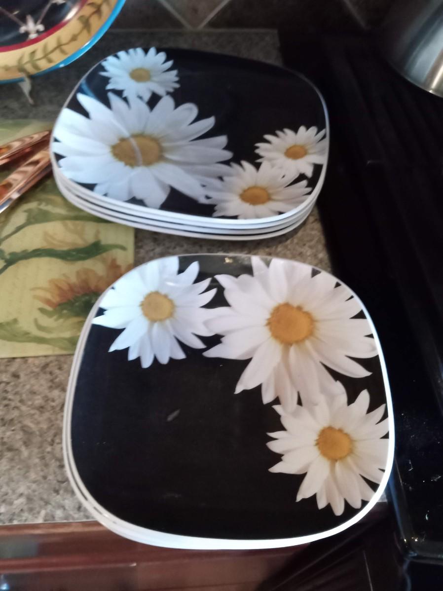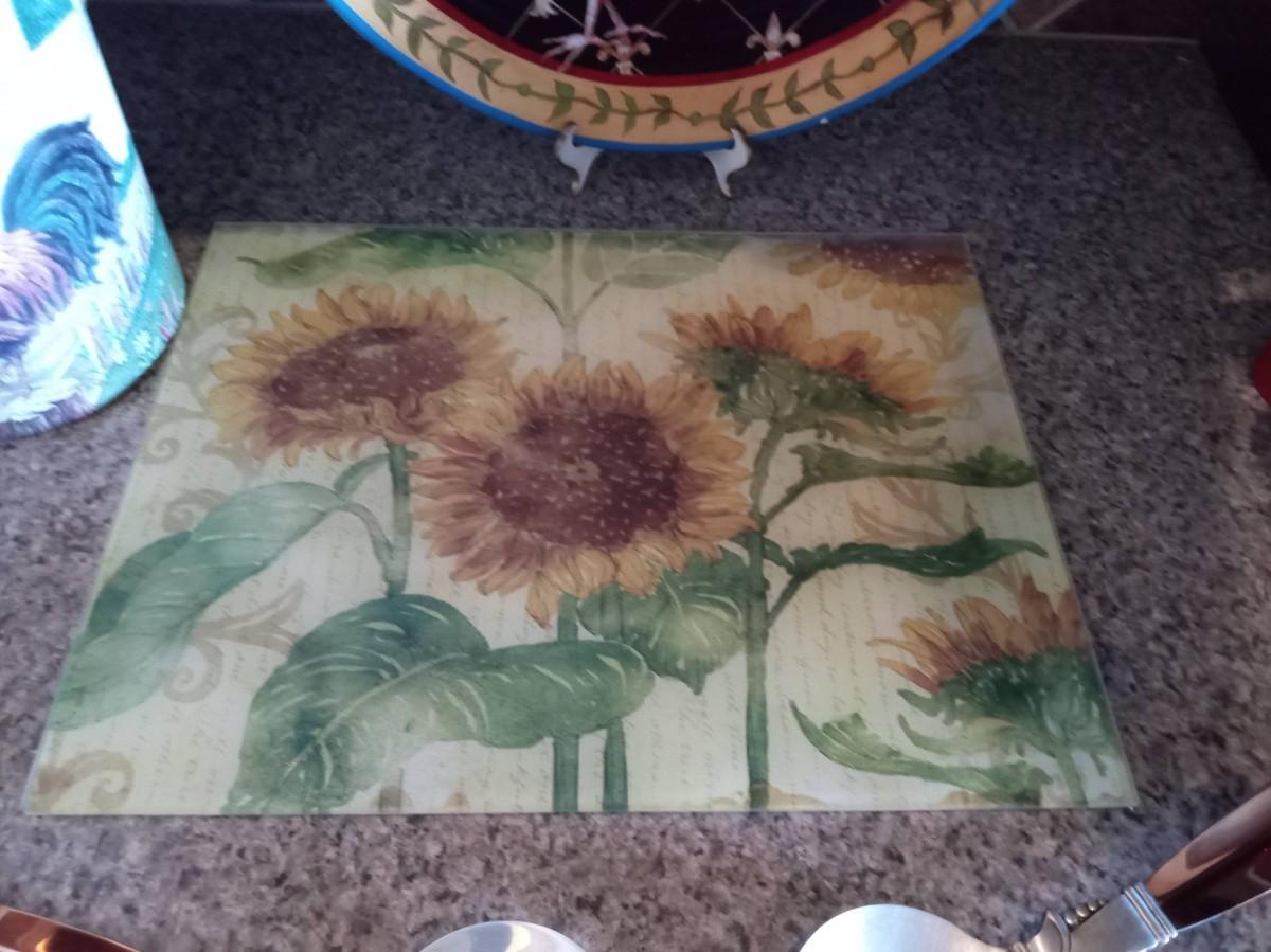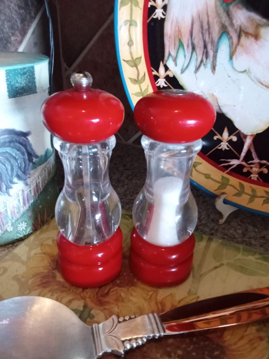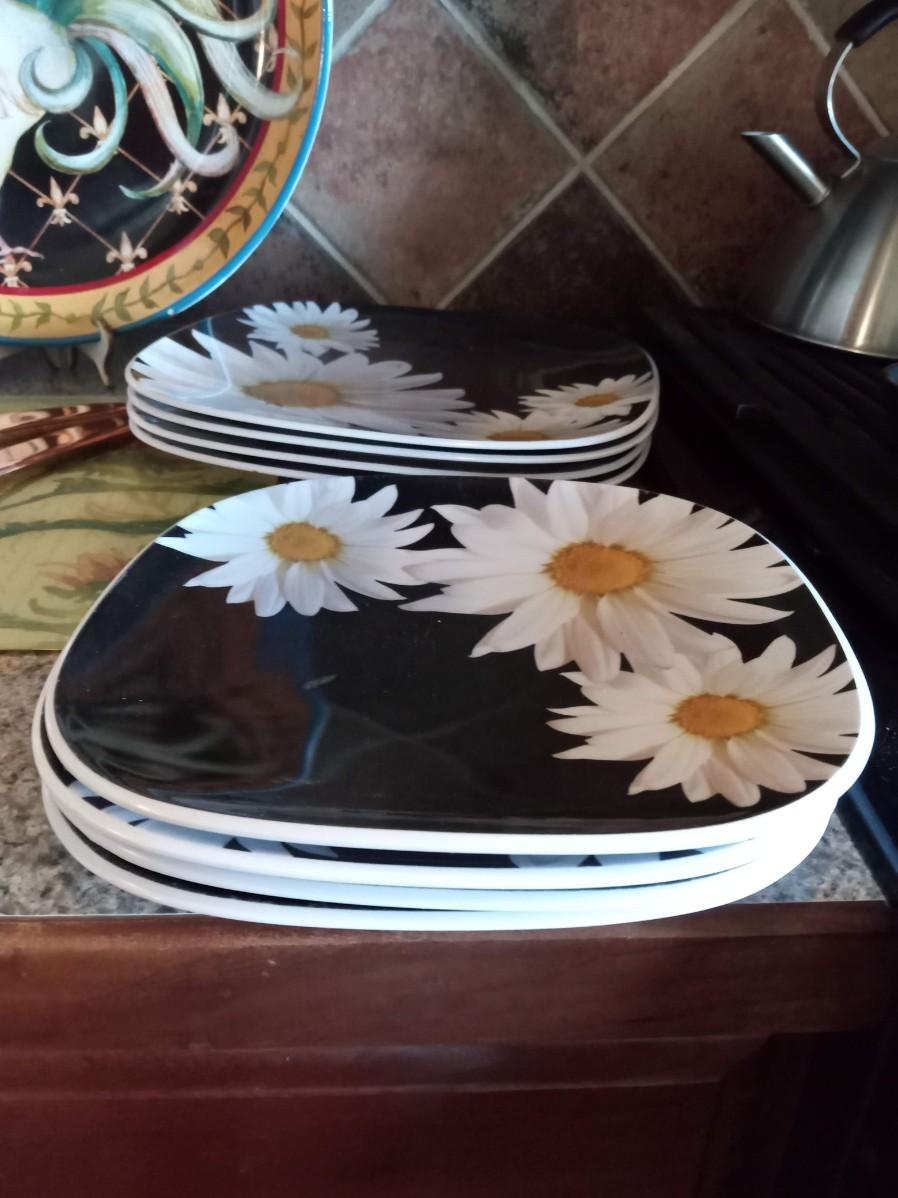 ROOSTER PLATTER, CARDBOARD CONTAINER WITH HANDLE, PLASTIC DINNER AND SALAD PLATES (4 EACH), GLASS CUTTING BOARD, SALT AND PEPPER SHAKERS, SERVING UTENSILS