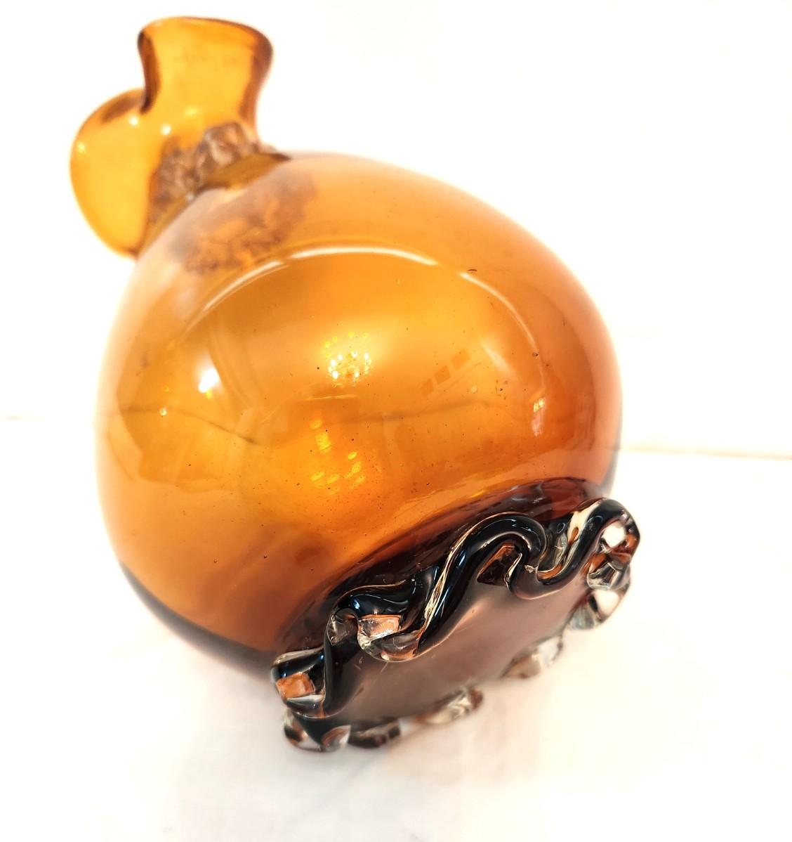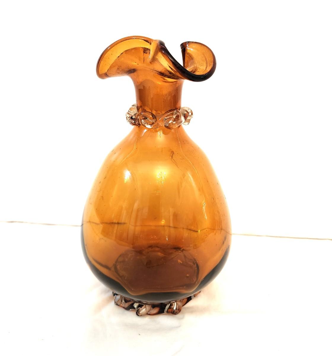 Nice piece of blown amber glass with applied decoration - 1 rough spot on neck decoration - you have to "feel" to find it. 8" tall.