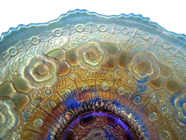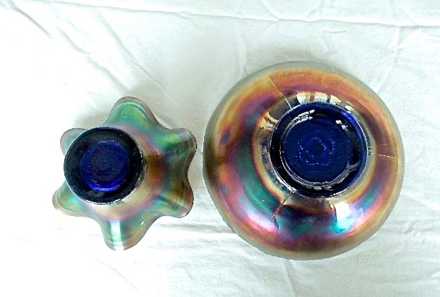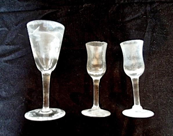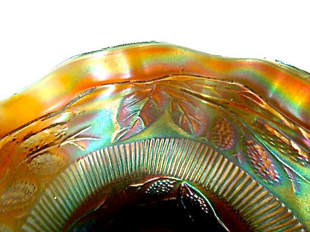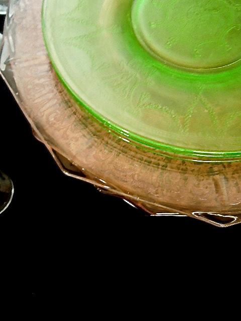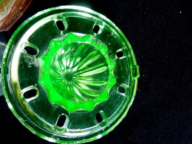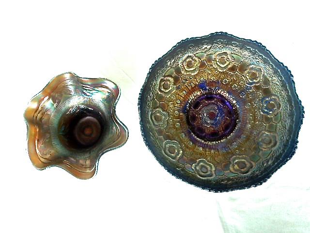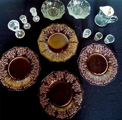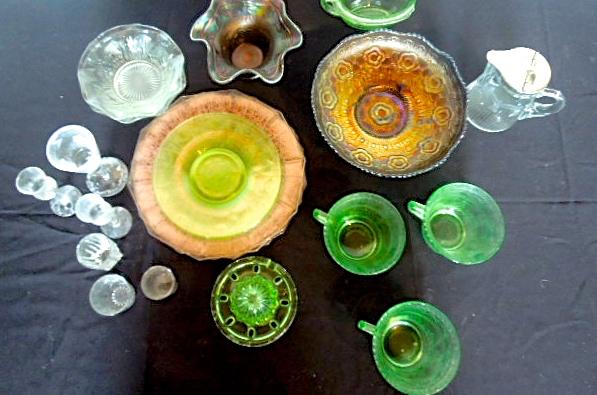 Irredescent amethyist dark purple carnival glass, orange marigold carnival glass, vaseline green glass, pink depression glass, etched clear glass syrup pourer, antique shot glasses, cordials, ruffled edge yellow glass bowls. No chips noted. Some scratched surfaces.