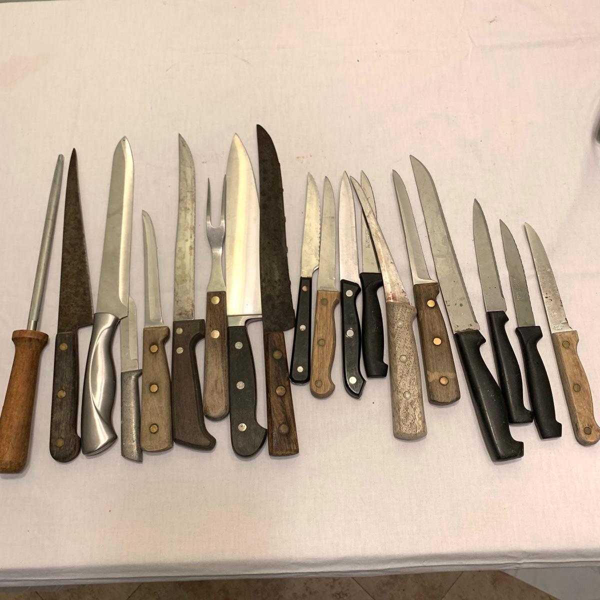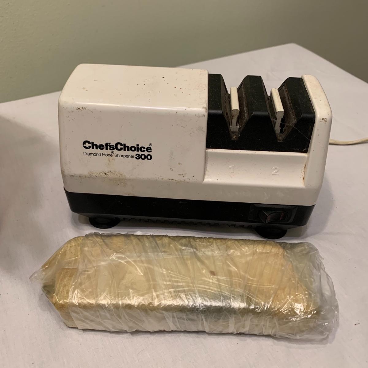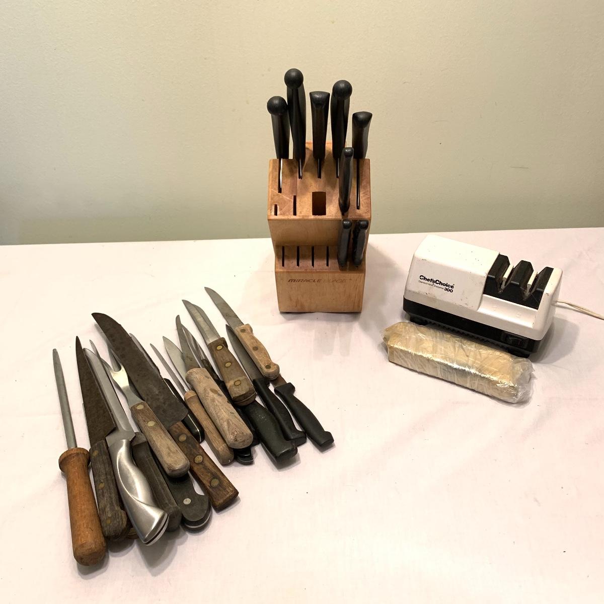 Meet all your cutlery needs in one stop! This lot includes assorted knives of all lengths and styles. Also included is a partial set of knives with their own storage block. Last are two sharpeners on is an old school sharpening stone, and the other is a 7” x 3.5” x 4” Chefs Choice electric sharpener, which turned on when connected to power. See pics for lot content. Shipping available.