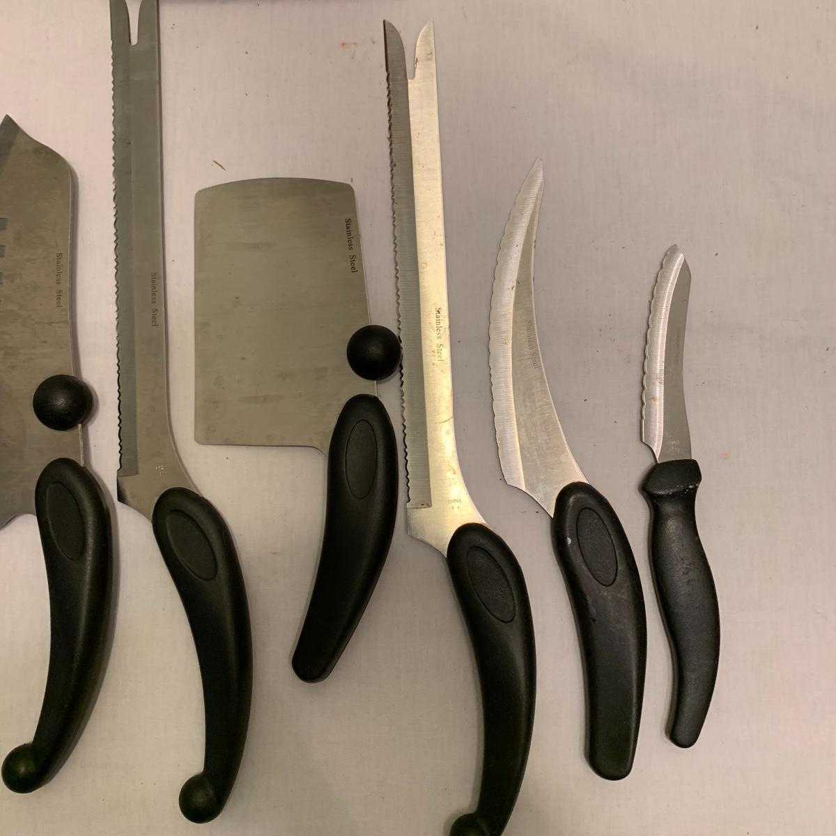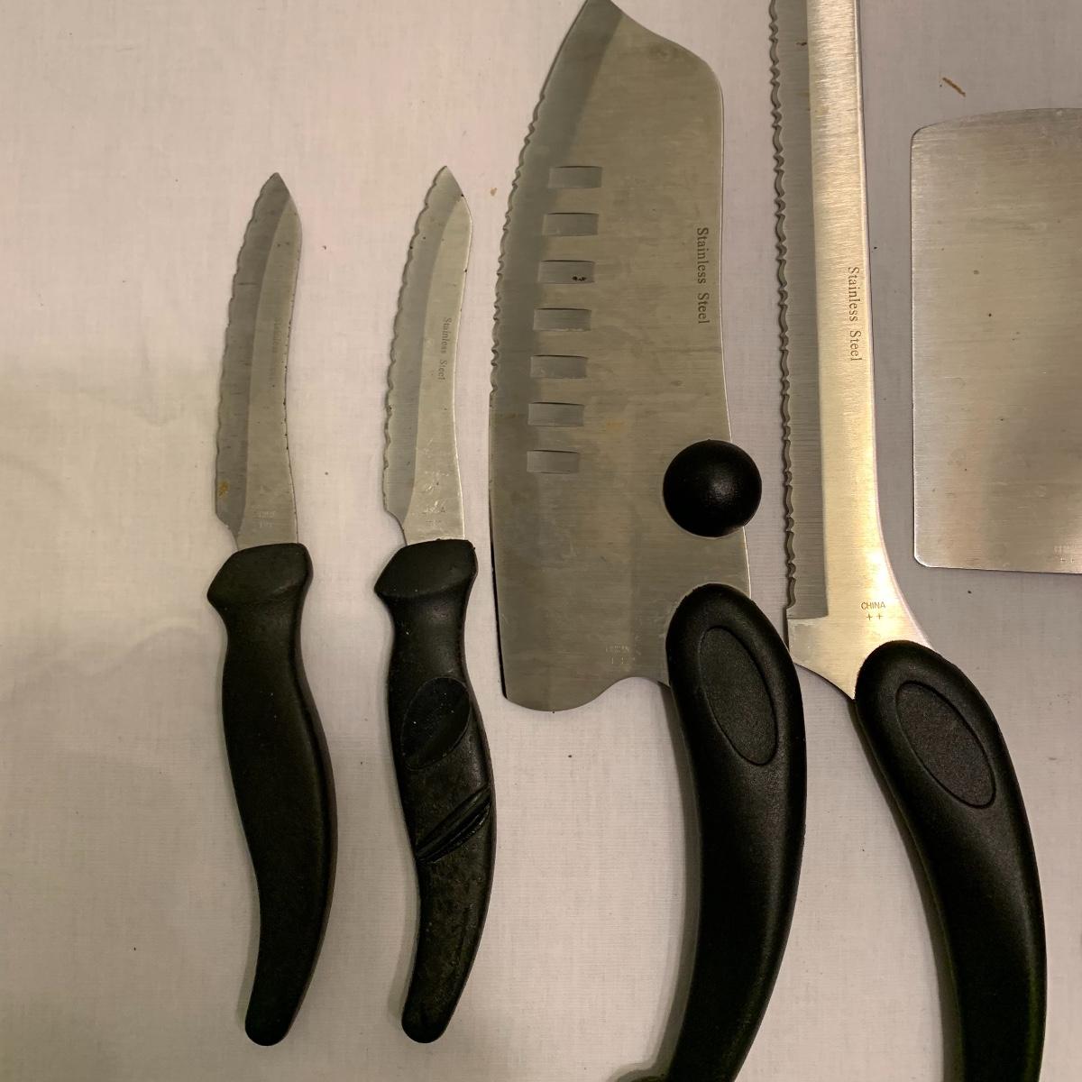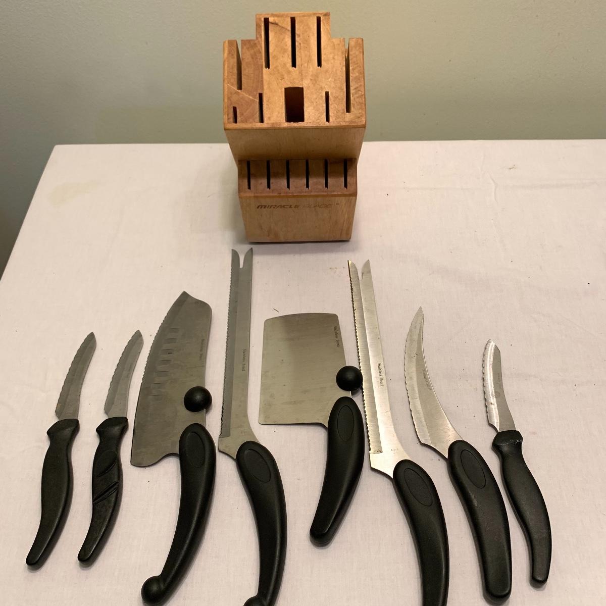 Meet all your cutlery needs in one stop! This lot includes assorted knives of all lengths and styles. Also included is a partial set of knives with their own storage block. Last are two sharpeners on is an old school sharpening stone, and the other is a 7” x 3.5” x 4” Chefs Choice electric sharpener, which turned on when connected to power. See pics for lot content. Shipping available.