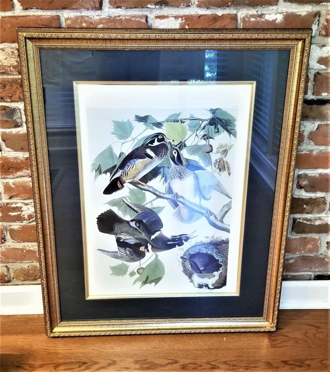 This is a lovely Audubon bird print in frame. Unfortunately, it has "slipped" in the frame and it is impossible to tell what series this is from without removing the back. We have identified it as "Summer of Wood Duck", plate 106, No. 42 Due to the other markings we THINK it may be a Havell print, but impossible to know without taking it apart. Measures 37" tall, 28.75" across in frame. Print is in good condition and slippage would be an easy fix.