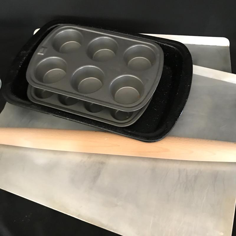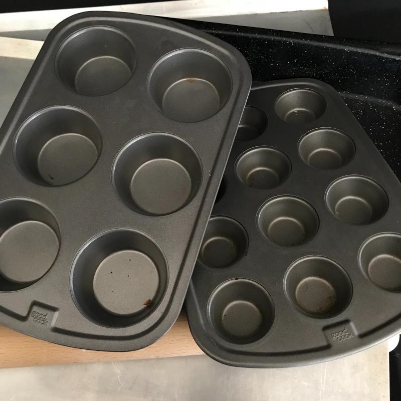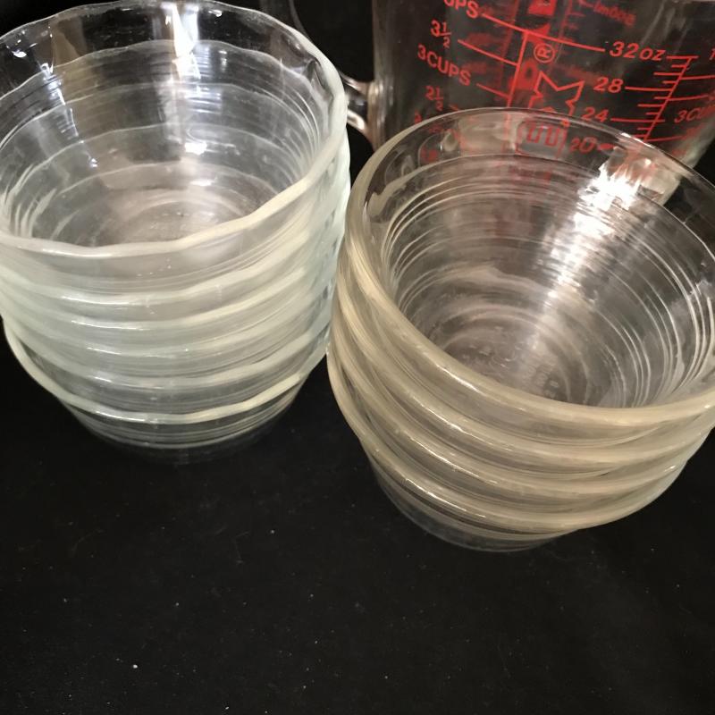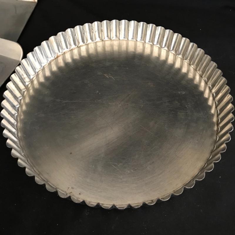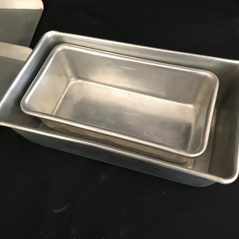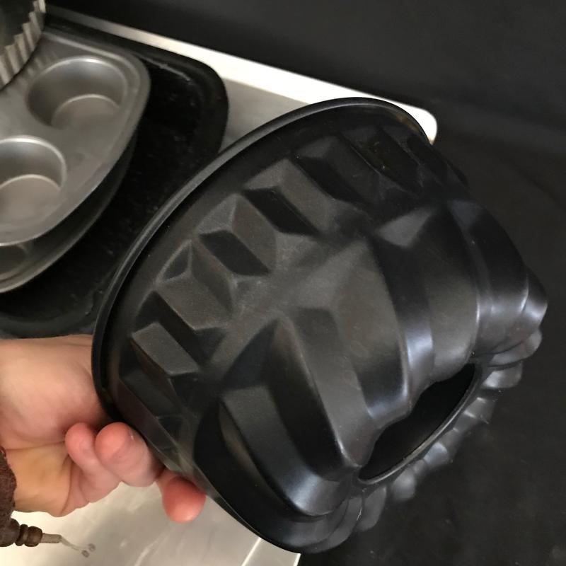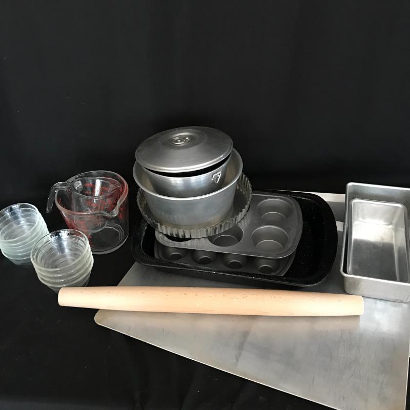 This lot includes two large baking sheets (20.5”l x 15.5”w), baking pin, two muffin tins, one bunt cake pan, two Jello molds, one tart pan, two bread pans, two Pyrex measuring cups, and 10 small Pyrex bowls. No shipping available. Local pickup only in Flat Rock, NC.