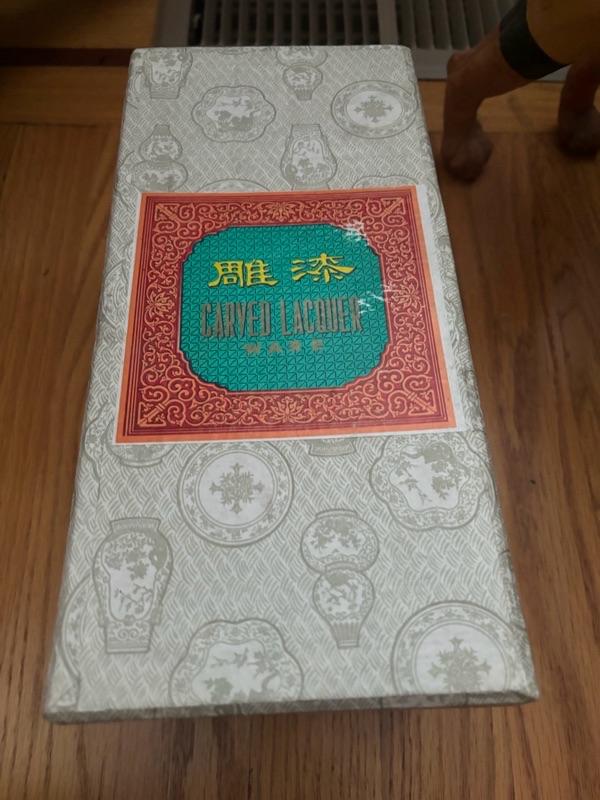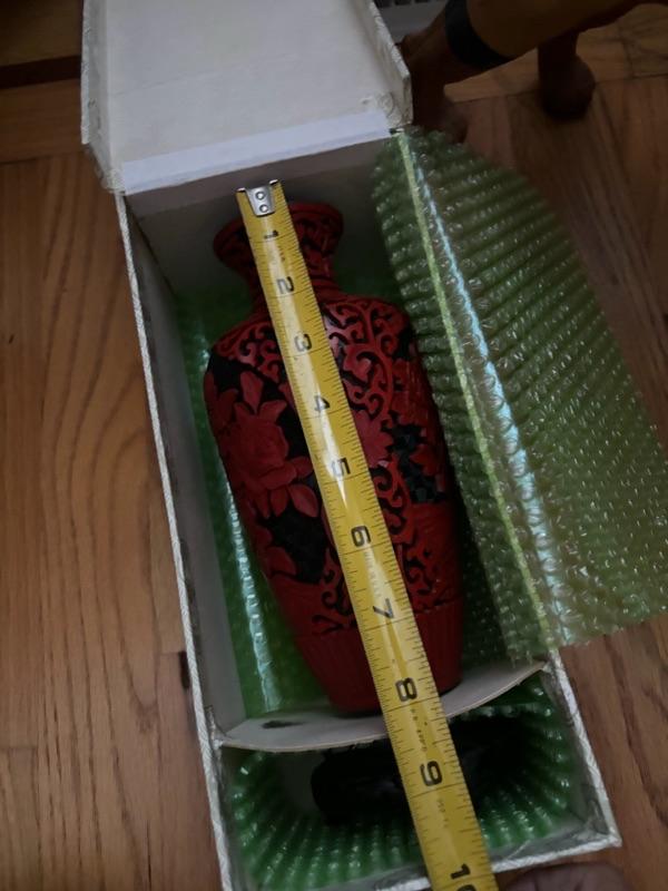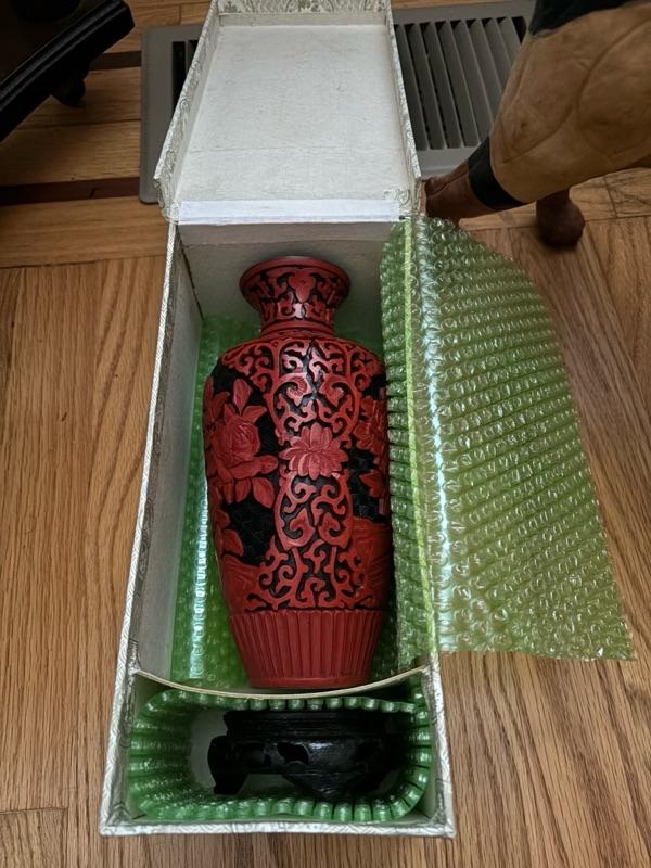 Lot 84 - Chinese Carved Lacquer Cinnabar Floral Vase Red & Black with Wood Stand 8”