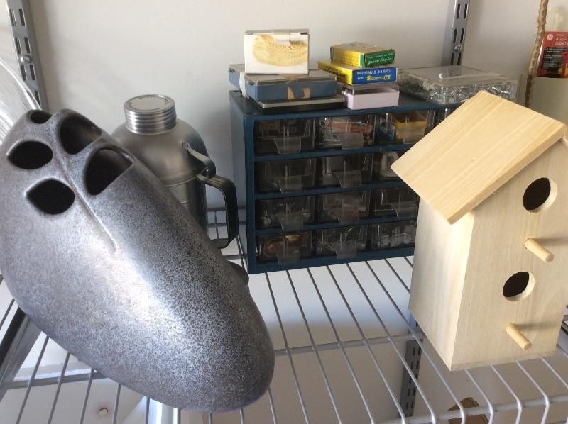 lot of Christmas paper, wooden tray, decorative vase, drawer organizer with nuts and bolts