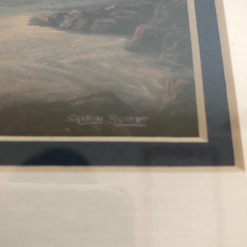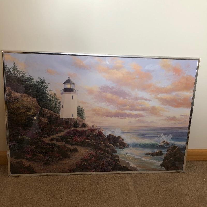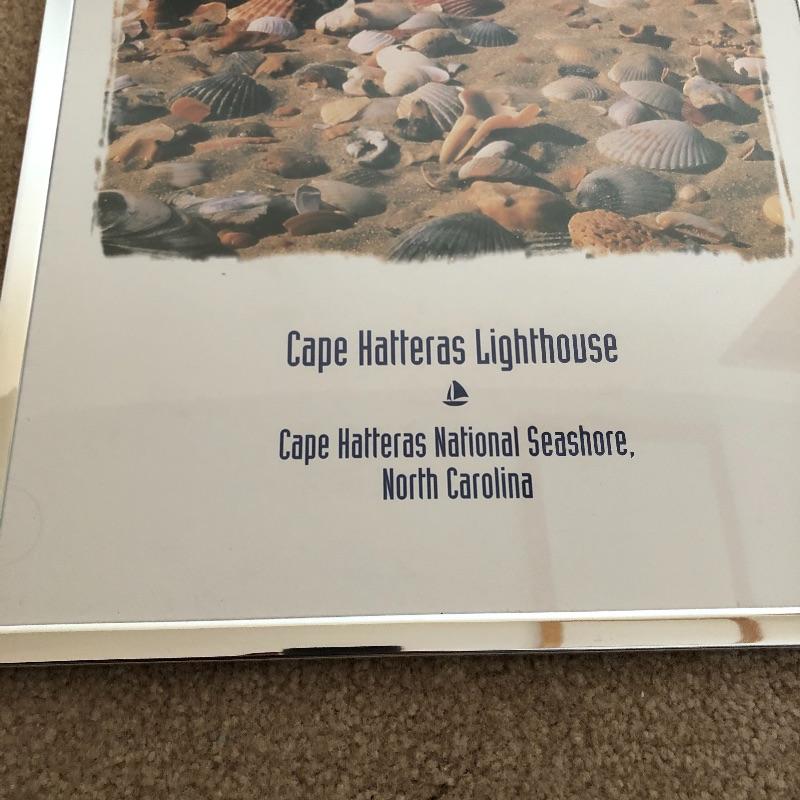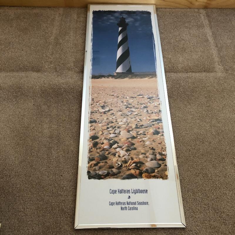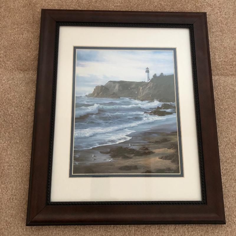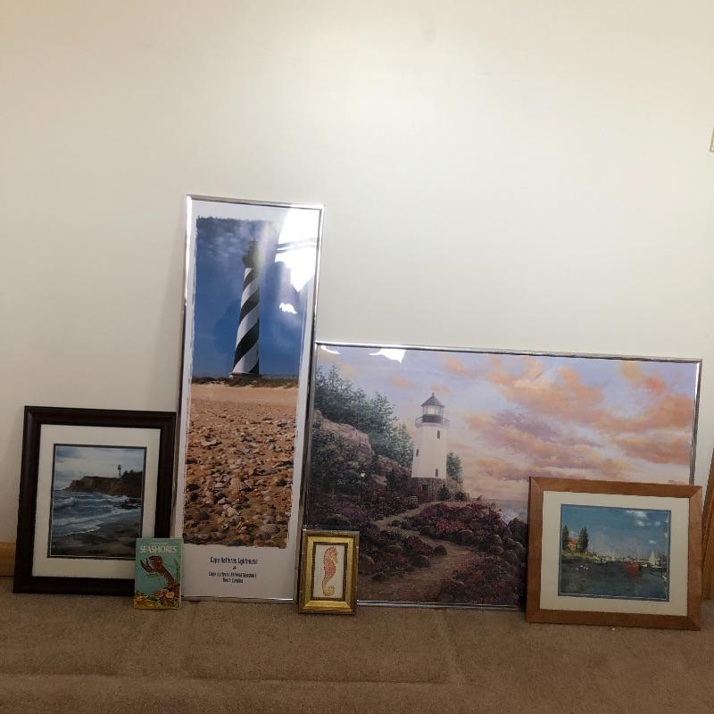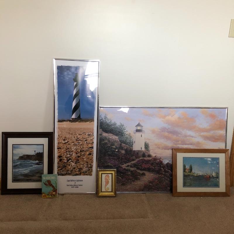 A selection of framed artwork with a coastal theme. Lot includes two framed and matted prints, framed pencil signed print and two framed lighthouse prints. Largest frame measures 24” x 36”.
