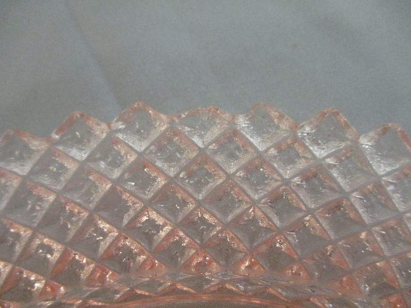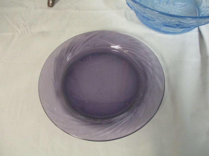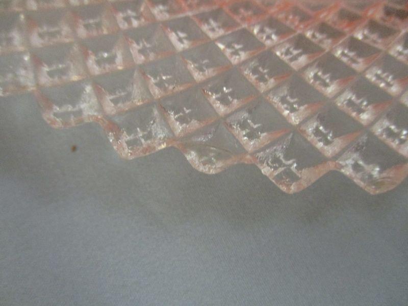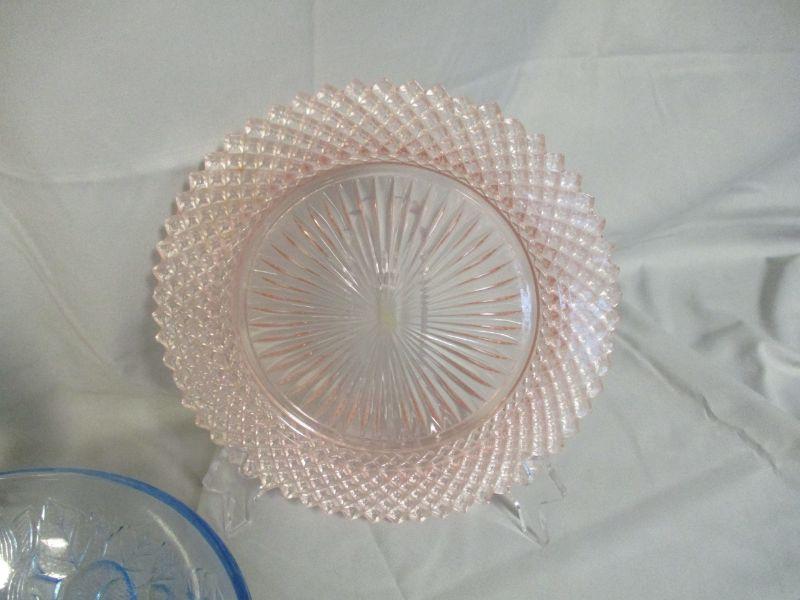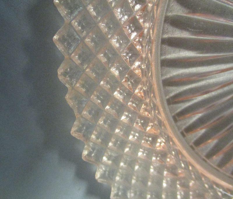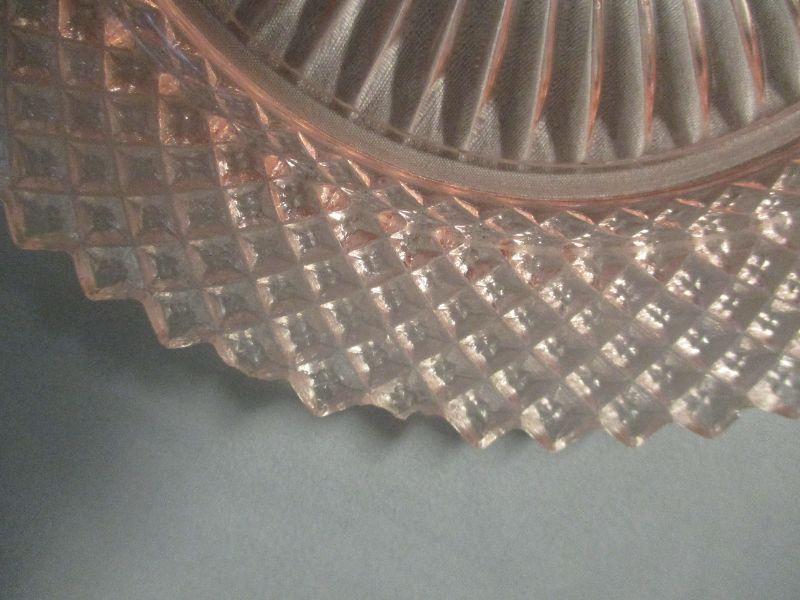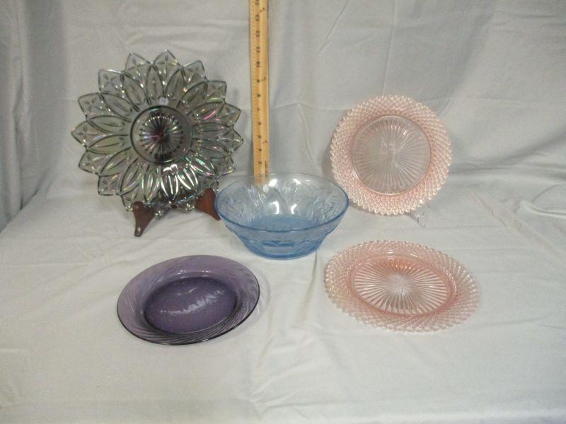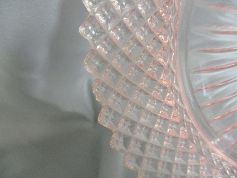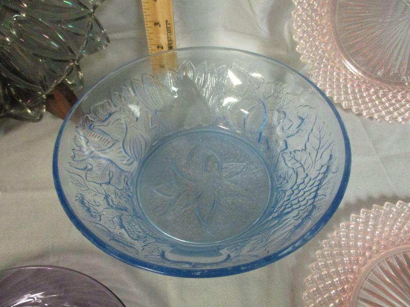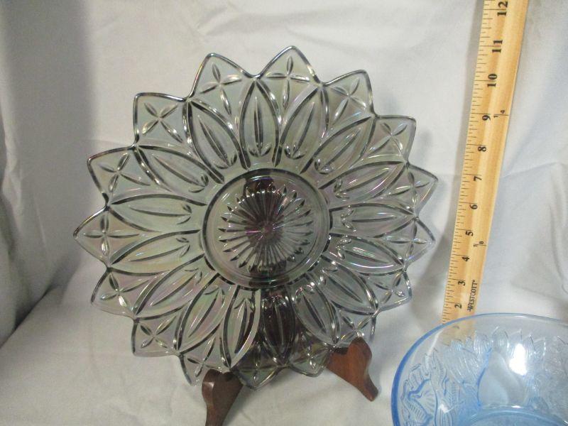 The large plate is the Petal pattern in smoke iridescent produced by Federal Glass in the 1960s and it is in excellent condition. The blue bowl was made by KIG Indonesia and is also in great shape. I don't know who made the purple plate, but they did a great job because it is still in excellent condition. The two pink plates are the Miss American pattern made by Anchor Hocking between 1935-1938. There are some nicks to the points on the edge, but those nicks are a bit hard to see because of the sawtooth edge pattern.