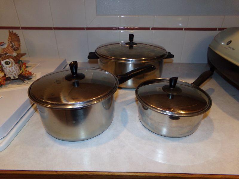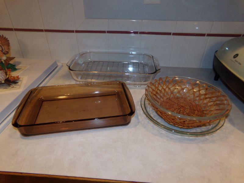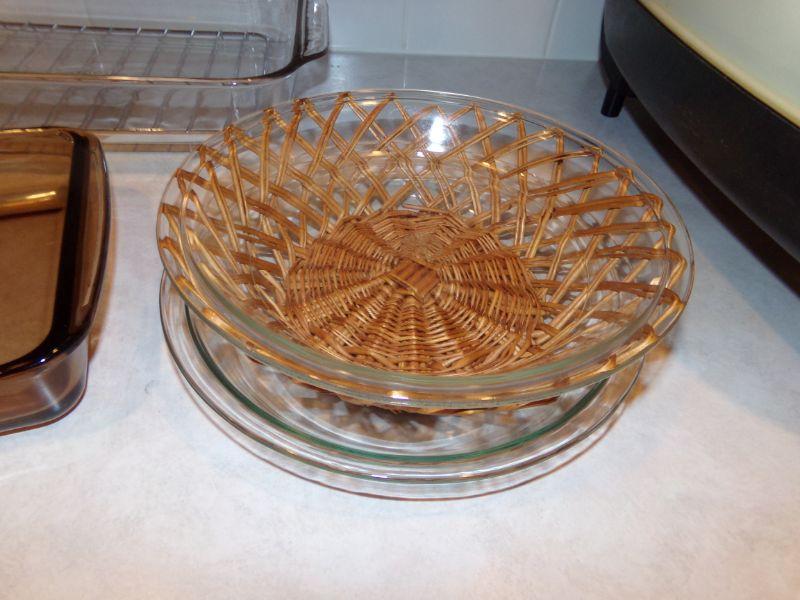 3 NORRISWARE SAUCEPANS W/LIDS, 2 GLASS LASAGNA PANS AND A GLASS SERVING BOWL WITH WICKERSHELL