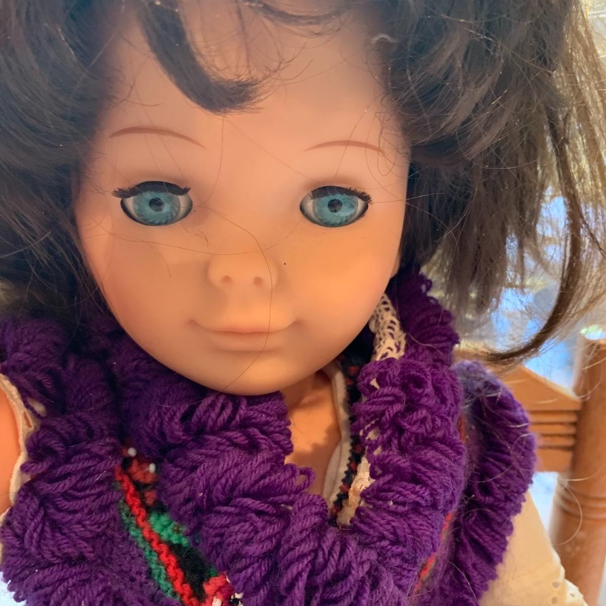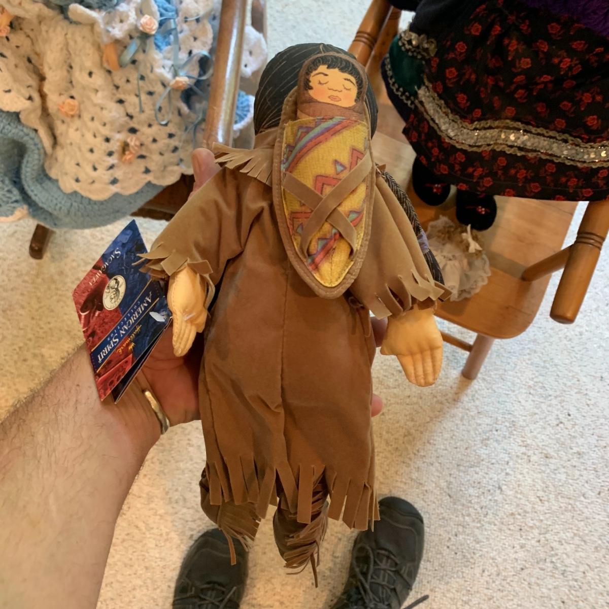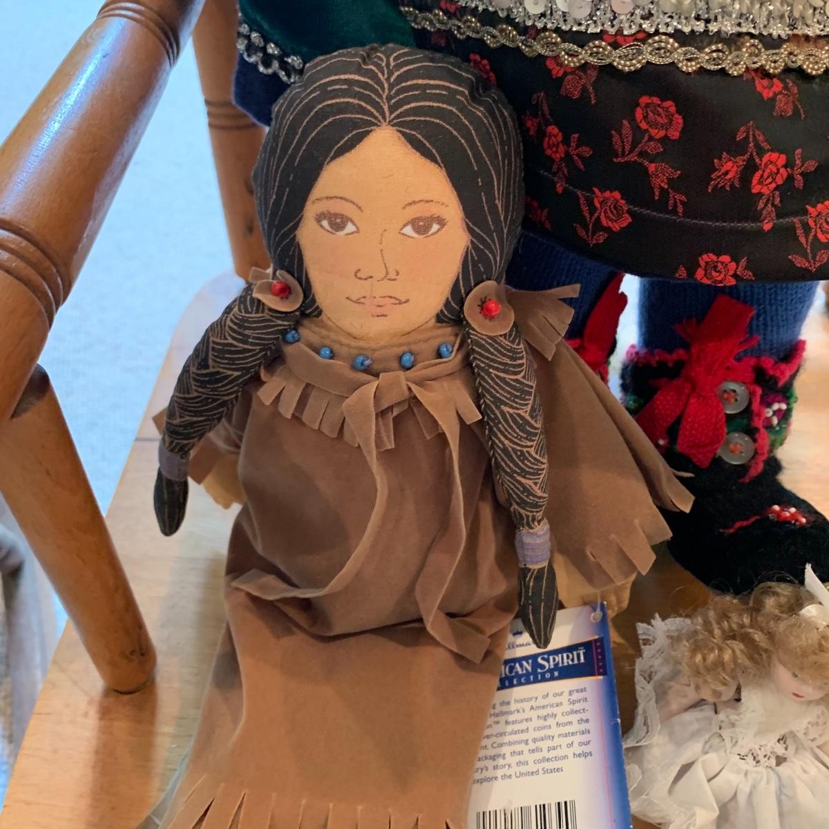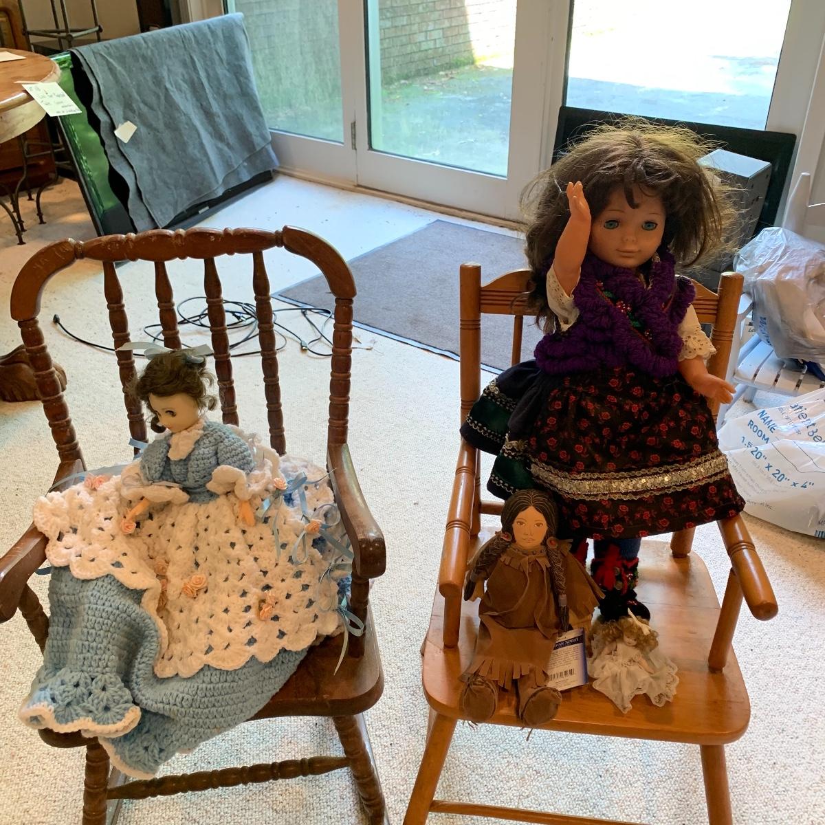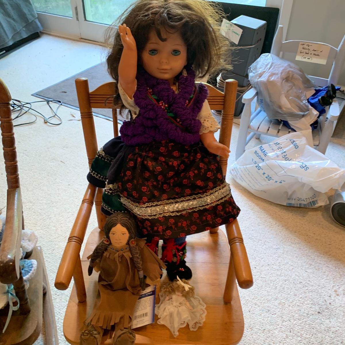 This is adorable!! Lot 100 offers two cute children’s rocking chairs as well as four dolls. The largest of the three stands 33” tall and is well dressed in winter attire and has some hair falling out. This blue eyed doll has an L makers mark on the back of her neck, see pictures. The next is an American Spirit Sacajawea doll made by Hallmark. Last is a tiny doll that appears to be porcelain. No makers mark can be found. Local pickup only.