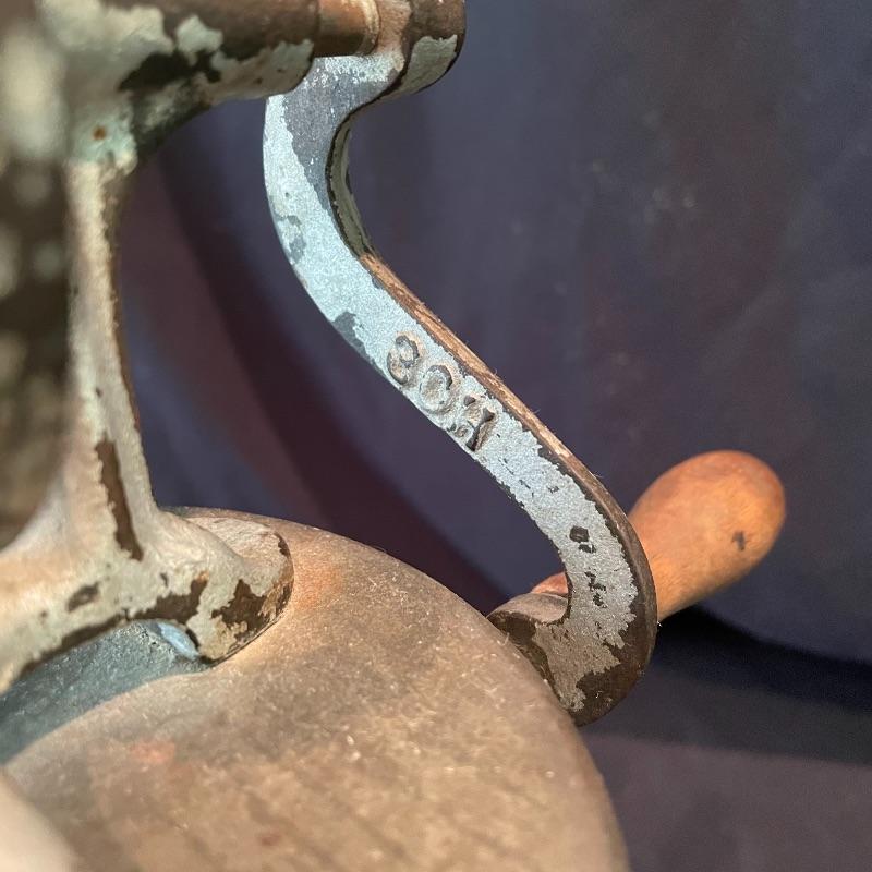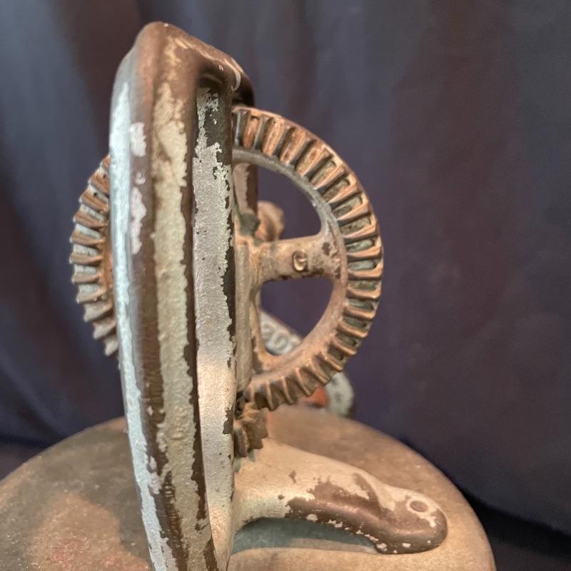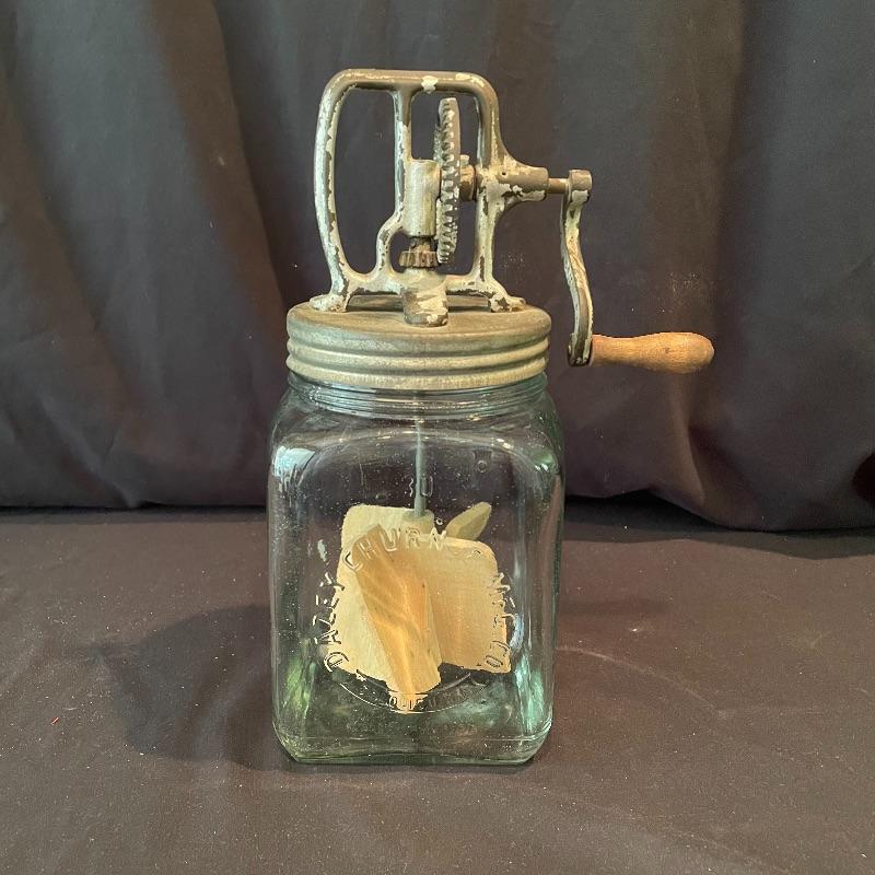 Here’s a sought after vintage round label churn by Dazey Churn & MFG. CO. Piece has shape molded lettering visible stating St. Louis USA, Made in America leading us to believe this is an original production. Piece has some very minor chips on the inside rim. The number 30 is apparent on the glass as well as 30H on the crank and 40 G on the gear. The lid appears to be steel and attracts magnets. The glass jar has a small white spot that appears to be paint on the rear side. Put together, piece measures approximately 5.5”sq x 14”, the jar alone is about 9” tall. See photos. Shipping available.