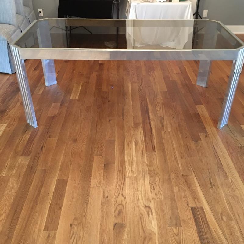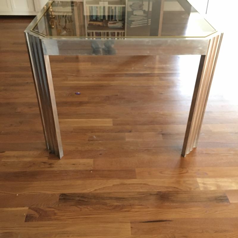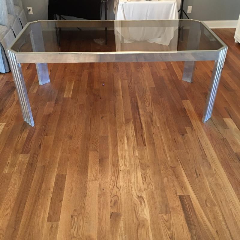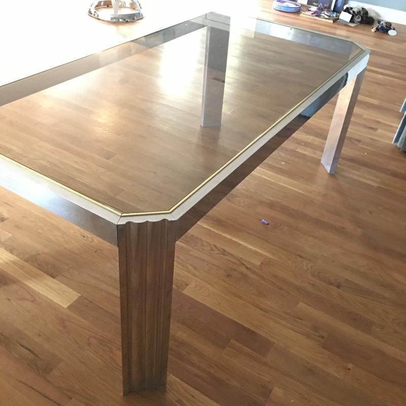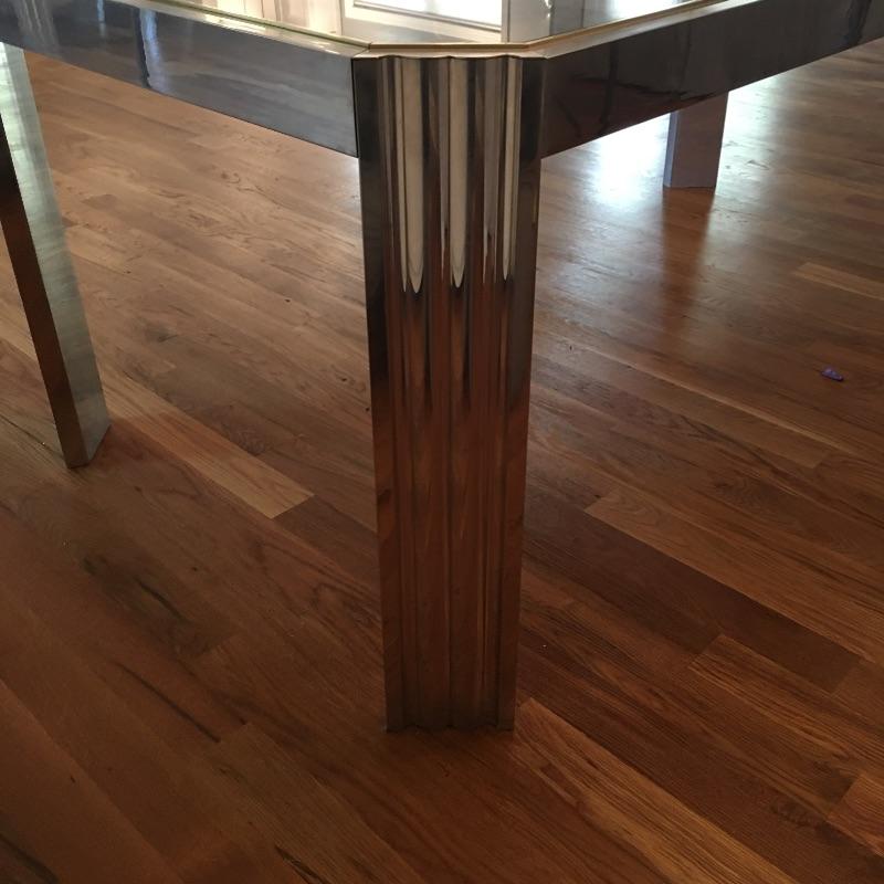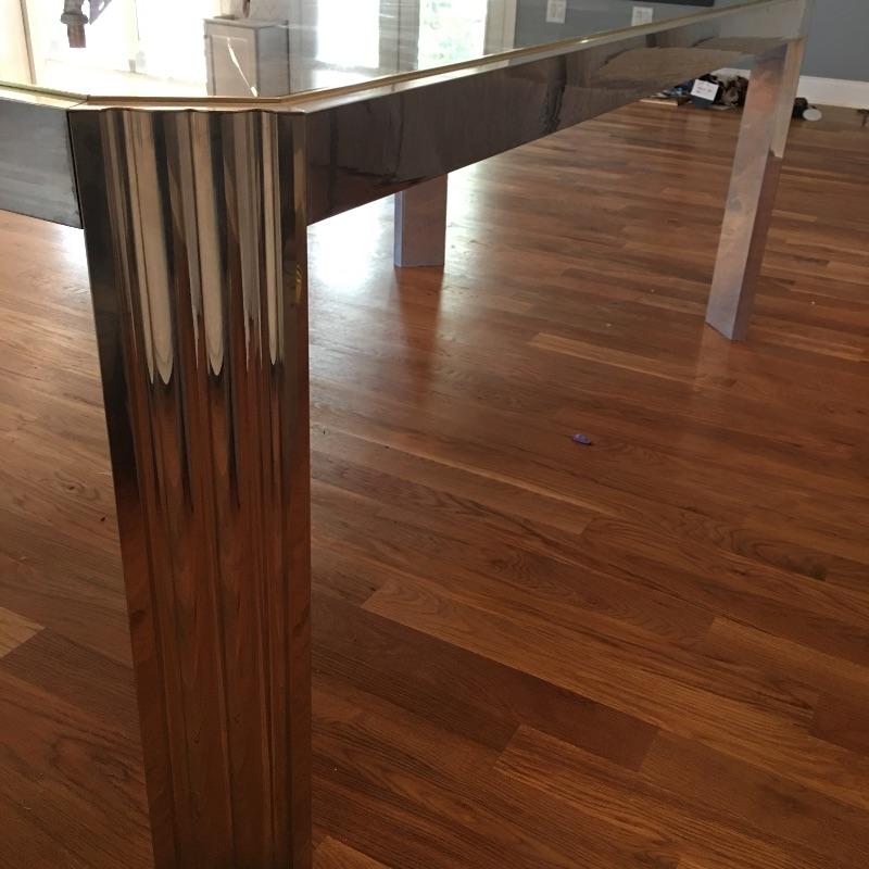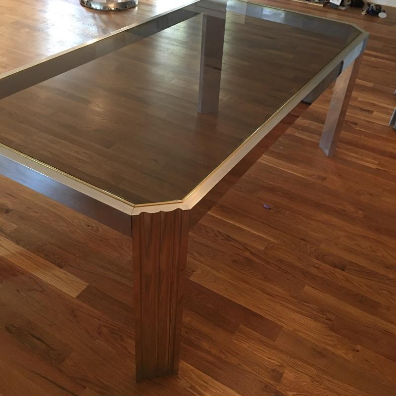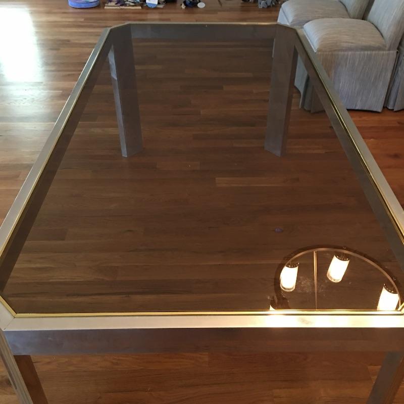 Contemporary rectangular glass and steel dining room table with a mirror like finish and brass colored edge around the glass top. Table measures 38” x 74” x 29”. Table matches lot 16. Bring help item is substantial.