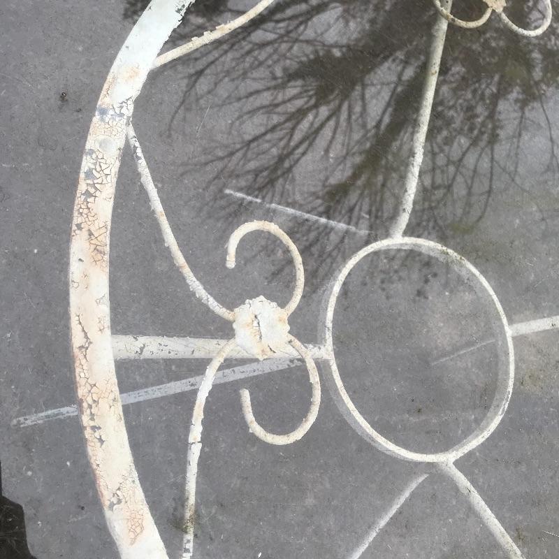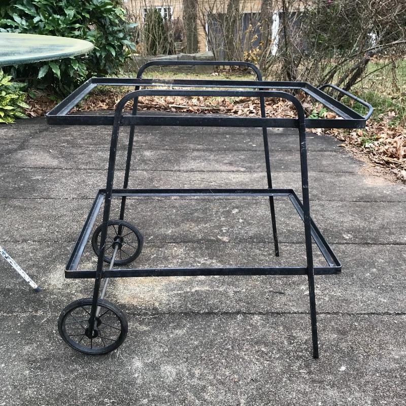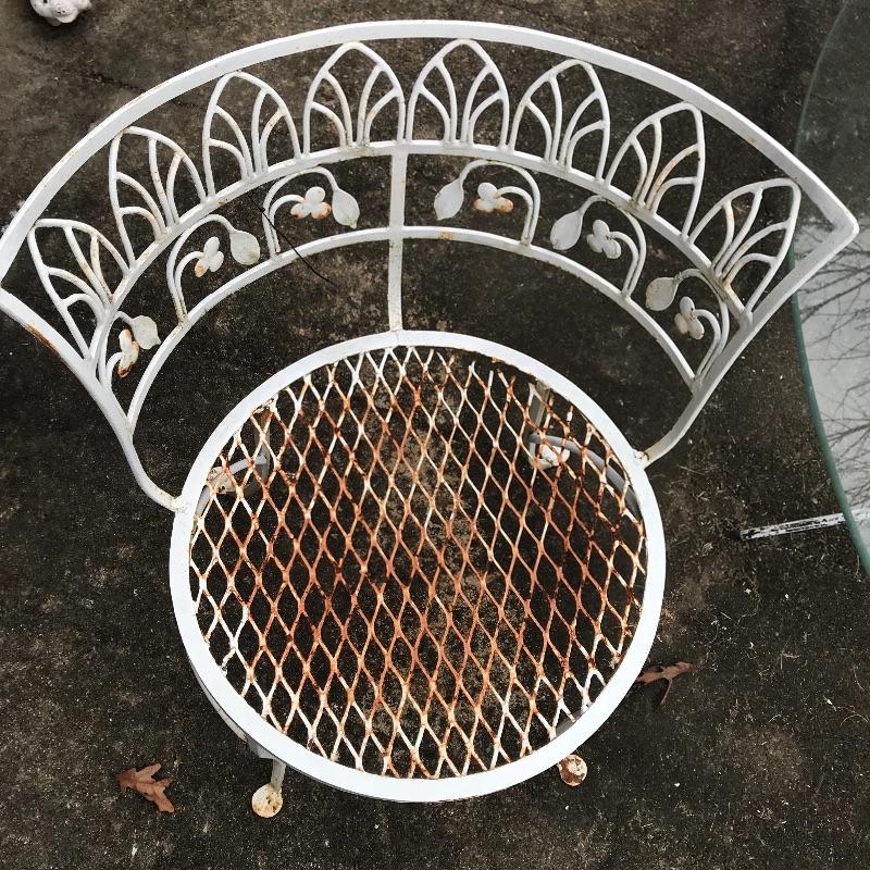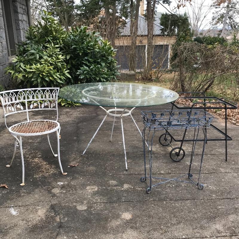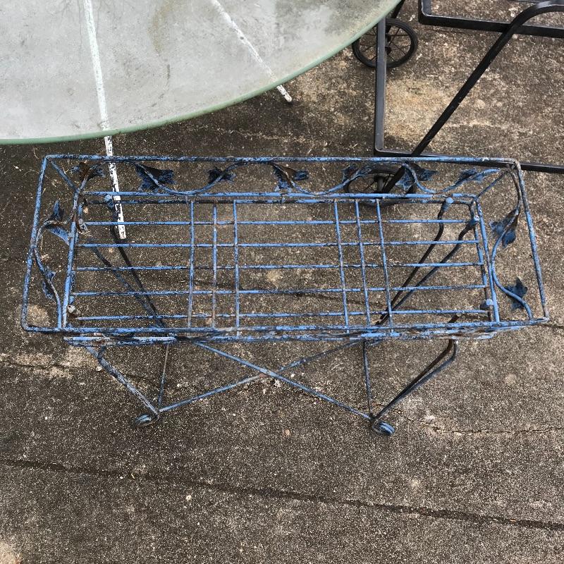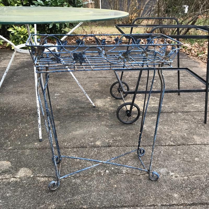 Four piece collection of outdoor furniture and decor. A painted white iron dinette sized table and chair to bring fun to your outdoor space. Both pieces have blemishes- the glass top has moderate scratching and the chair has started to separate but is sturdy enough for normal use. A black iron rolling cart glides smoothly and is in great shape. Does not include glass or wood for shelves. Lastly a beautiful blue iron plant stand give a little color pop to the collection. Glass top table measures approximately 48”d x 27.75” No shipping.