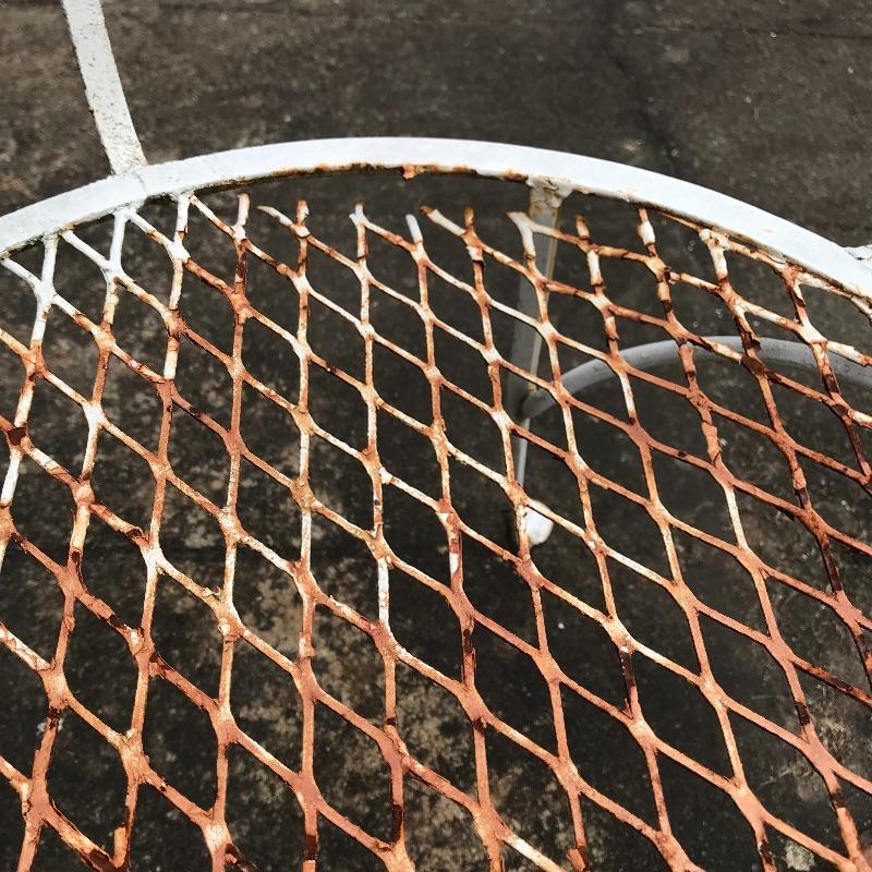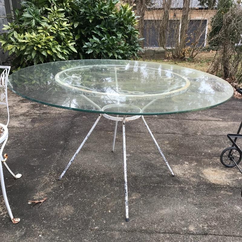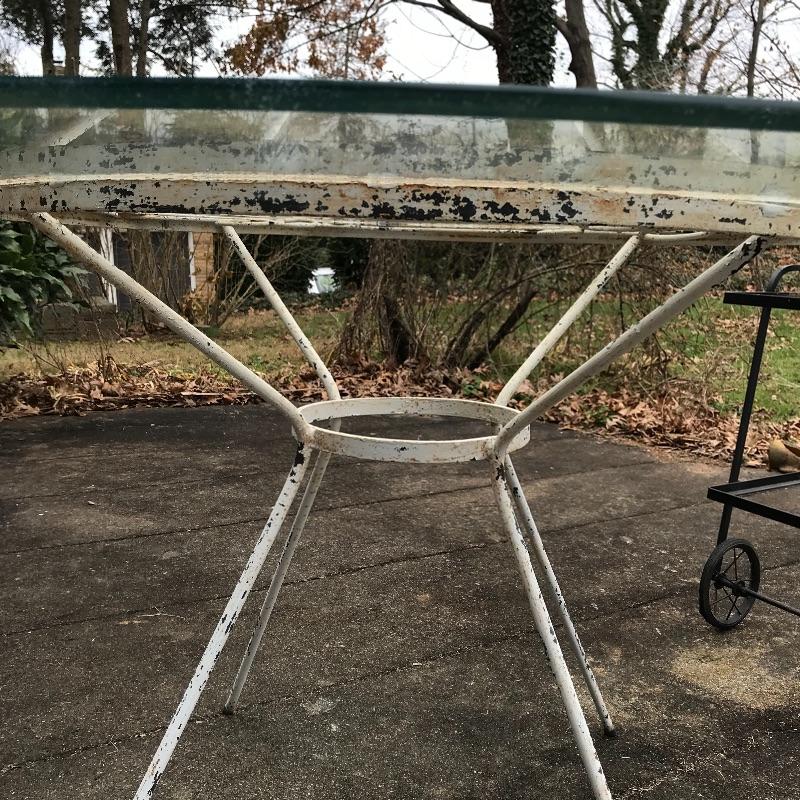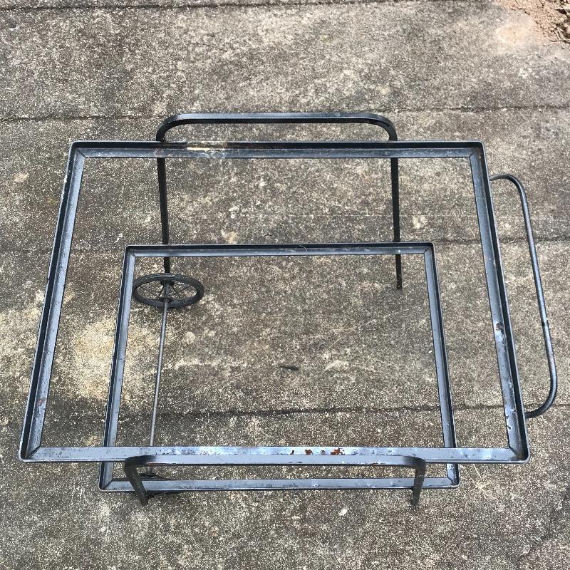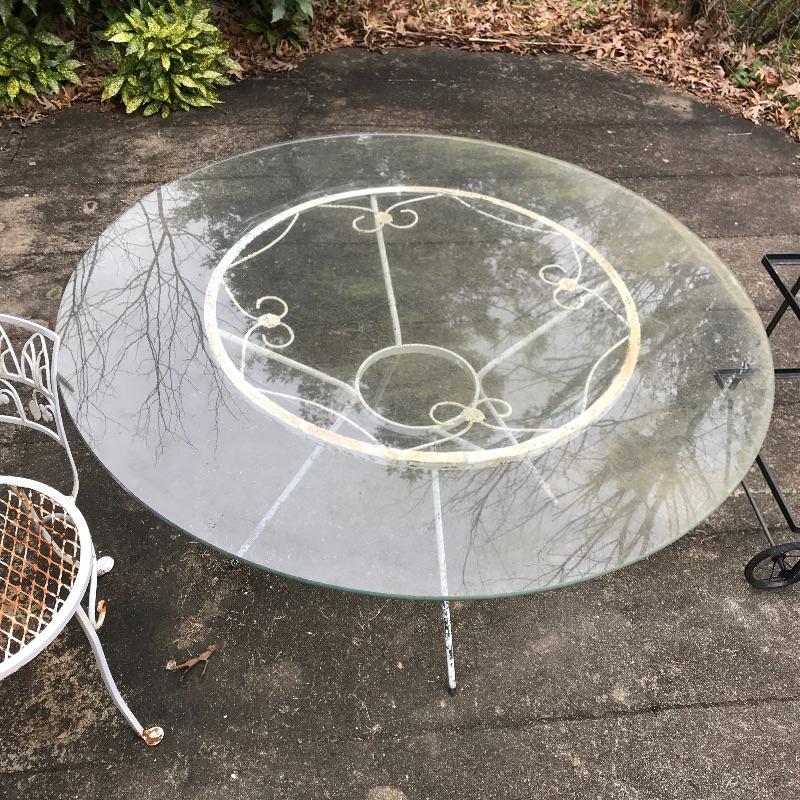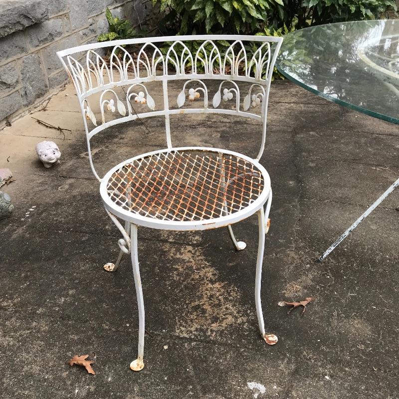 Four piece collection of outdoor furniture and decor. A painted white iron dinette sized table and chair to bring fun to your outdoor space. Both pieces have blemishes- the glass top has moderate scratching and the chair has started to separate but is sturdy enough for normal use. A black iron rolling cart glides smoothly and is in great shape. Does not include glass or wood for shelves. Lastly a beautiful blue iron plant stand give a little color pop to the collection. Glass top table measures approximately 48”d x 27.75” No shipping.