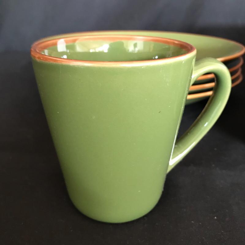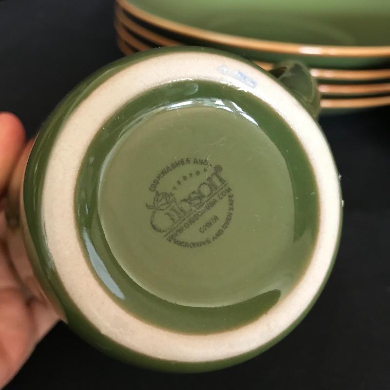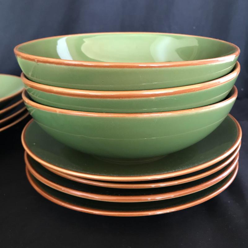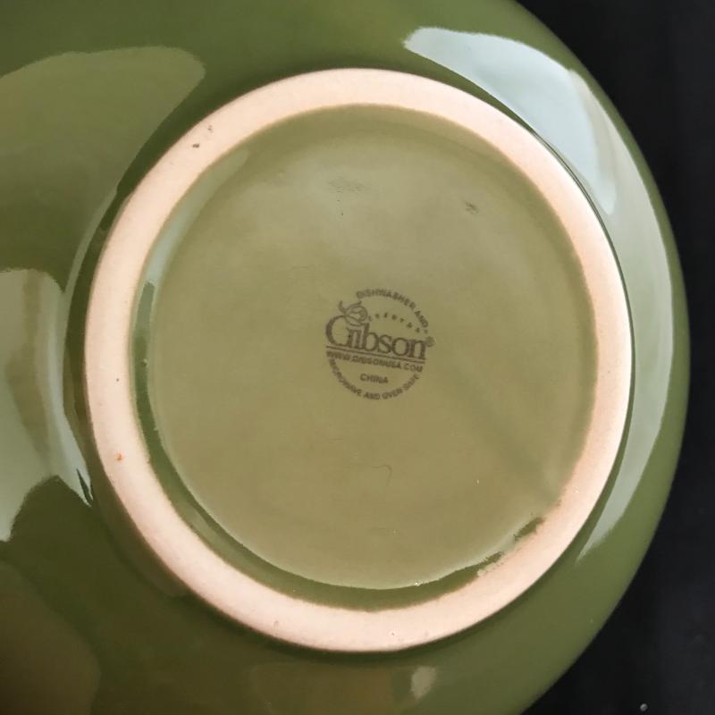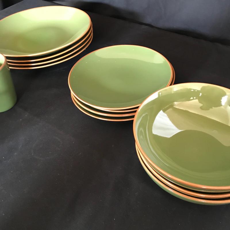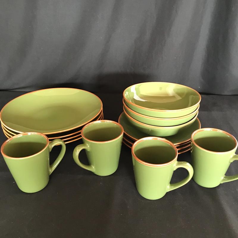 This 14-Piece forest green set by Gibson will add a comforting warmth to your kitchenware. Included in set are four dinner plates, three salad plates, three soup bowls, and four mugs. Like new. Local pickup only.