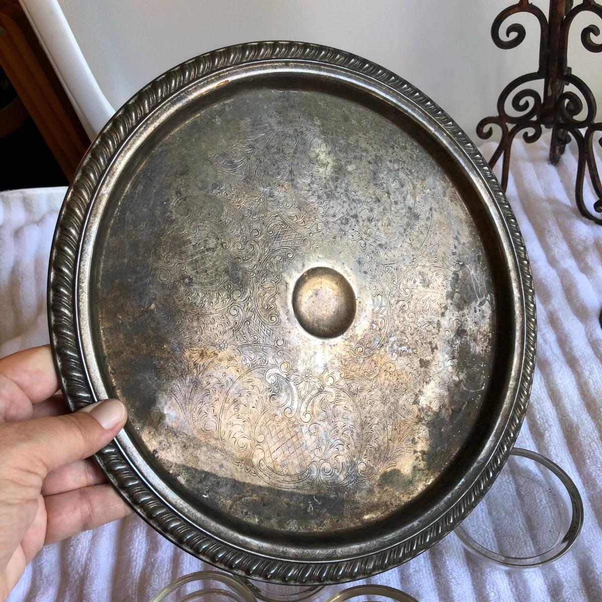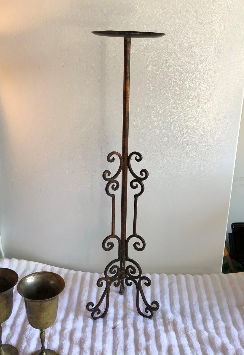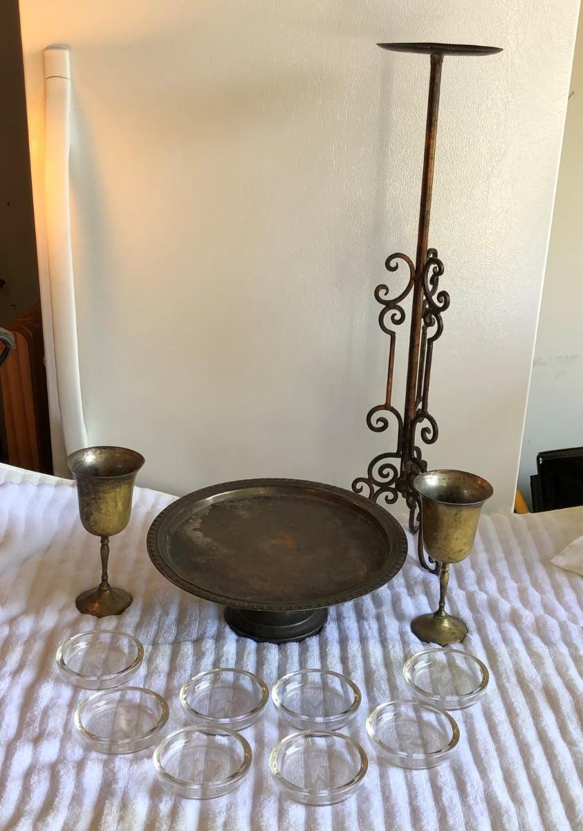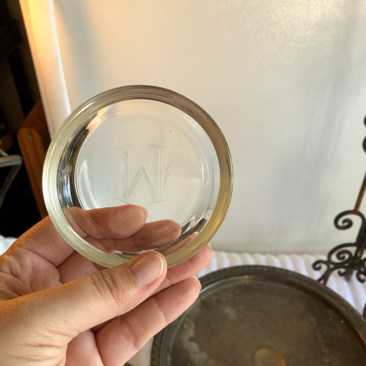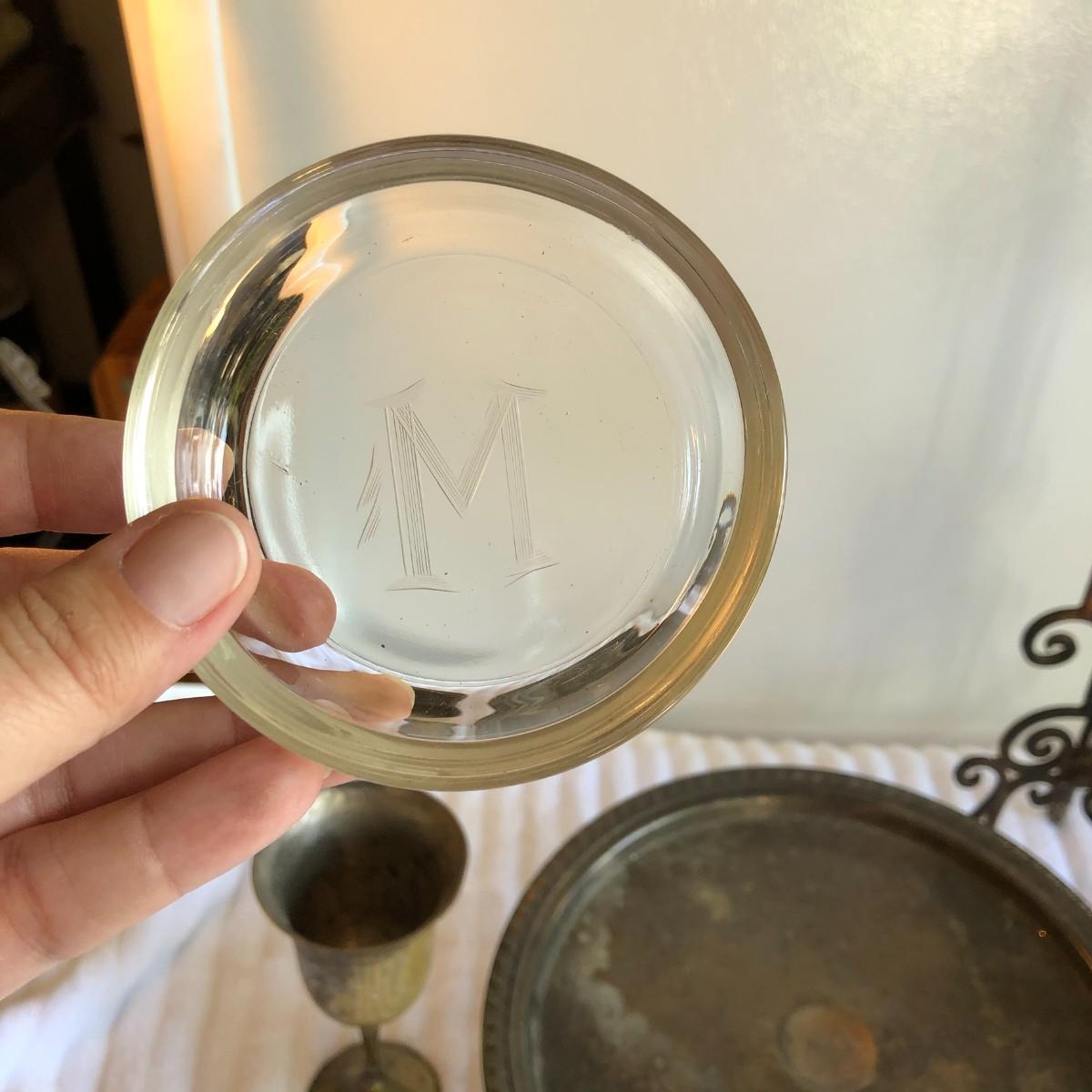 The glass coasters have an engraved "M" or "W" (depending on which way you turn them) on each and are in great condition. The metal candle stand is about 28" tall.