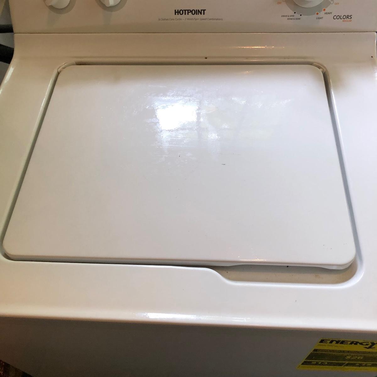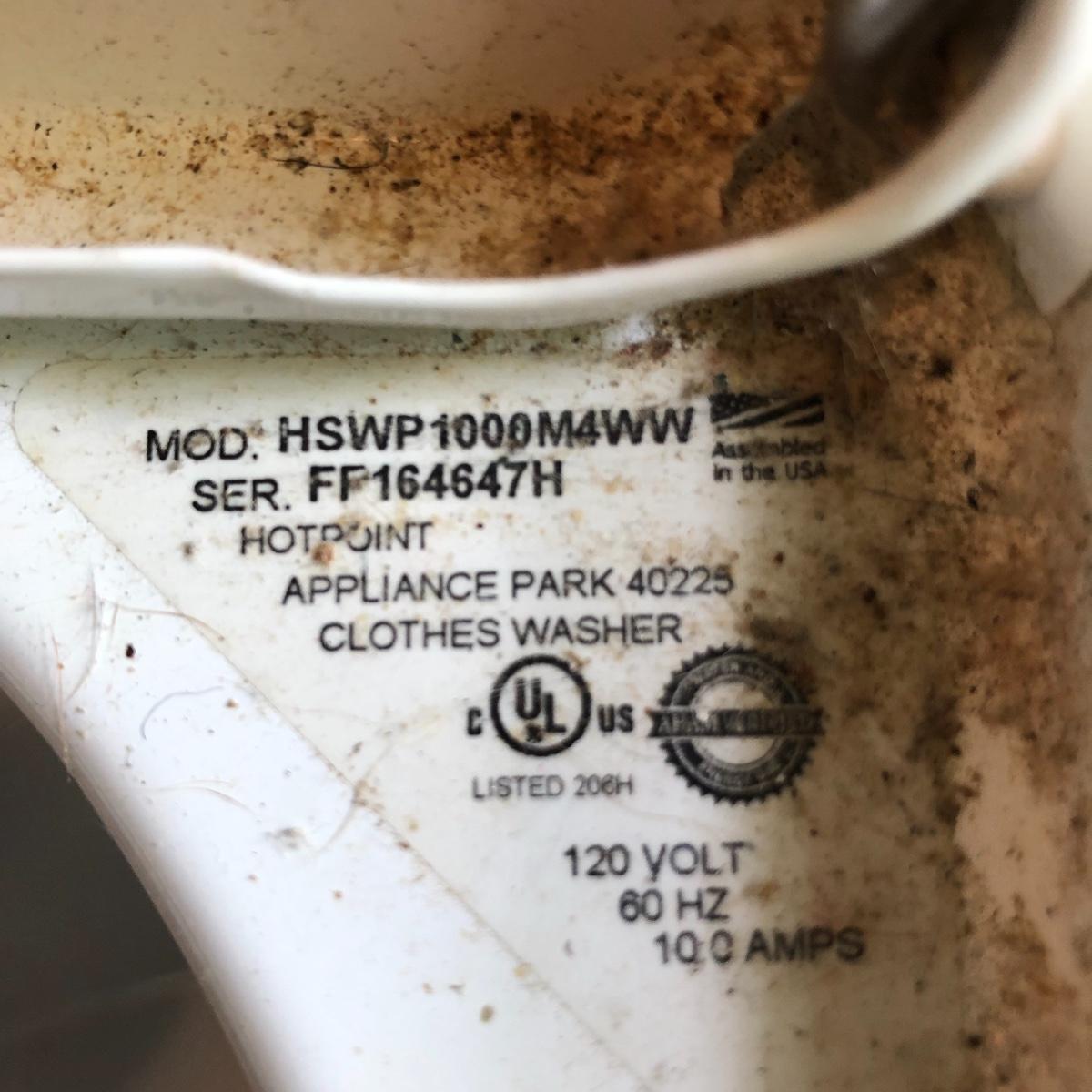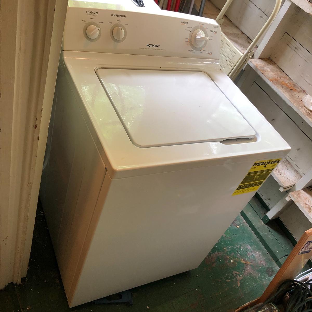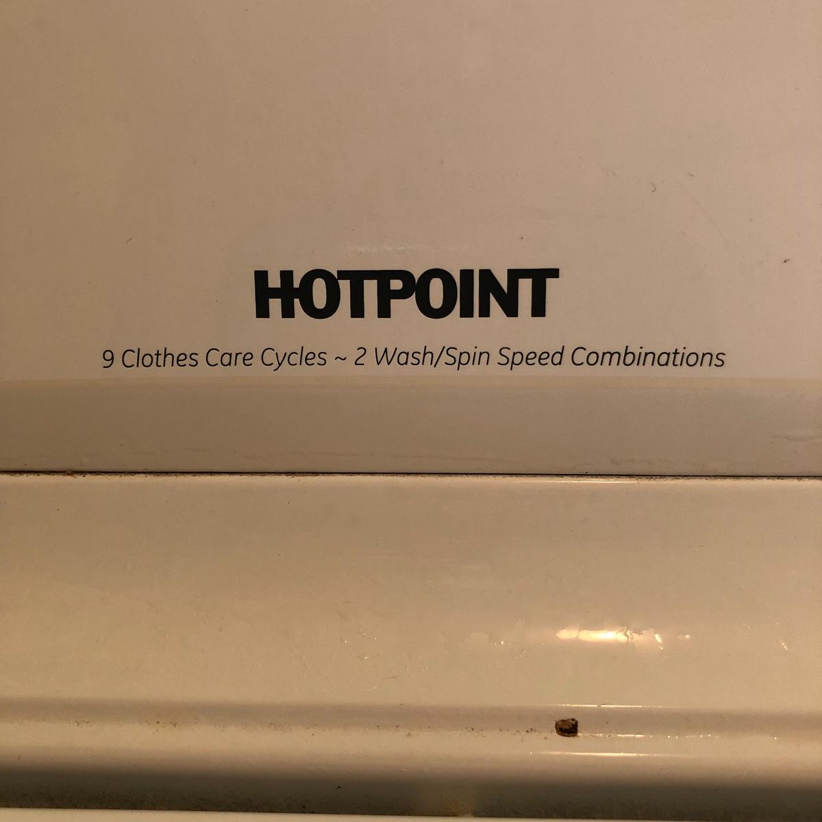 This Hotpoint washing machine is a top load and we have been told by the estate owner that it works. It does need a good wipe down but otherwise the drum and the rest of the machine looks to be in good shape. Model information is in an image.