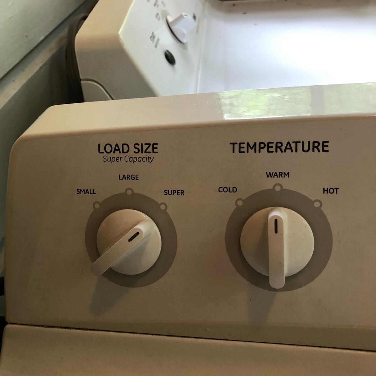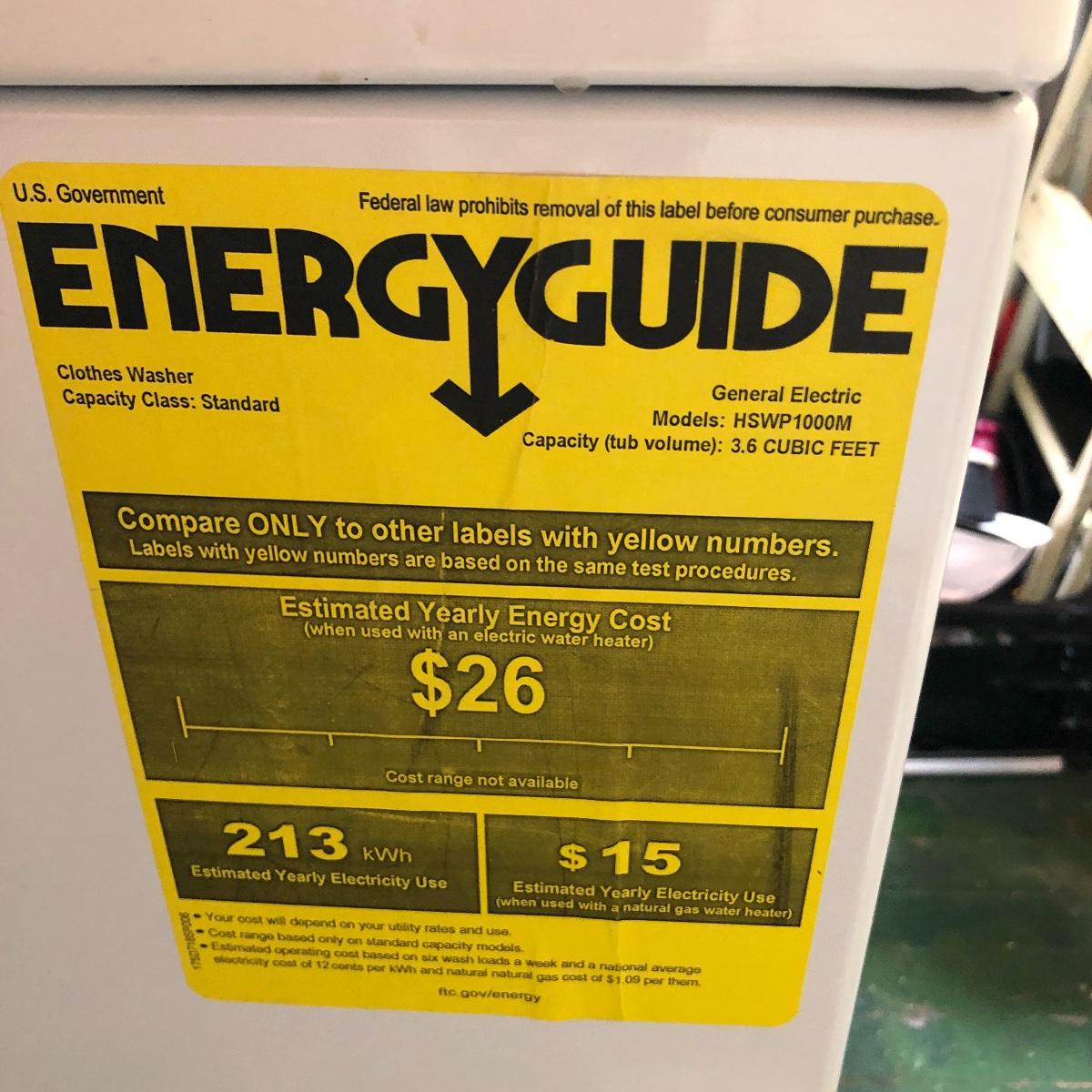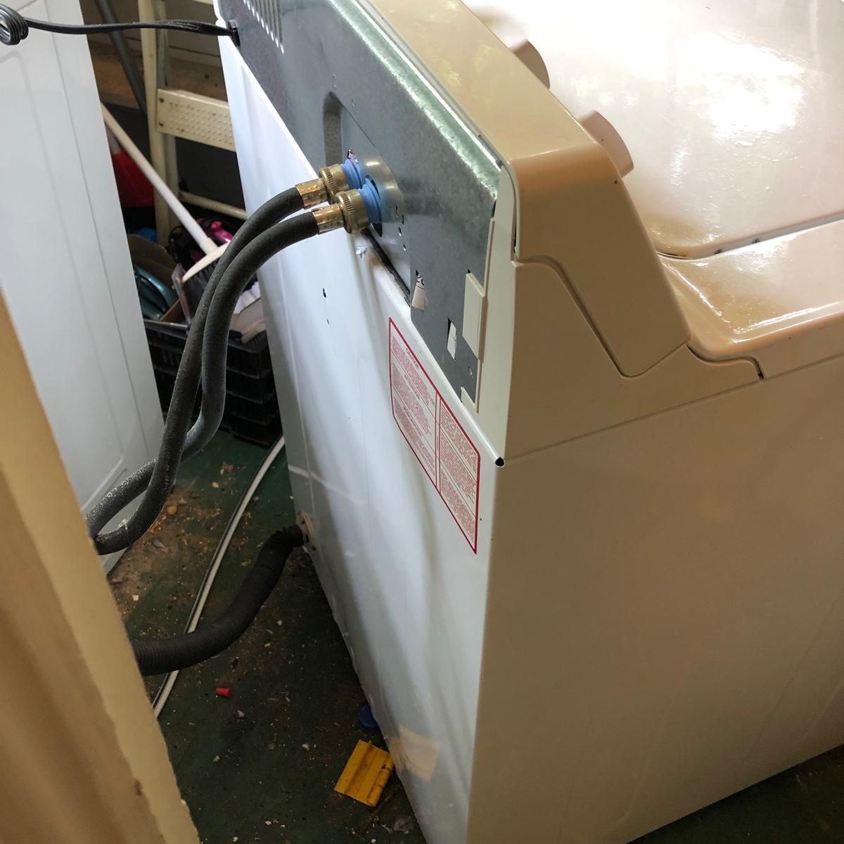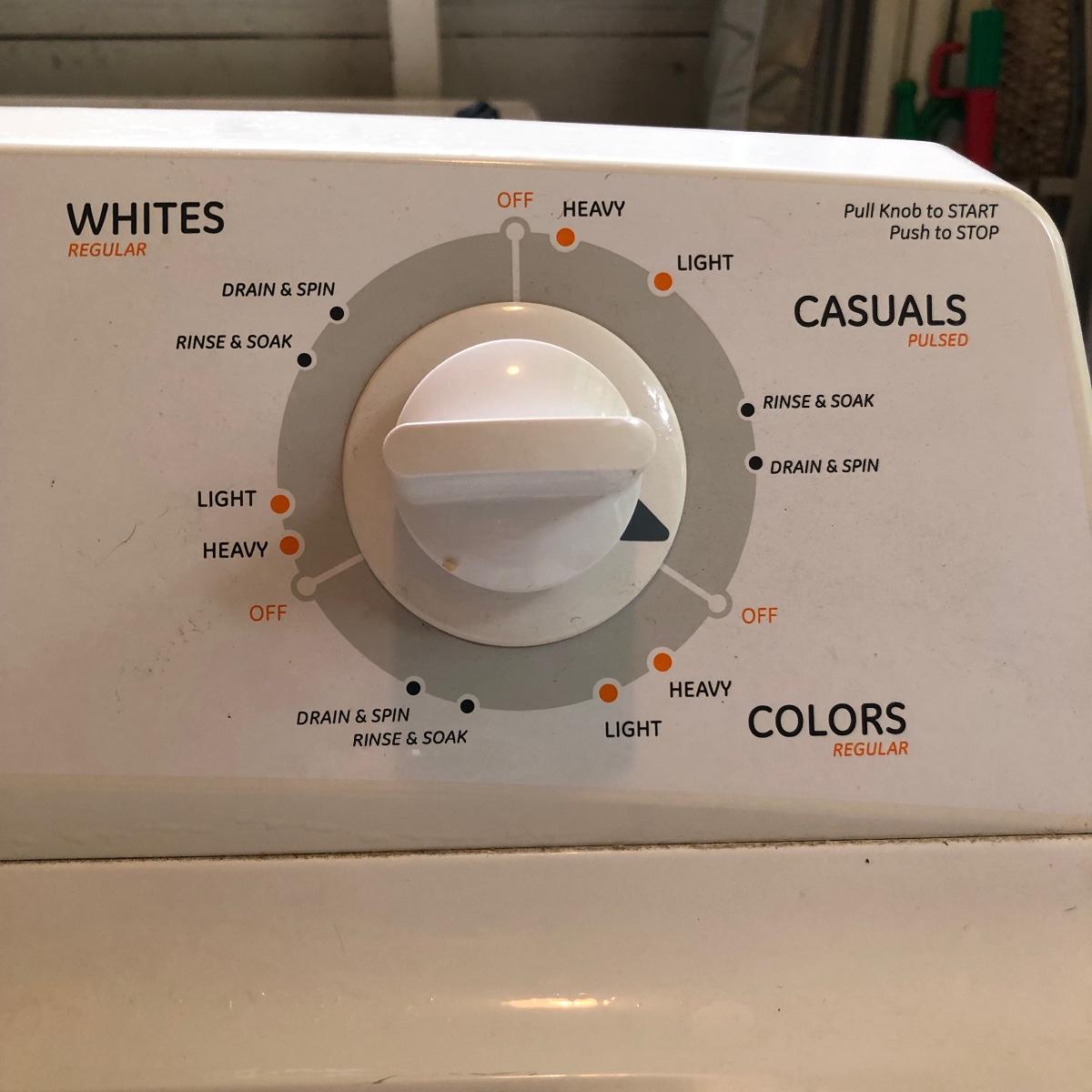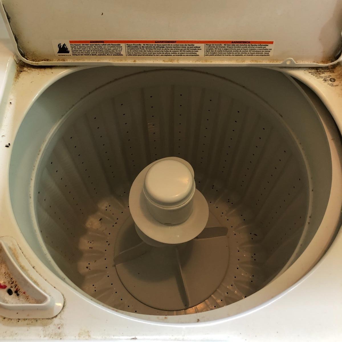 This Hotpoint washing machine is a top load and we have been told by the estate owner that it works. It does need a good wipe down but otherwise the drum and the rest of the machine looks to be in good shape. Model information is in an image.