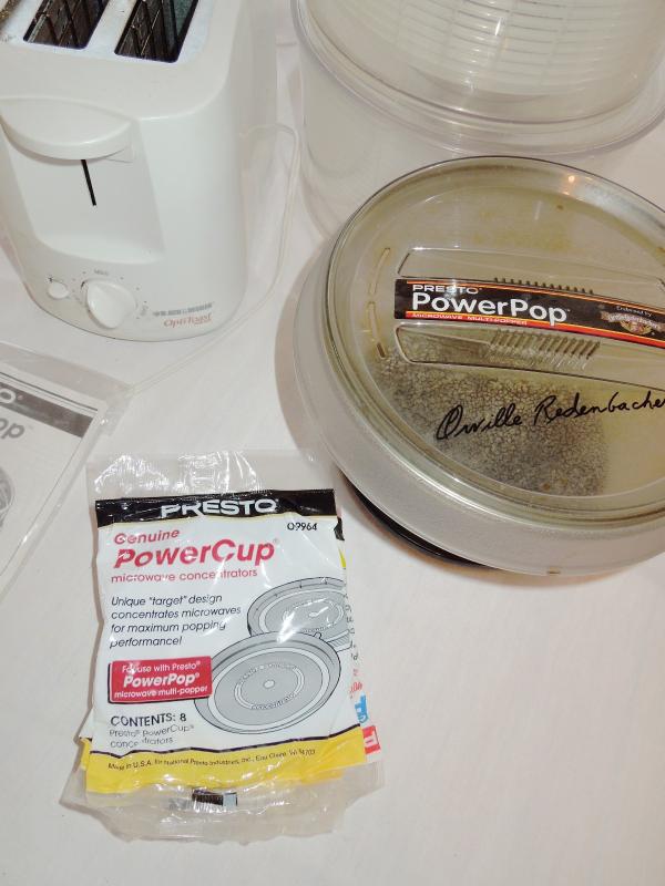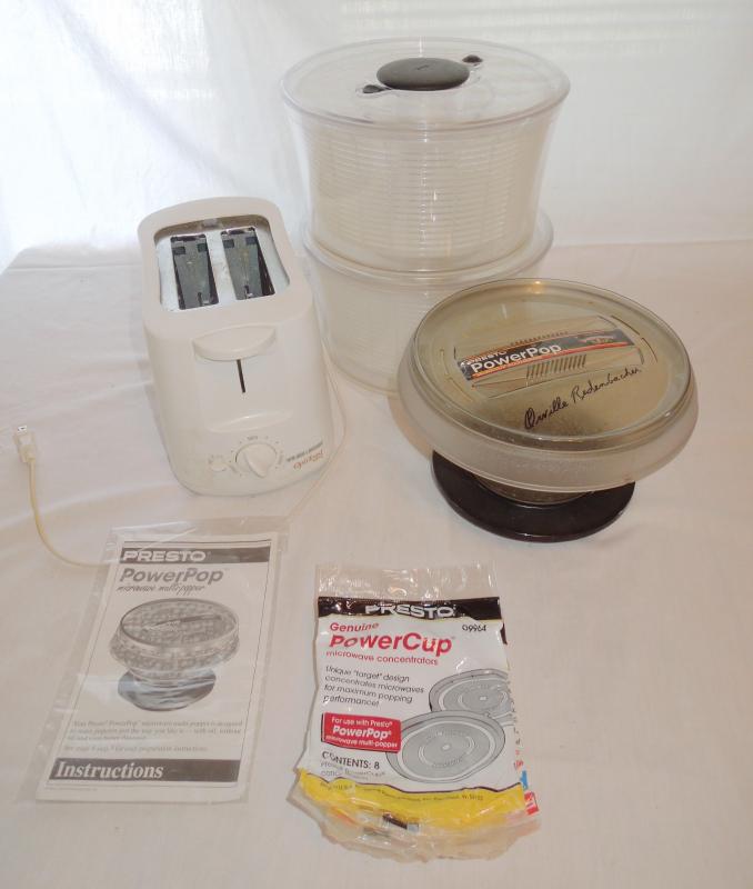 2 Large Oxo Salad Spinners; 1 Orville Redenbacher Microwave Popper with Manual and 16 Power Cups; 1 Black & Decker Opti Toaster (needs cleaning).