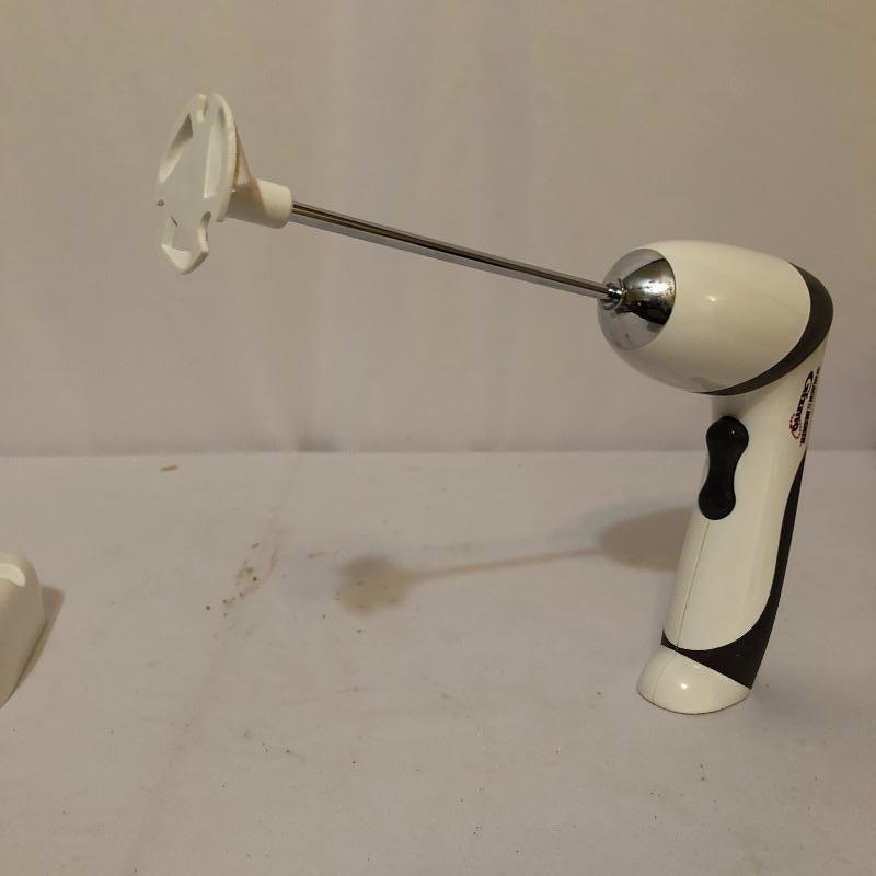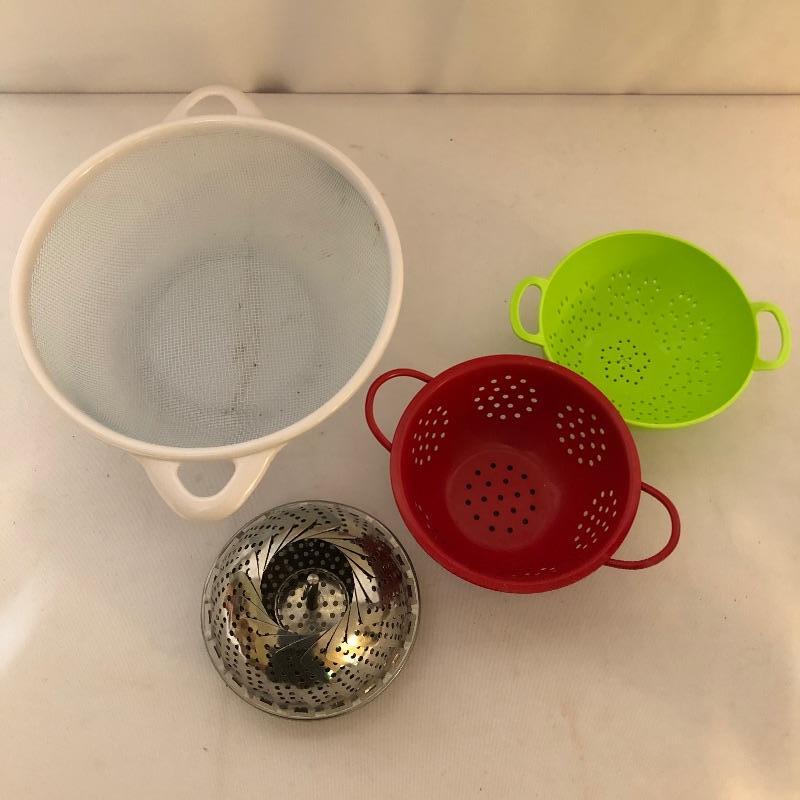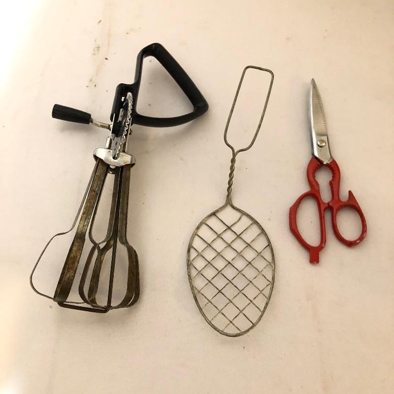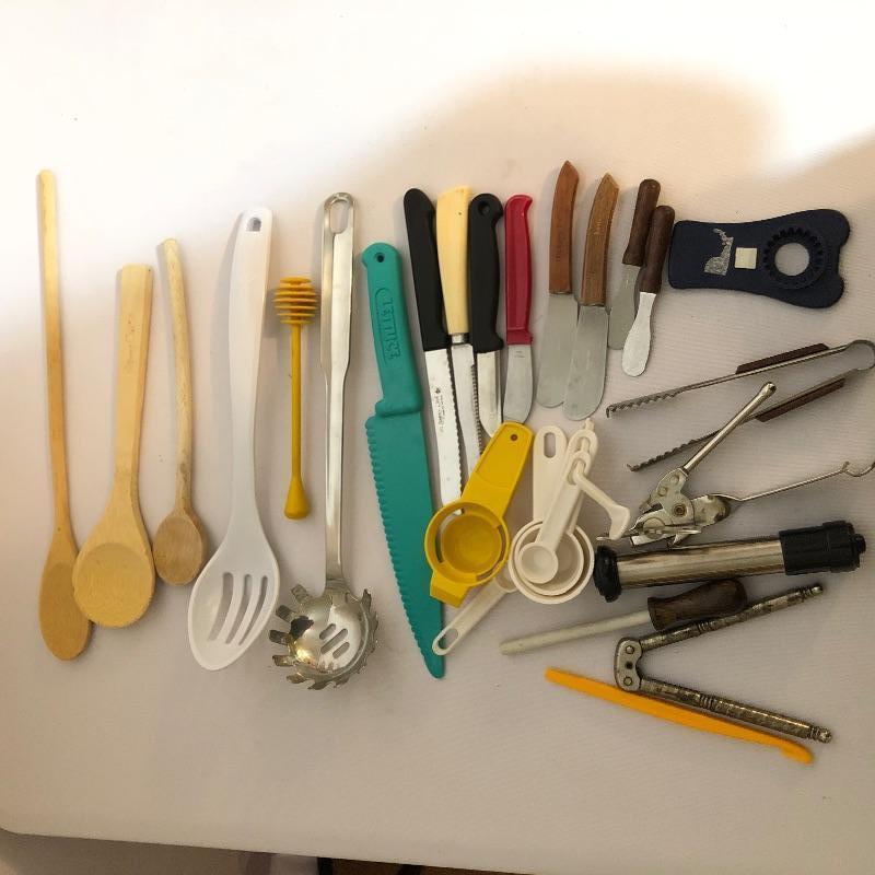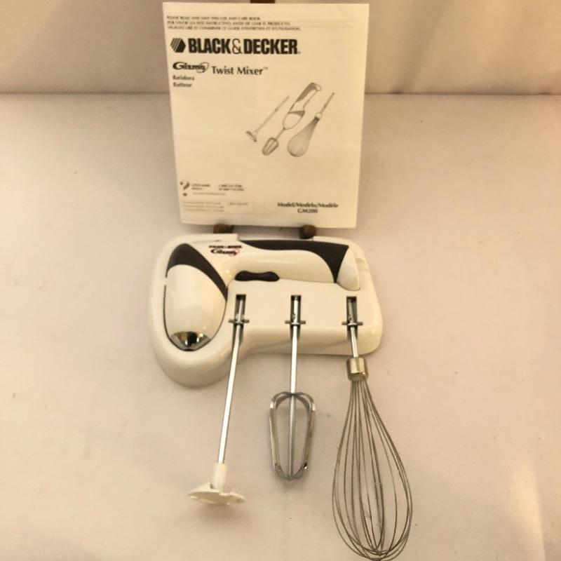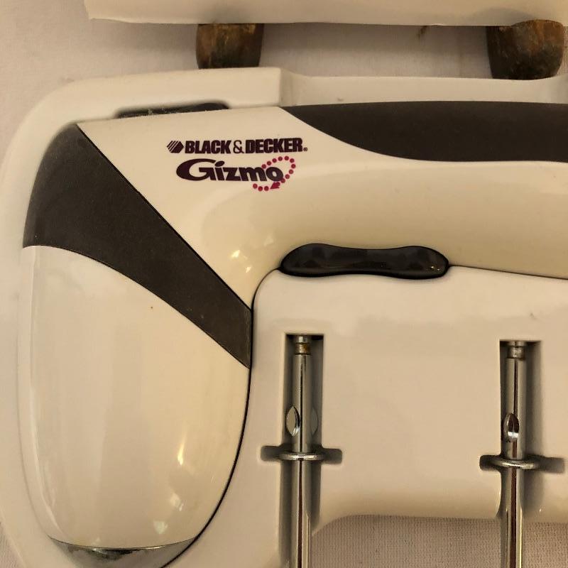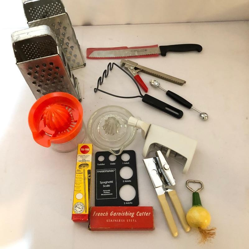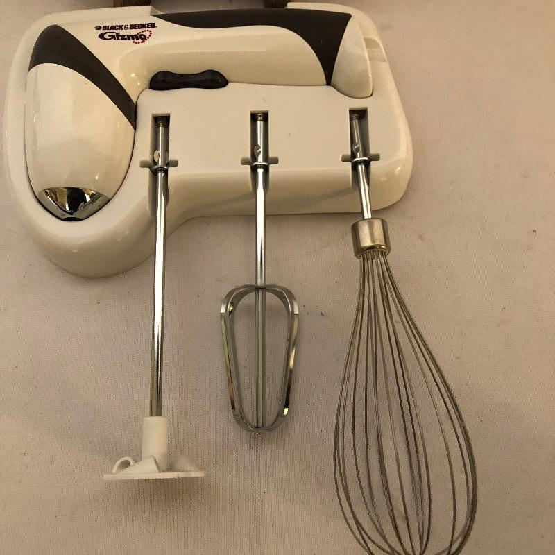 Large lot of kitchen necessities and more here. The Gizmo mixer is missing it’s A/C charger, which can be found for sale and online, however it does work and it’s a handy gadget that comes with a wall mount and three mixer attachments. Also included are a set of Towle knives new in box, chopping boards, colanders, cheese graters, knives and much more. See images.