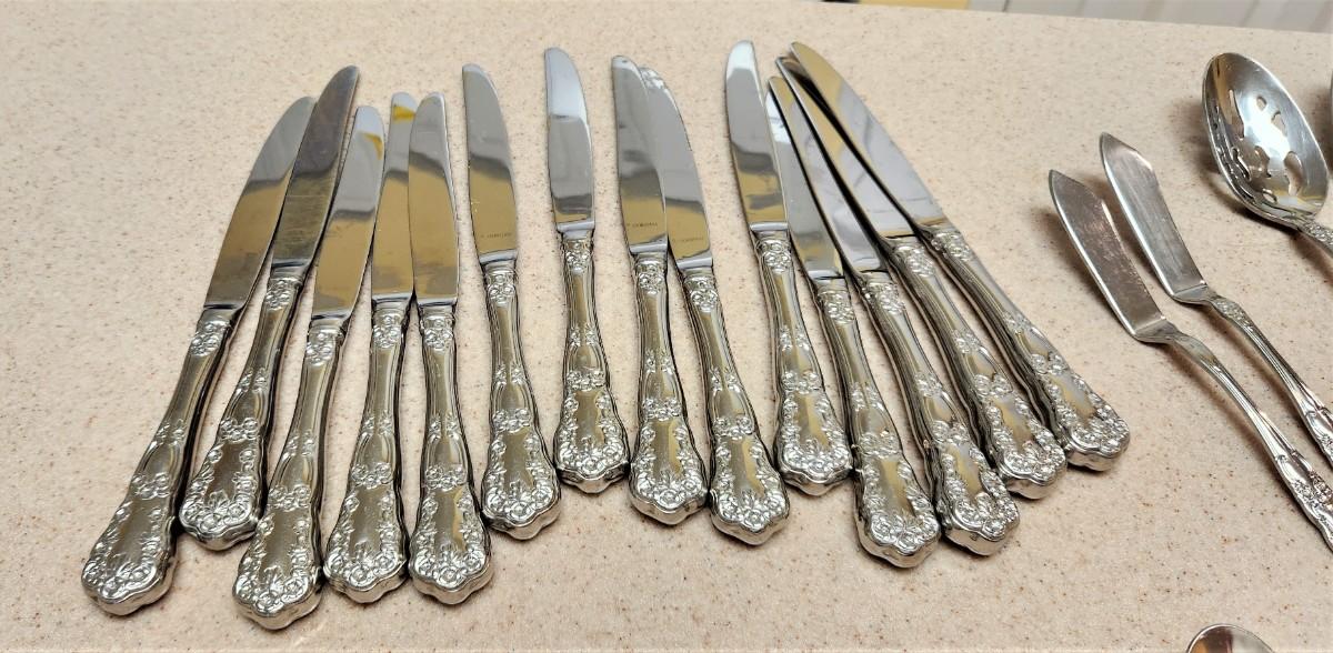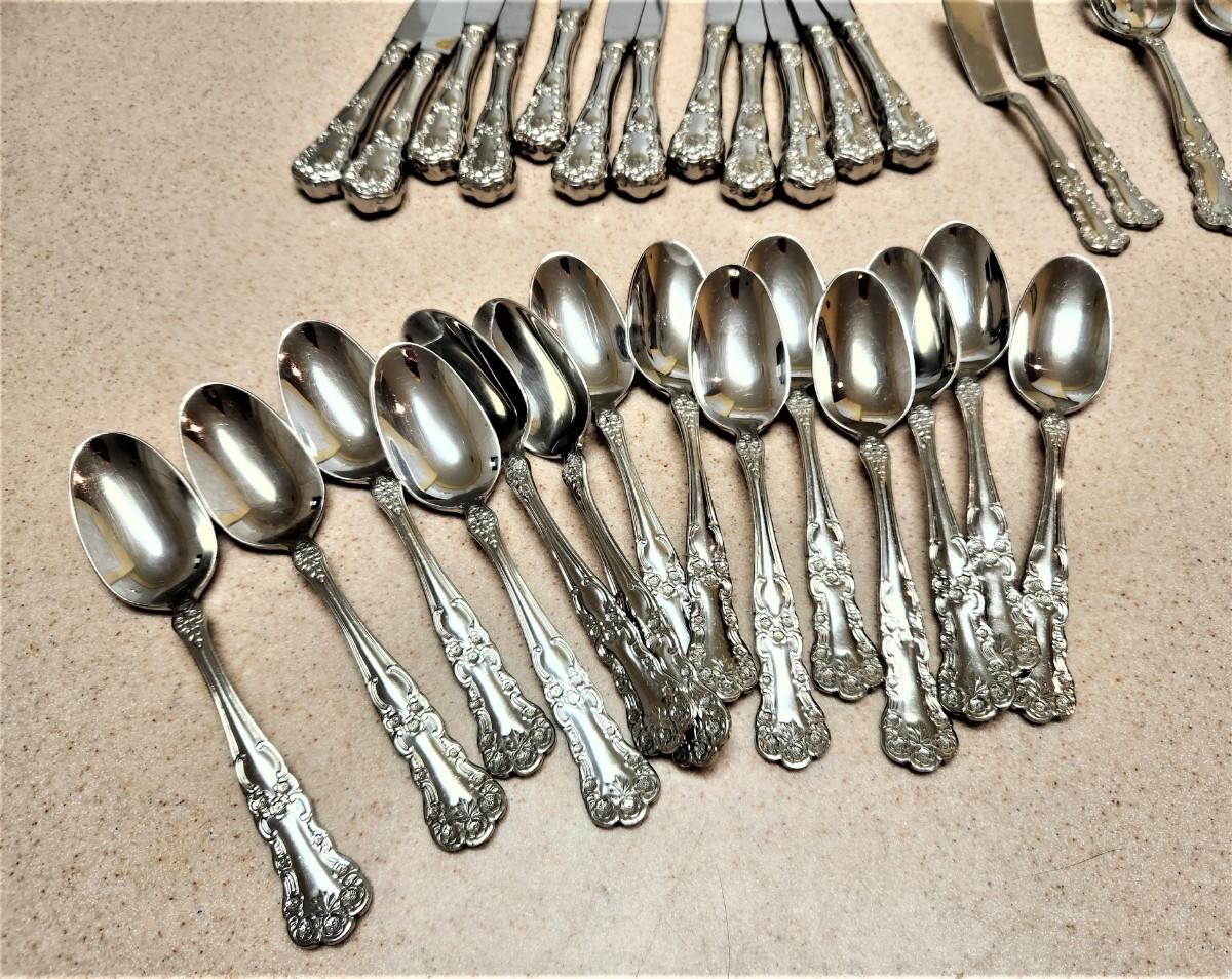 Gorham 18/10 Stainless flatware - you get all you see here: 14 Tablespoons, 14 Tea spoons, 14 dinner forks, 14 luncheon forks, 2 sugar spoons, 2 spreaders, 12 knives, 1 pierced serving spoon, 1 regular serving spoon. Good used condition.