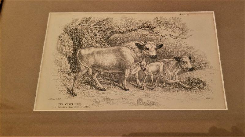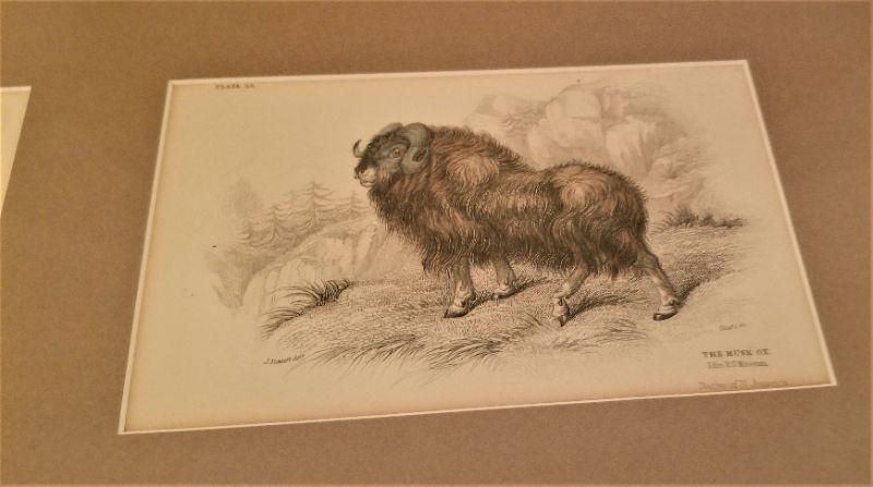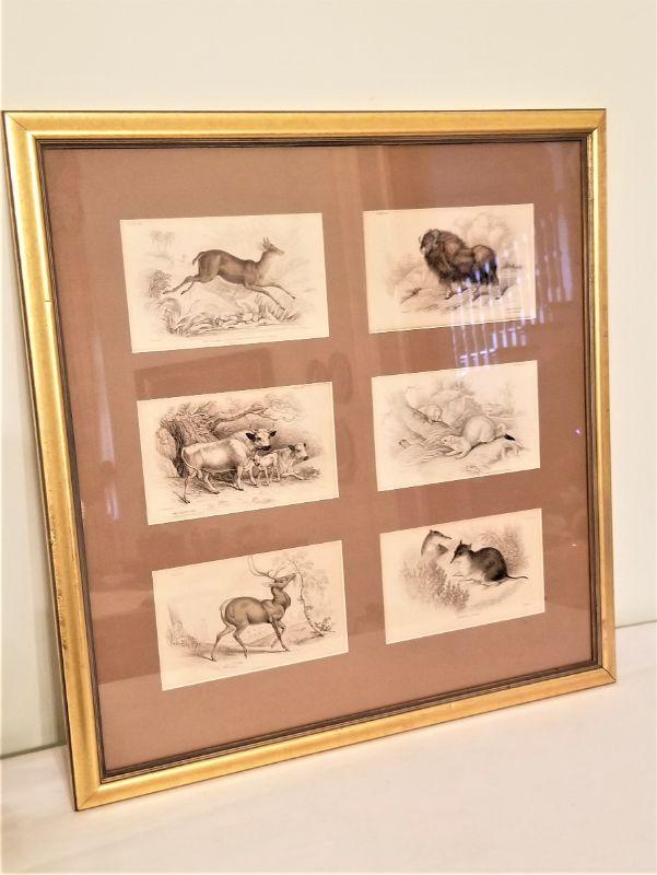 These would look great in a traditional OR a more modern setting. 6 antique (19th century English) engravings professionally framed in one grouping - all in excellent condition. Included are the Wapiti, White Urus, Musk Ox, 4 horned antelope, Ermine in winter and Perameles Obesula (short nosed bandicoot - native of Australia). 2 are colorized. Each measures 6.25" x 4" - entire framed piece is 20" x 21" in a gold frame. You'll love it!