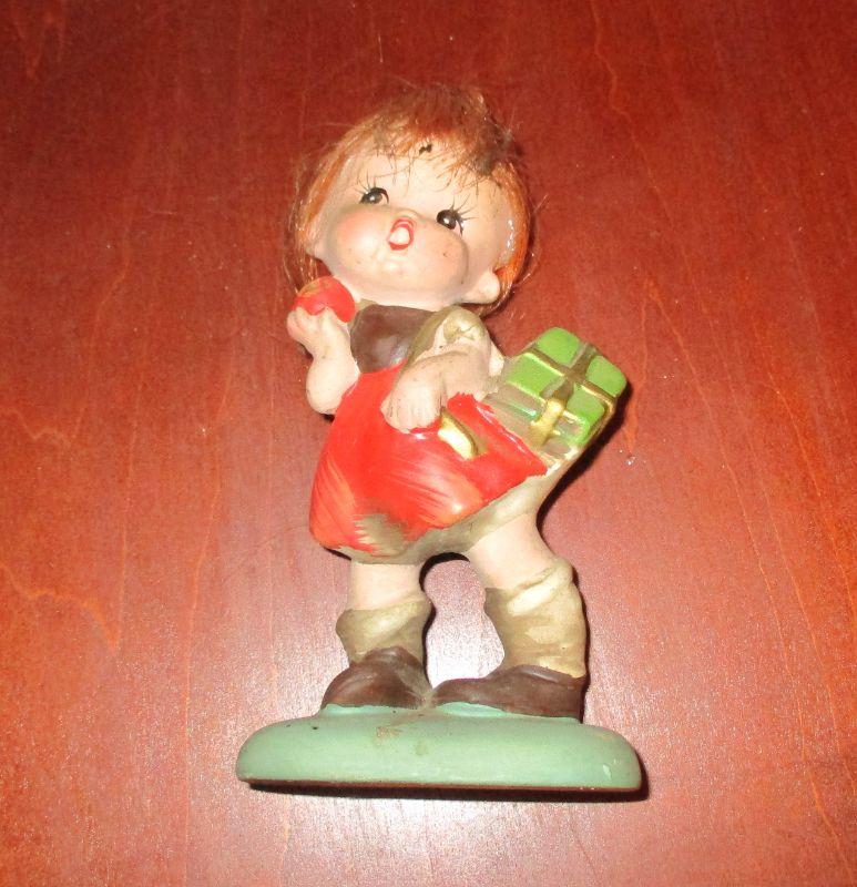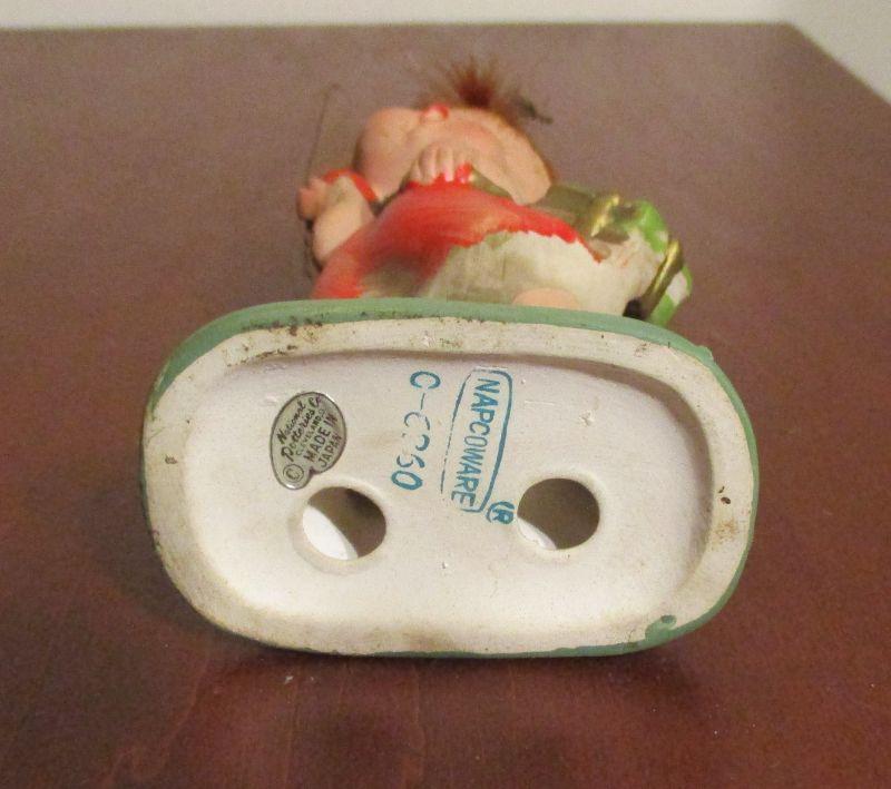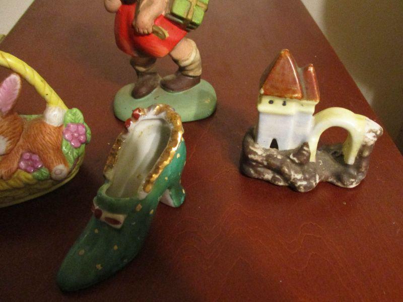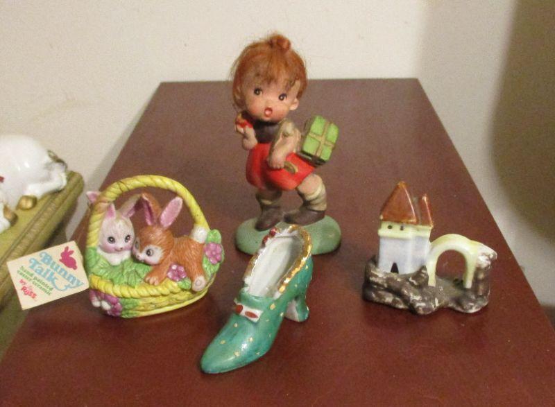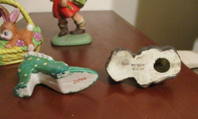 The shoe and the house are both Made in Japan. The little girl is Napcoware C-6860, and the bunnies are by Russ Berrie. The little girl has a busy day at school and is ready to hit the bathtub, but check out her hair - it's hair as opposed to ceramic!