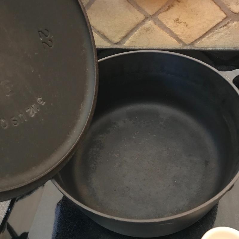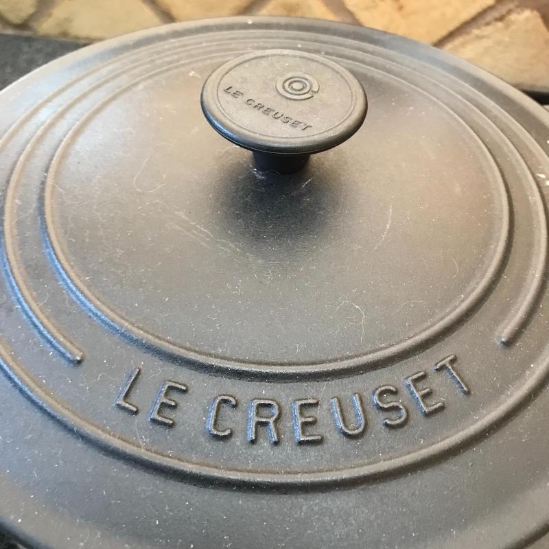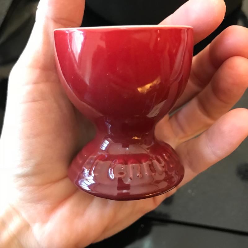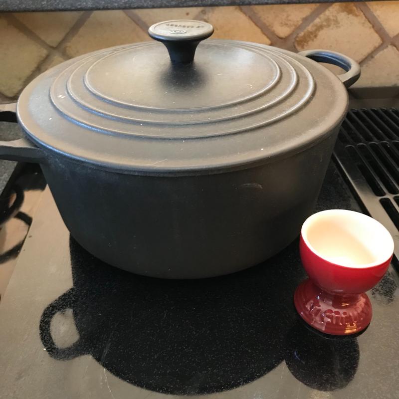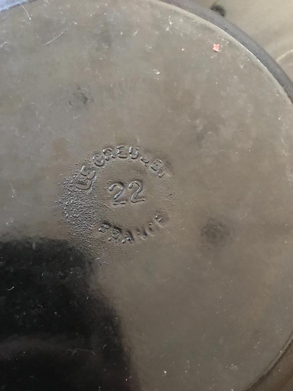 Le Creuset pot with lid. Marking on bottom reads “22.” Lot also includes red Le Creuset egg cup. No shipping available. Local pickup only in Asheville, NC.