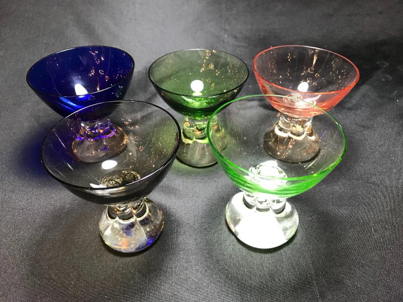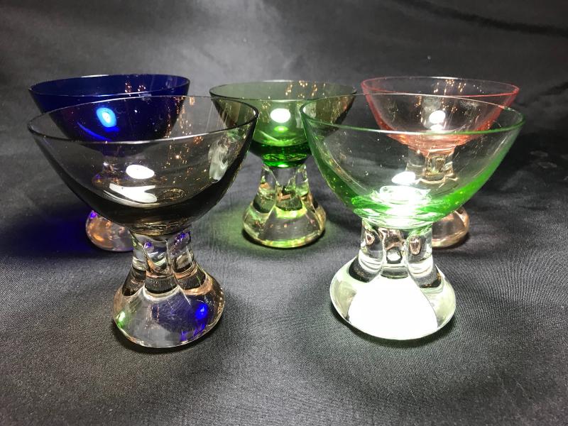 Very nice hand blown set of five handblown cocktail glasses from Portugal. In harlequin, or mixed colors. Vintage 1950's. 3" D x 3 1/2" H