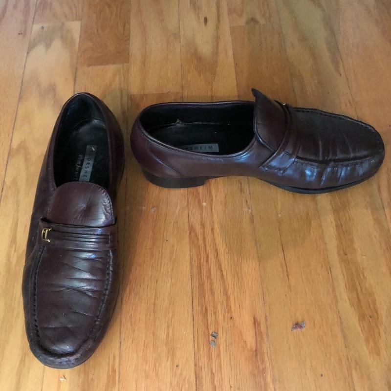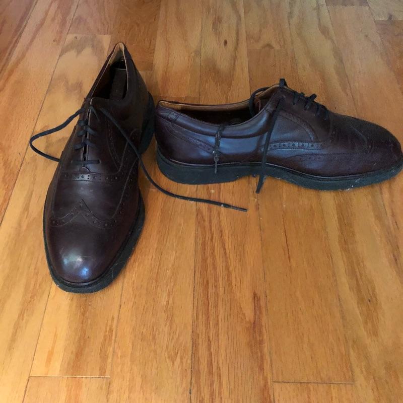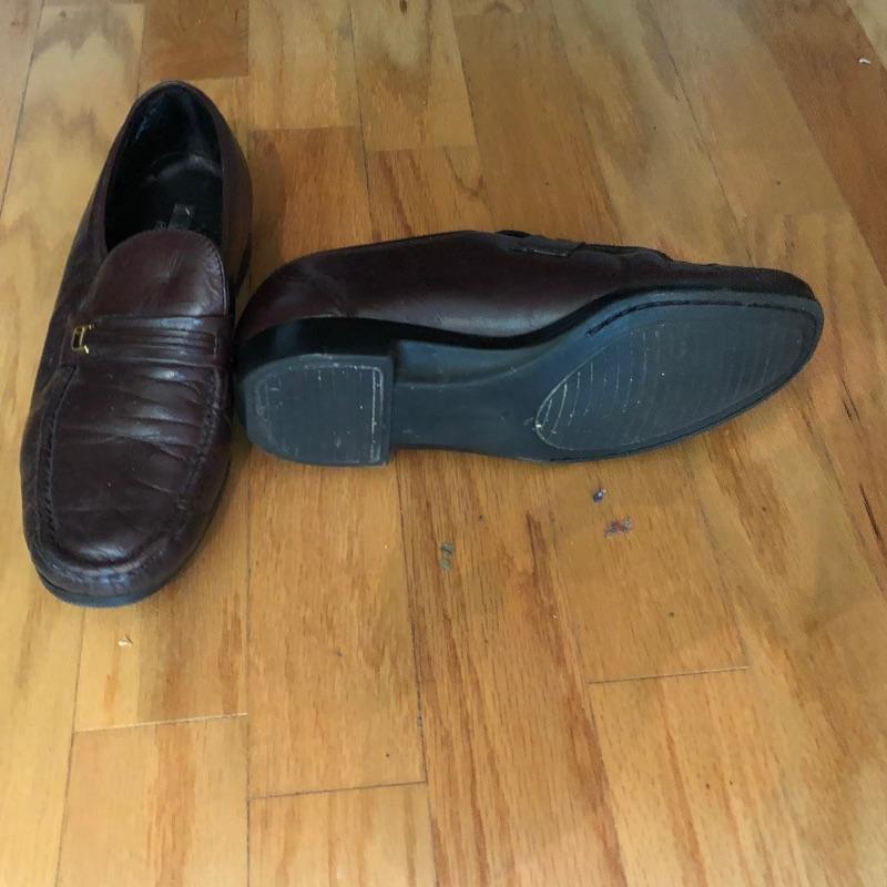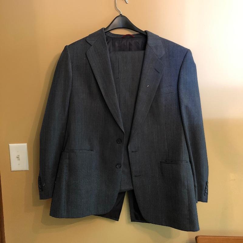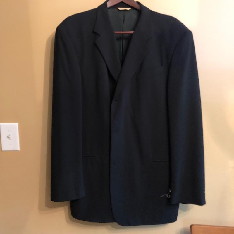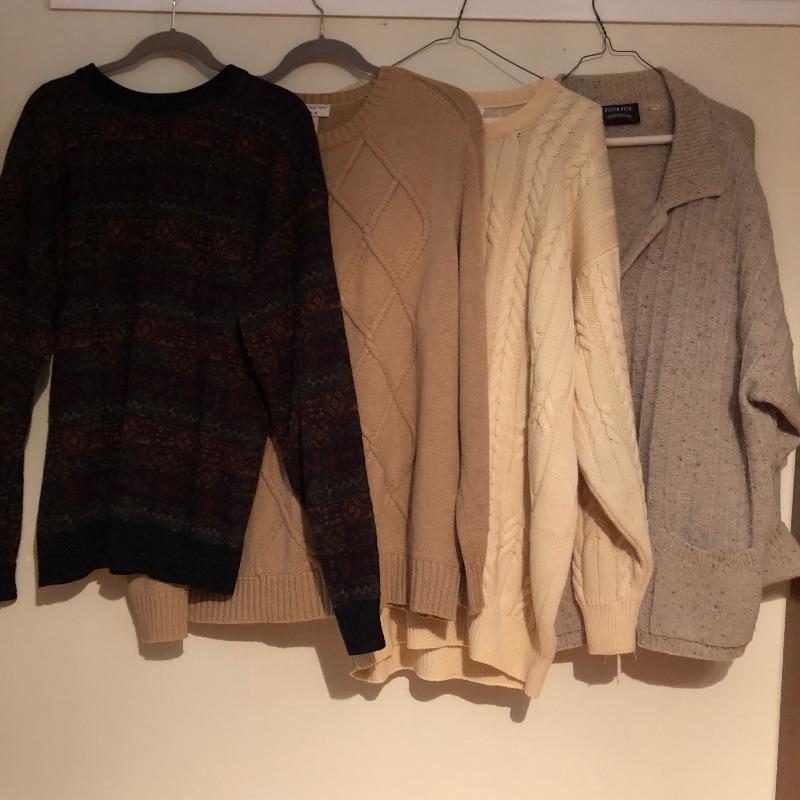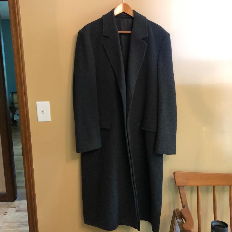 The London Fog grey wool coat measures 19” shoulders, 23” chest and 48” long. The Donna Karen suit is made in Italy and the suit coat measures 19” x 23” x 34”. Also included are sweaters and waistcoats in size Large and a total of five pairs of shoes that are size 11, the last pair pictured are Made in Portugal, other brands include Rockport and Florsheim. The Broner hat is extra large.